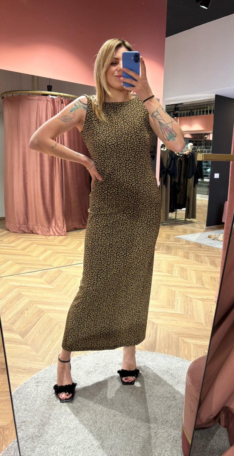 Davanti è essenziale, quasi minimale. Dietro sorprende, con una scollatura profonda sulla schiena che aggiunge femminilità e sensualità misurata.