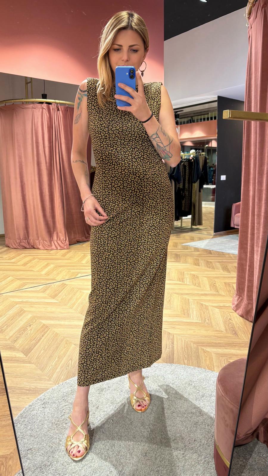 Il jacquard di viscosa fantasia accompagna la silhouette con una vestibilità slim, valorizzando le forme senza costringerle.