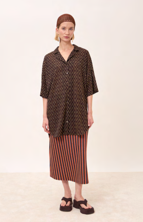 Il tessuto jacquard leggero con lavorazione a motivo chevron e fili dorati crea un effetto luminoso ma raffinato, perfetto sia di giorno con un denim che la sera sopra un pantalone nero o una gonna satin.