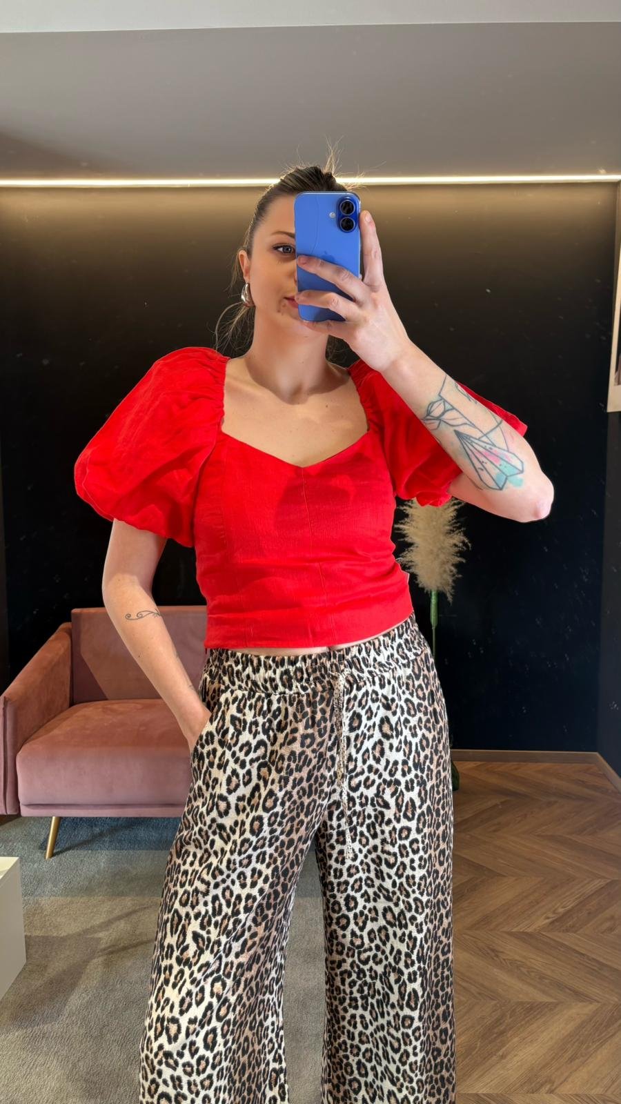Lo scollo sagomato valorizza delicatamente il décolleté, mentre le maniche corte leggermente ampie creano equilibrio e movimento. La linea pulita e strutturata lo rende perfetto sia con lo short coordinato per un outfit fresco e dinamico, sia con il pantalone palazzo per un completo raffinato e d’impatto.