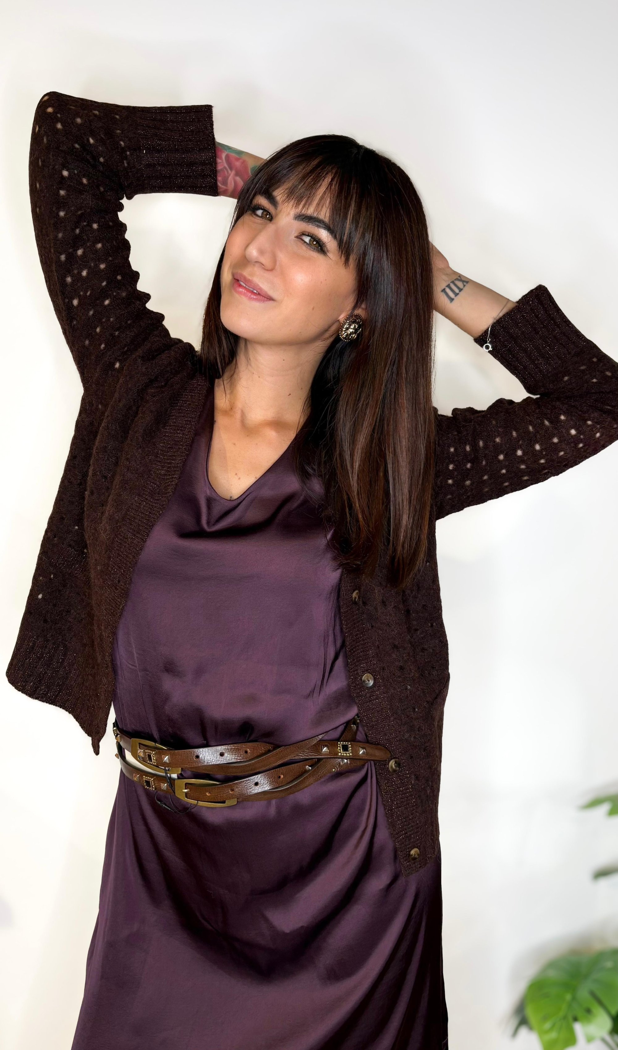 Questo abito lungo in viscosa effetto seta scivola delicato sul corpo creando una linea morbida e fluida. Il colore vinaccia, intenso e raffinato, valorizza l’incarnato e dona subito un’allure sofisticata.