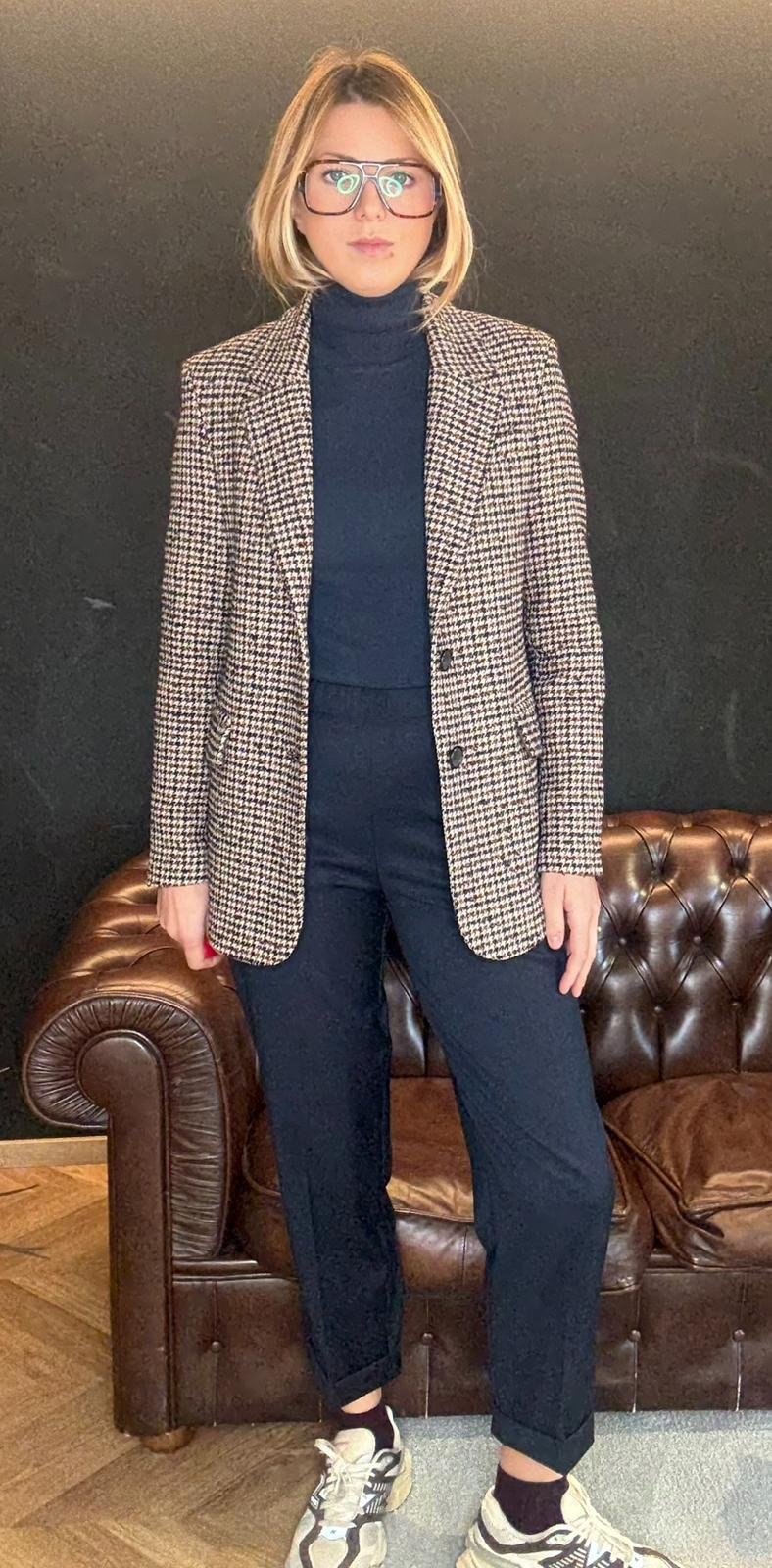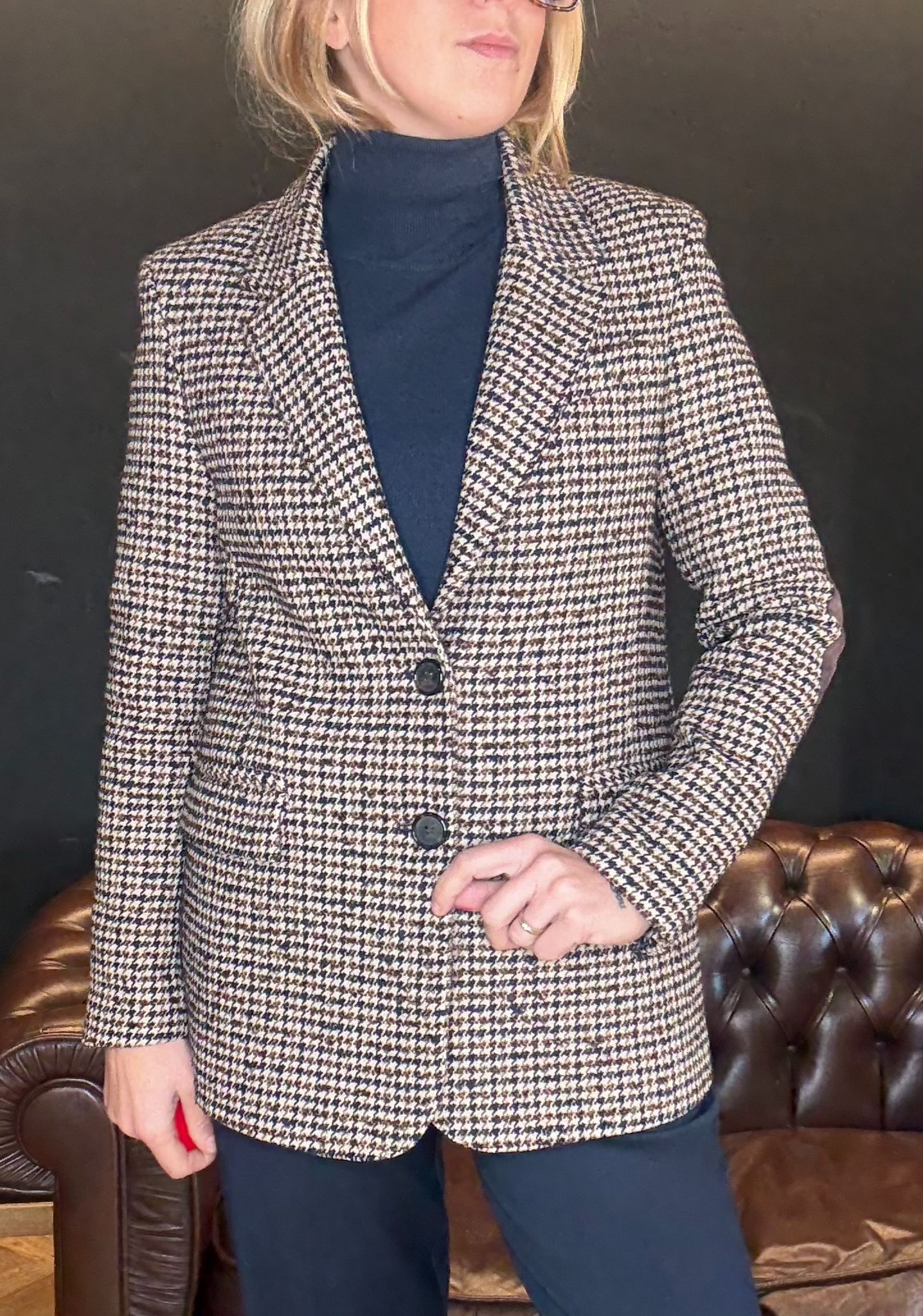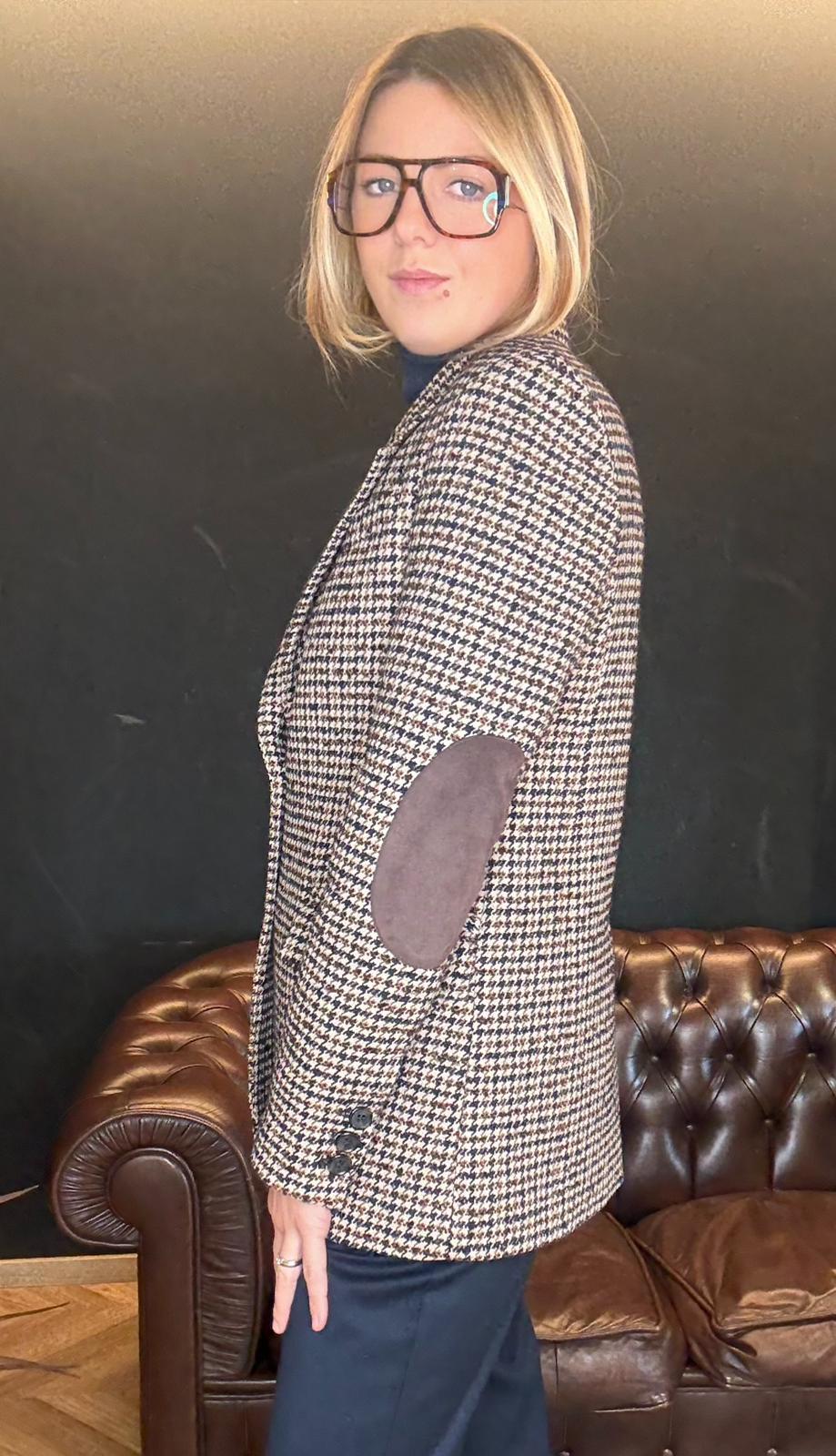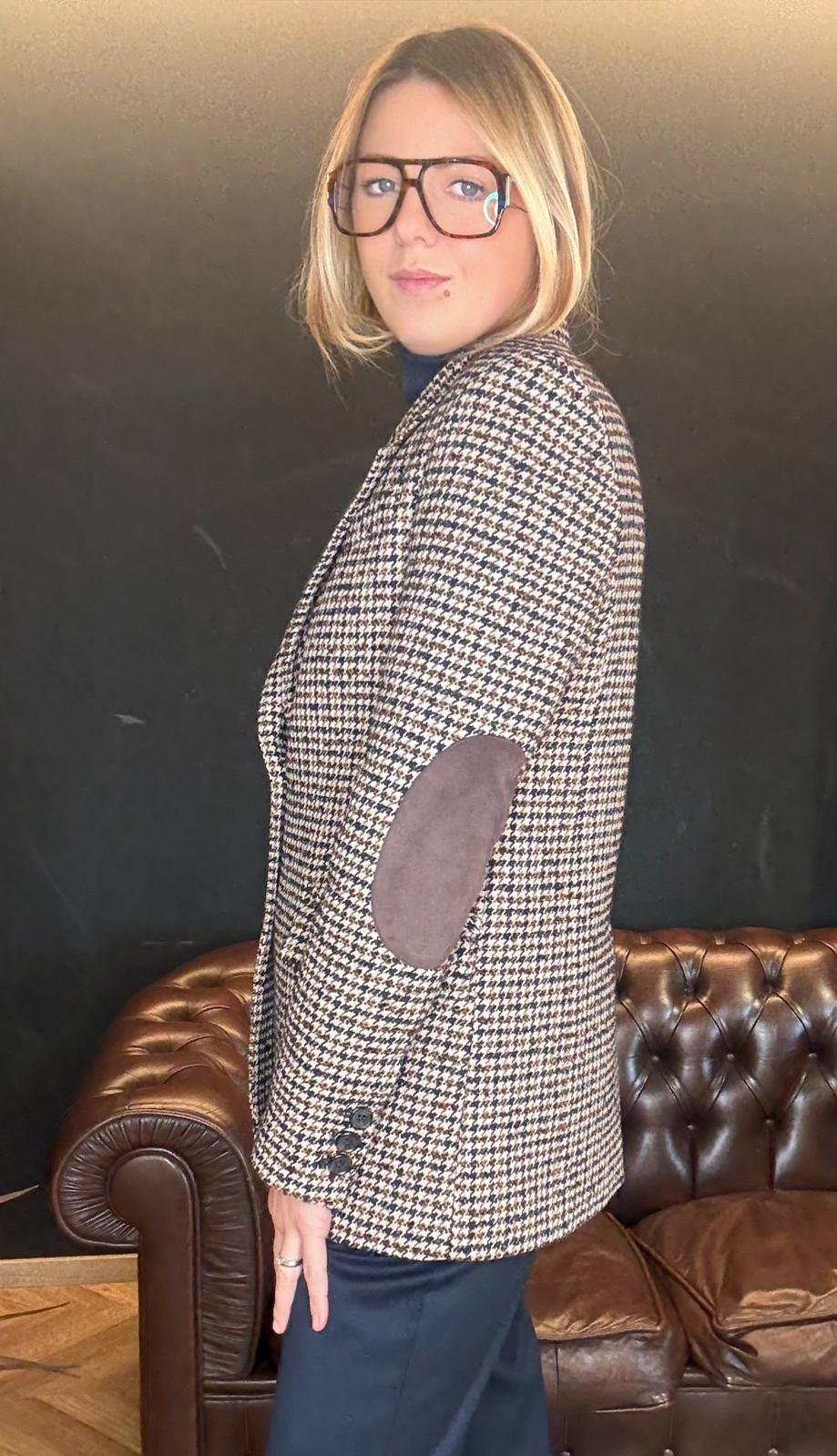 La fantasia pied-de-poule, intramontabile e raffinata, viene riletta in chiave moderna attraverso una linea morbida ma strutturata, capace di valorizzare la silhouette senza costringerla. Le toppe in contrasto sui gomiti aggiungono personalità e un tocco dal sapore retrò-parigino, rendendo questo capo unico e riconoscibile.