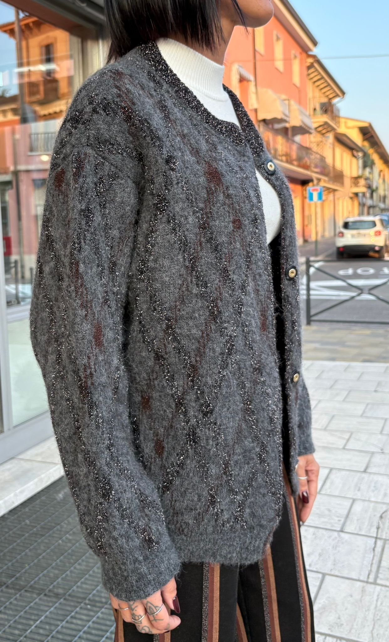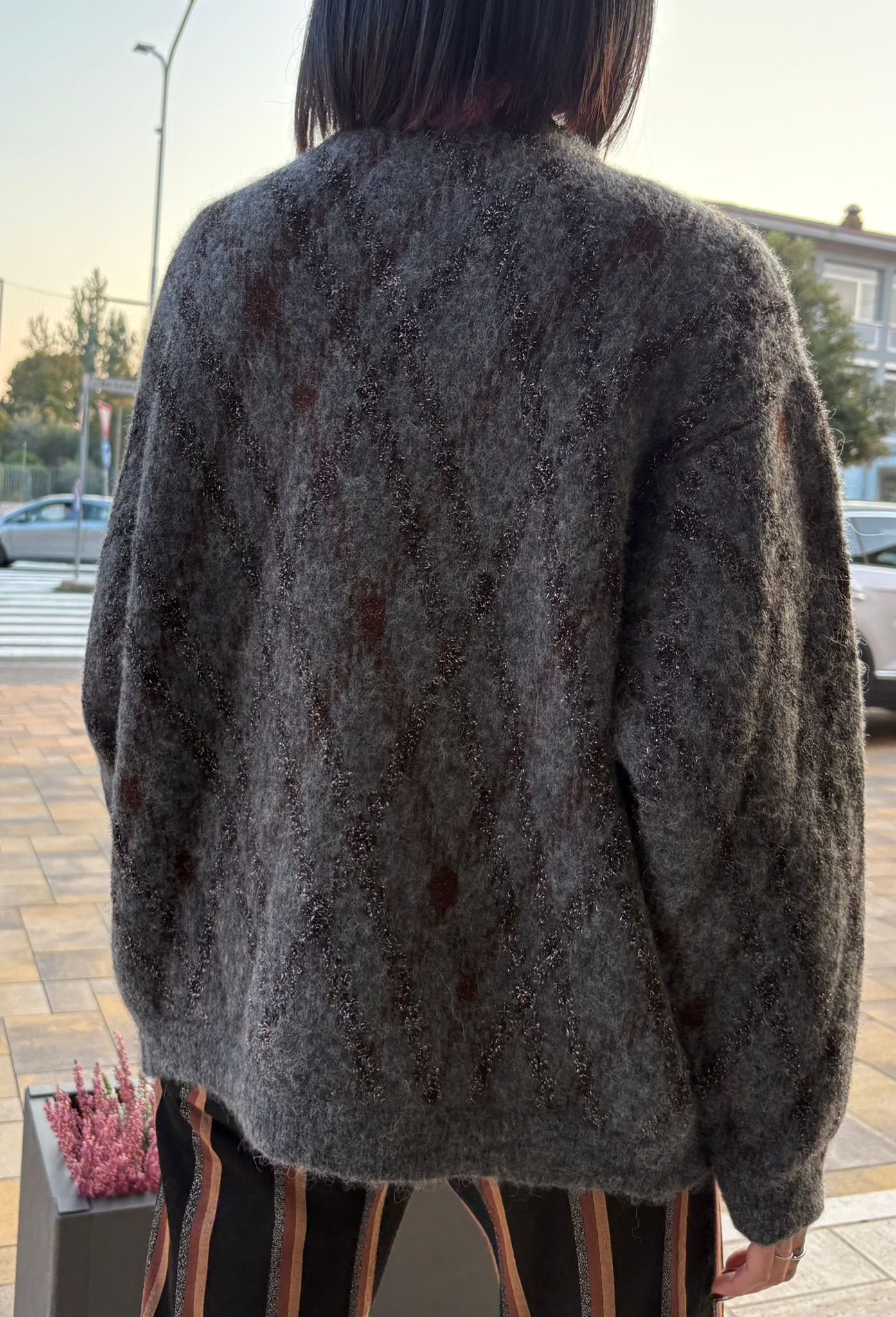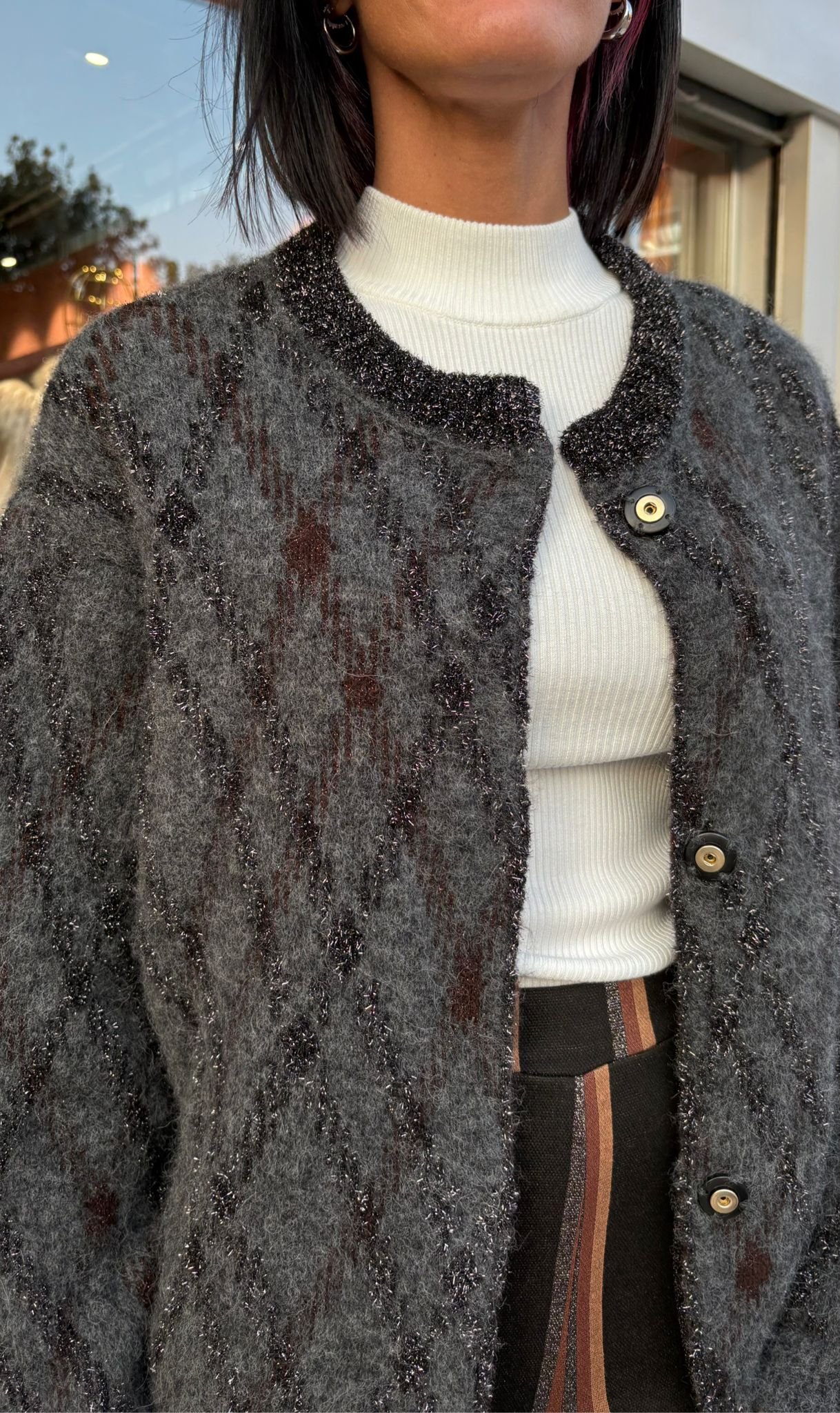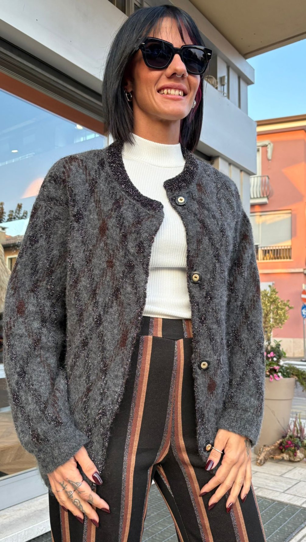Una giacca in maglia lavorata jacquard, che intreccia toni morbidi del grigio e del marrone con sottili fili in lurex rame e argento che illuminano la texture con un bagliore discreto e sofisticato.