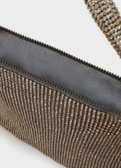 Realizzata in maglia ricamata con micro pietre brillanti, cattura la luce con eleganza senza risultare eccessiva.