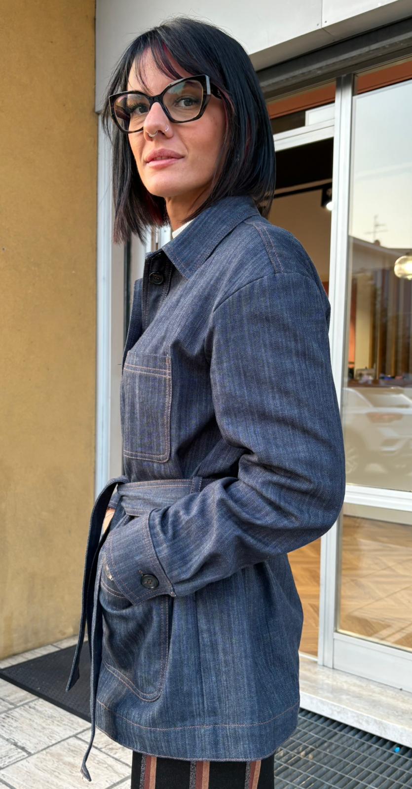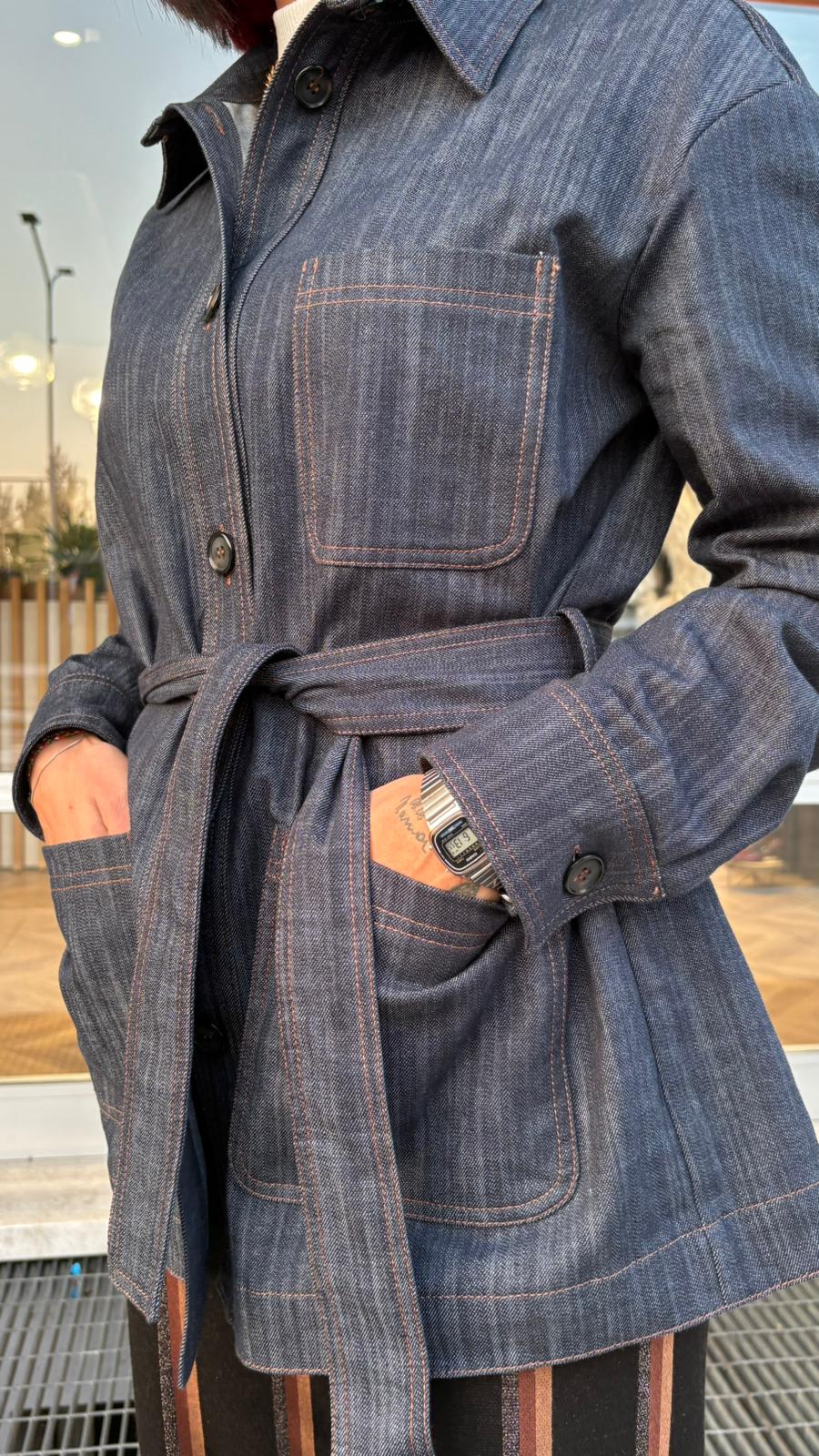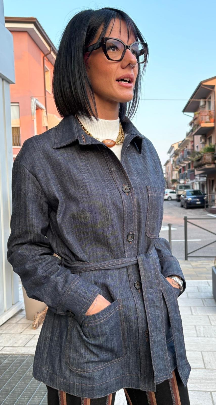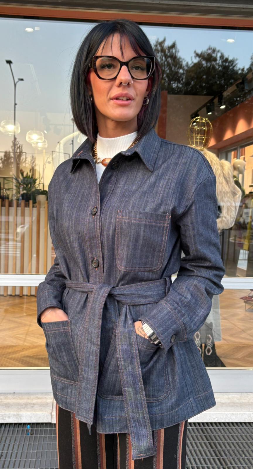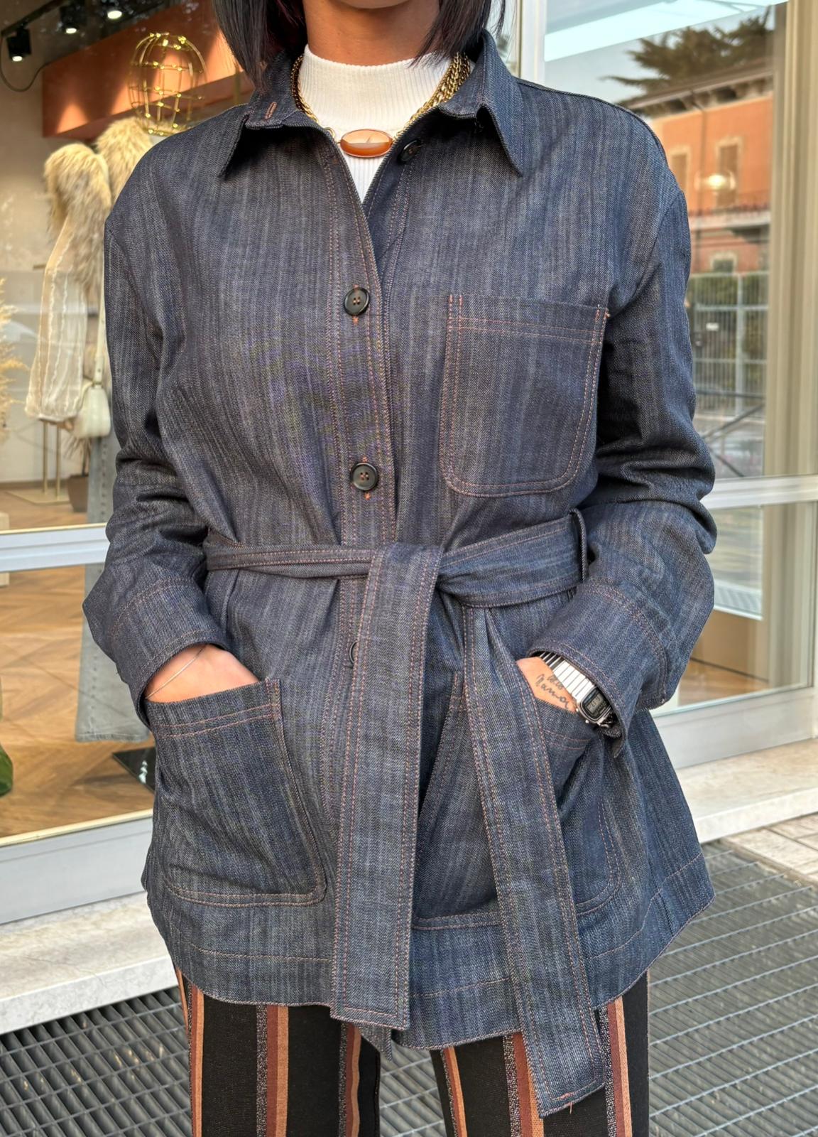 Realizzata in denim fluido elasticizzato, è perfetta da portare aperta come overshirt o chiusa in vita grazie alla cintura coordinata che valorizza la figura senza costringerla.