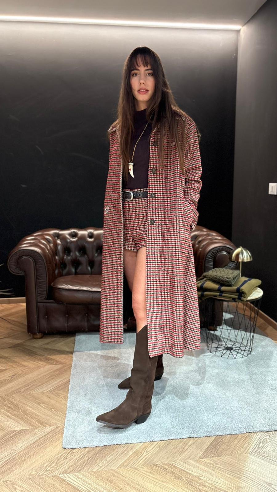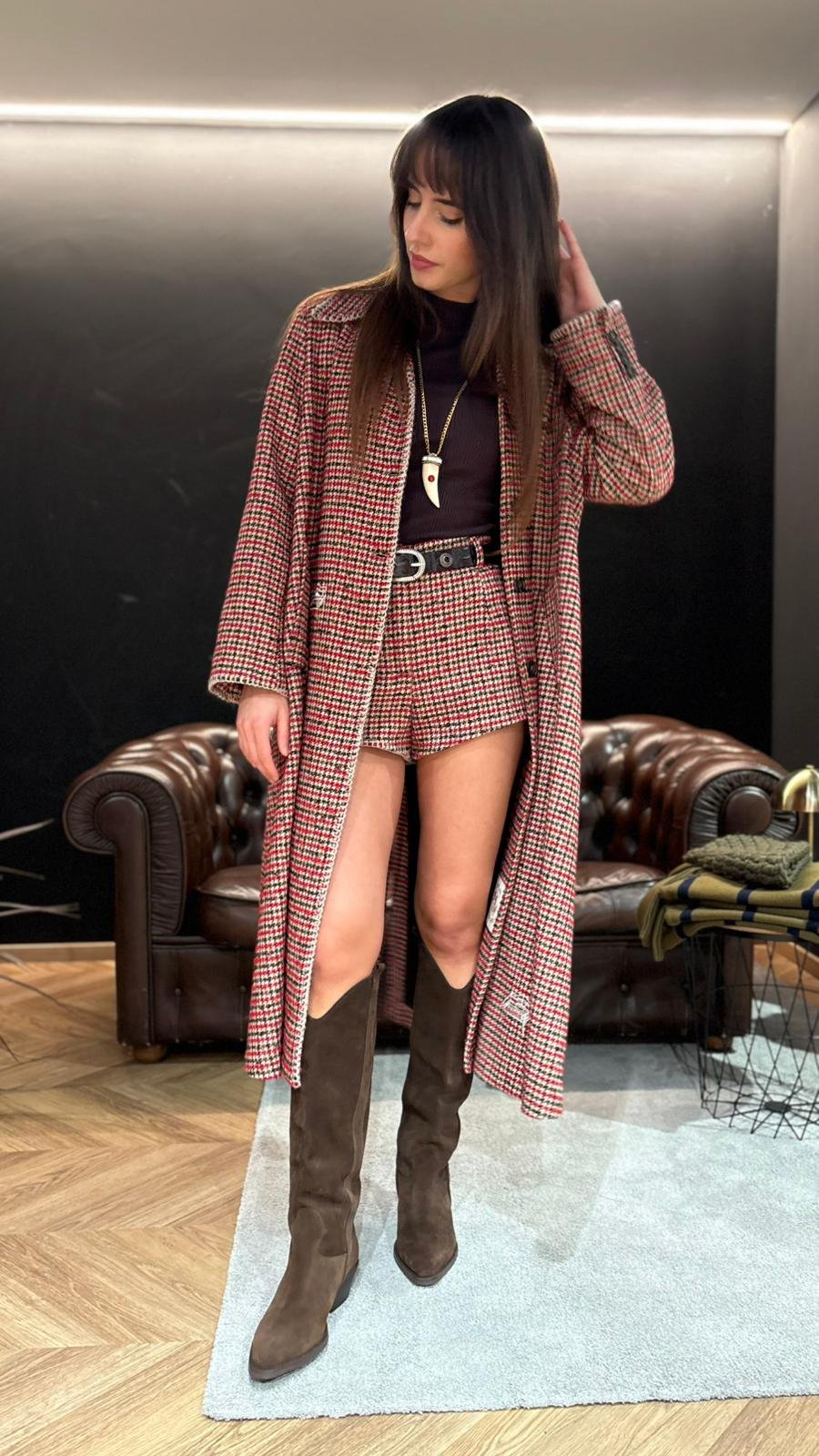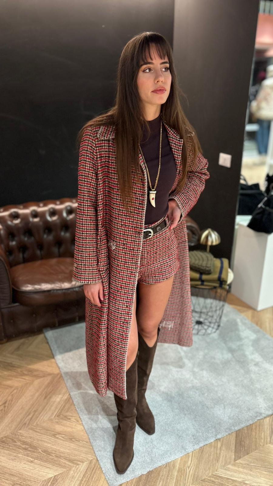 Il cappotto lungo in fantasia pied de poule è la quintessenza dello stile chic senza sforzo.