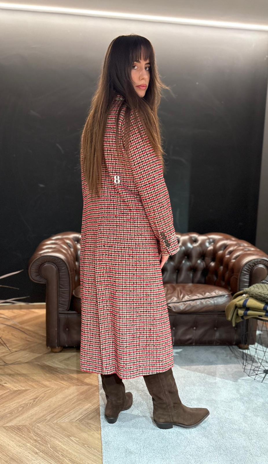 Morbido, caldo e avvolgente, ha una linea dritta e leggermente over che dona subito un’allure sofisticata. La fantasia mélange nei toni del rosso, panna e nero illumina il look e valorizza qualsiasi abbinamento.