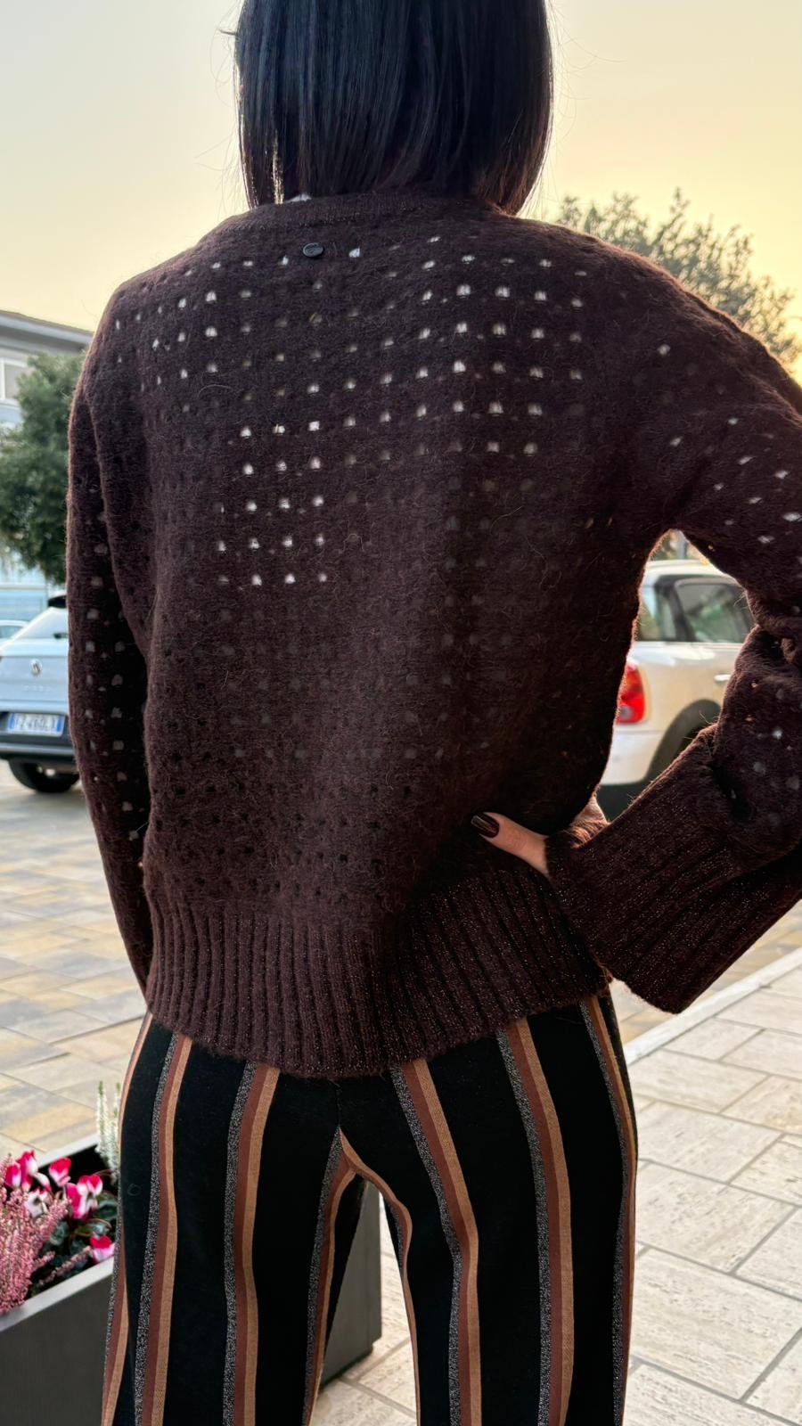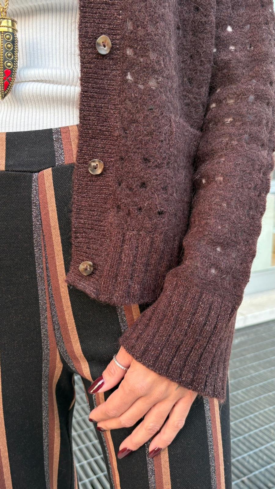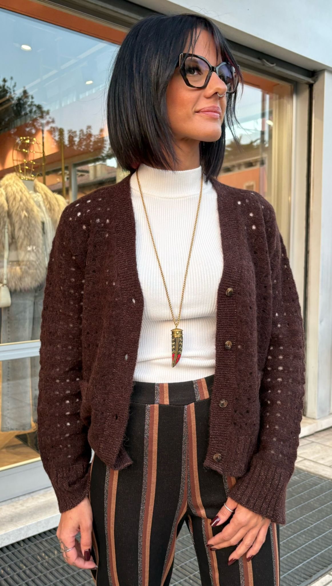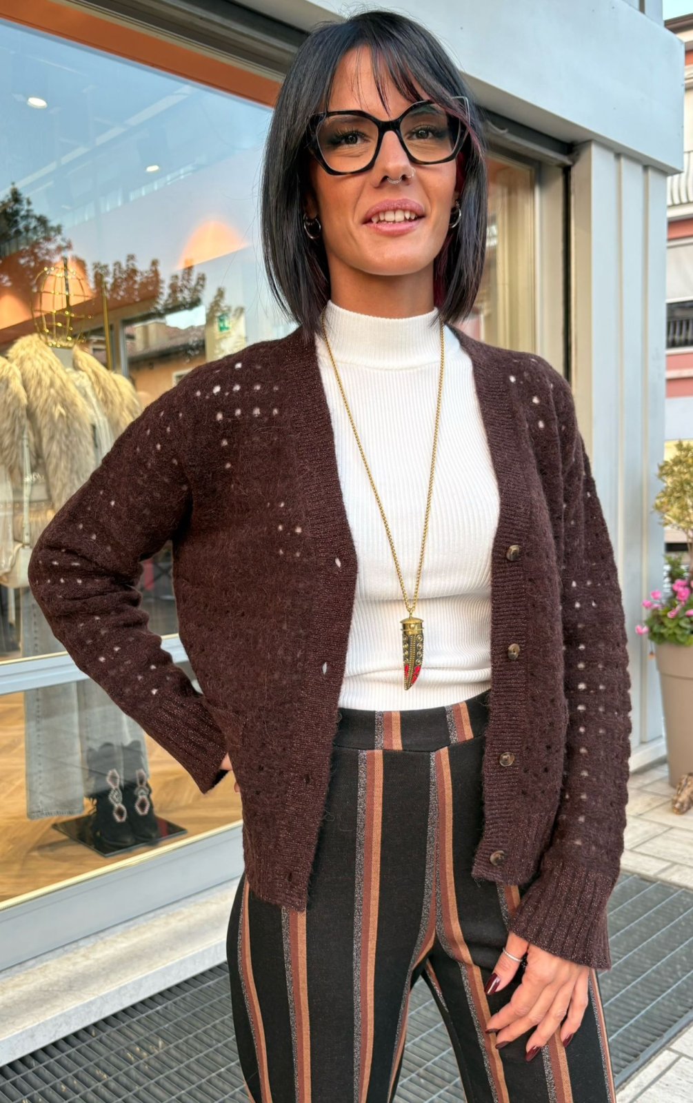 Il suo colore caffè nero è profondo e avvolgente, una nuance calda e chic che sta bene con tutto, dal denim ai pantaloni fantasia, come le righe rame e cioccolato che abbiamo scelto per questo look.