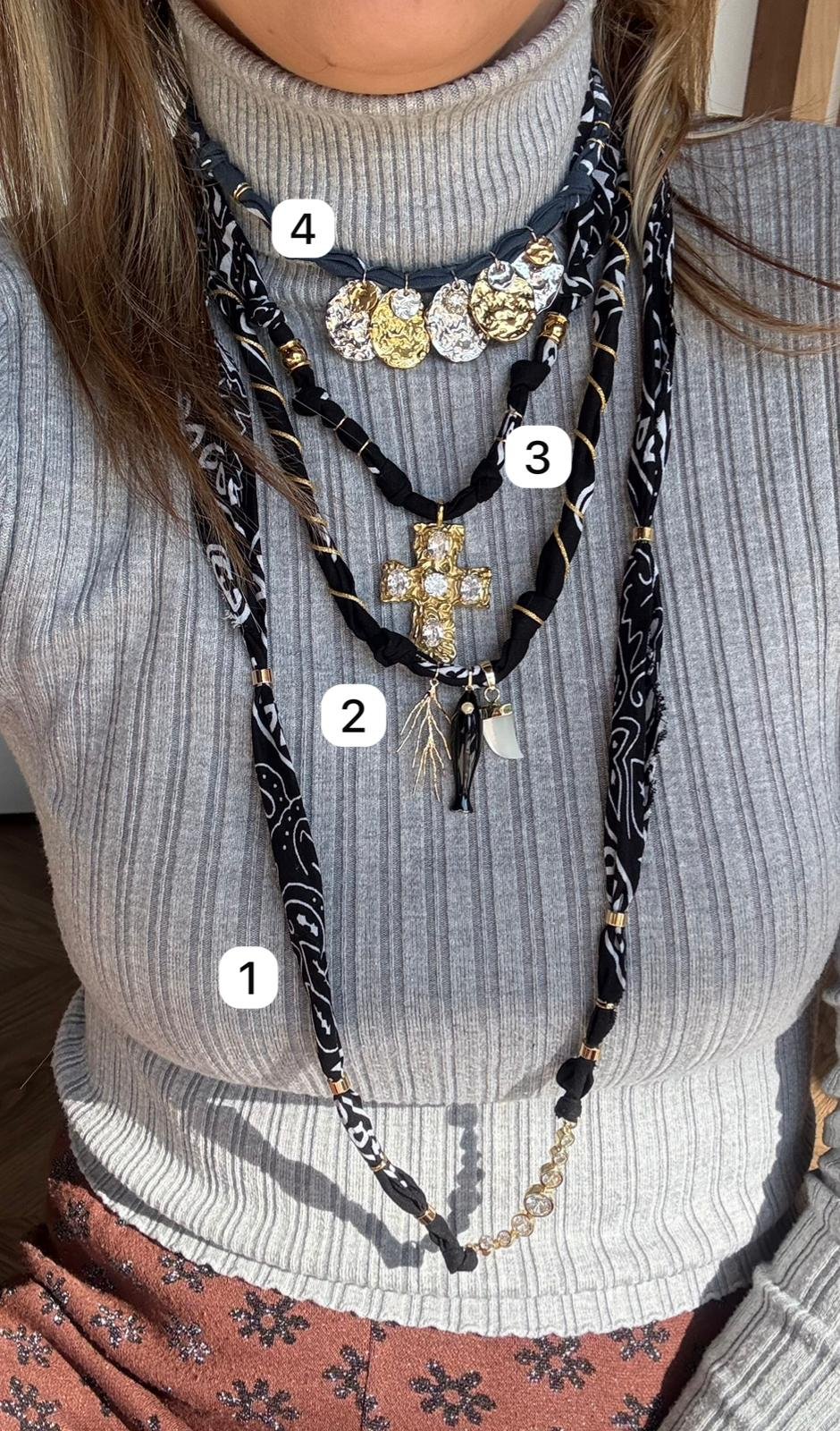 Un choker dal gusto boho con tessuto bandana nero e piccoli inserti dorati, pensato per chi ama i dettagli discreti ma decisi.