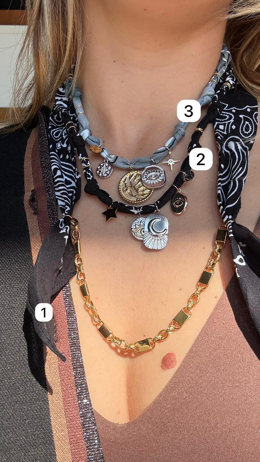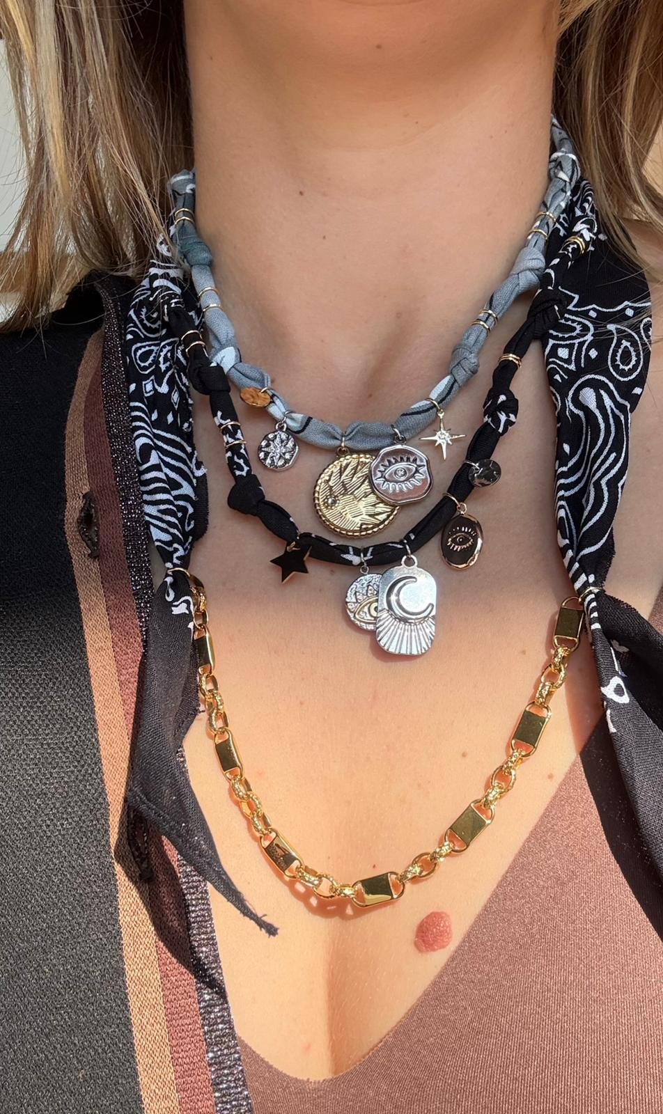 Charms argentati e dorati si alternano lungo il nastro bandana, tra stelle, lune e occhi che proteggono e affascinano.