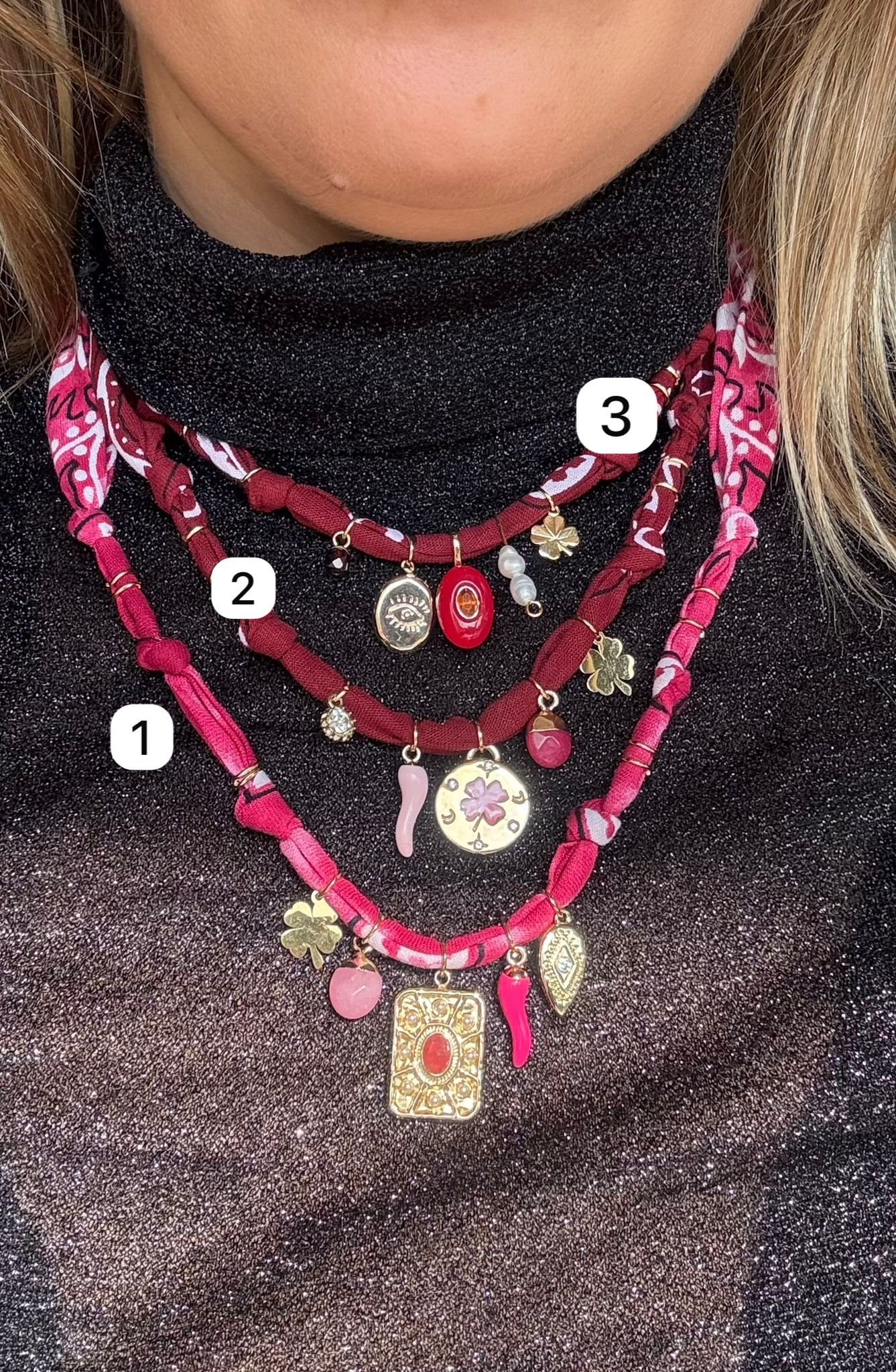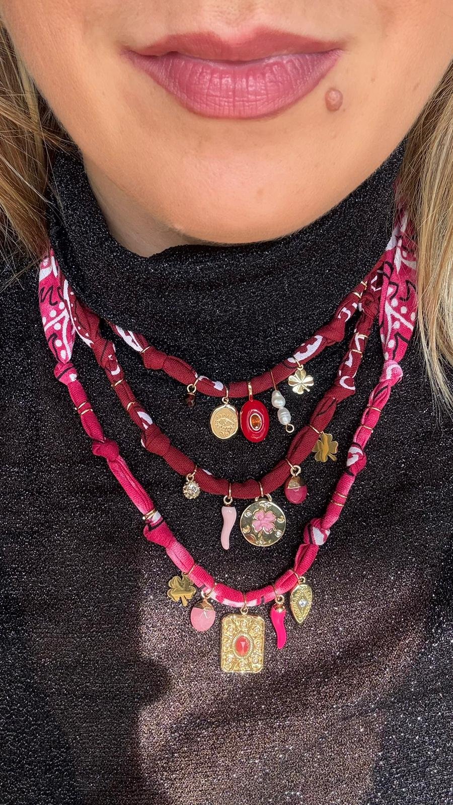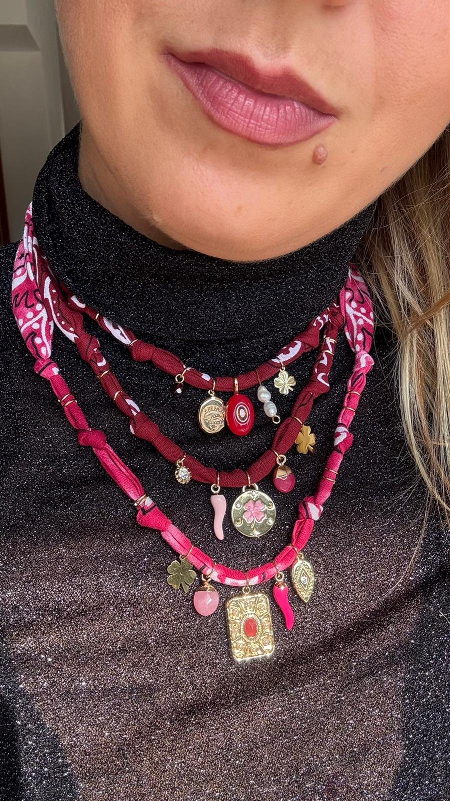 Il modello Varanasi di Badhnati Jewelry nasce dall’intreccio di tessuti bandana color amarena e corallo, uniti a piccoli charm dorati e amuleti portafortuna che raccontano storie di viaggi, amore e rinascita.