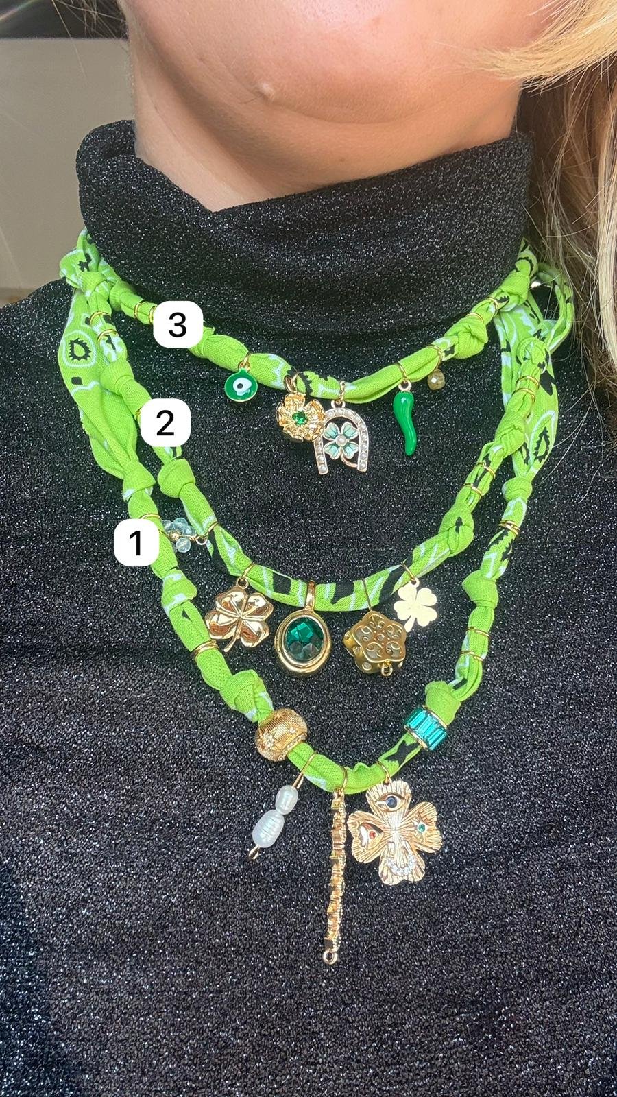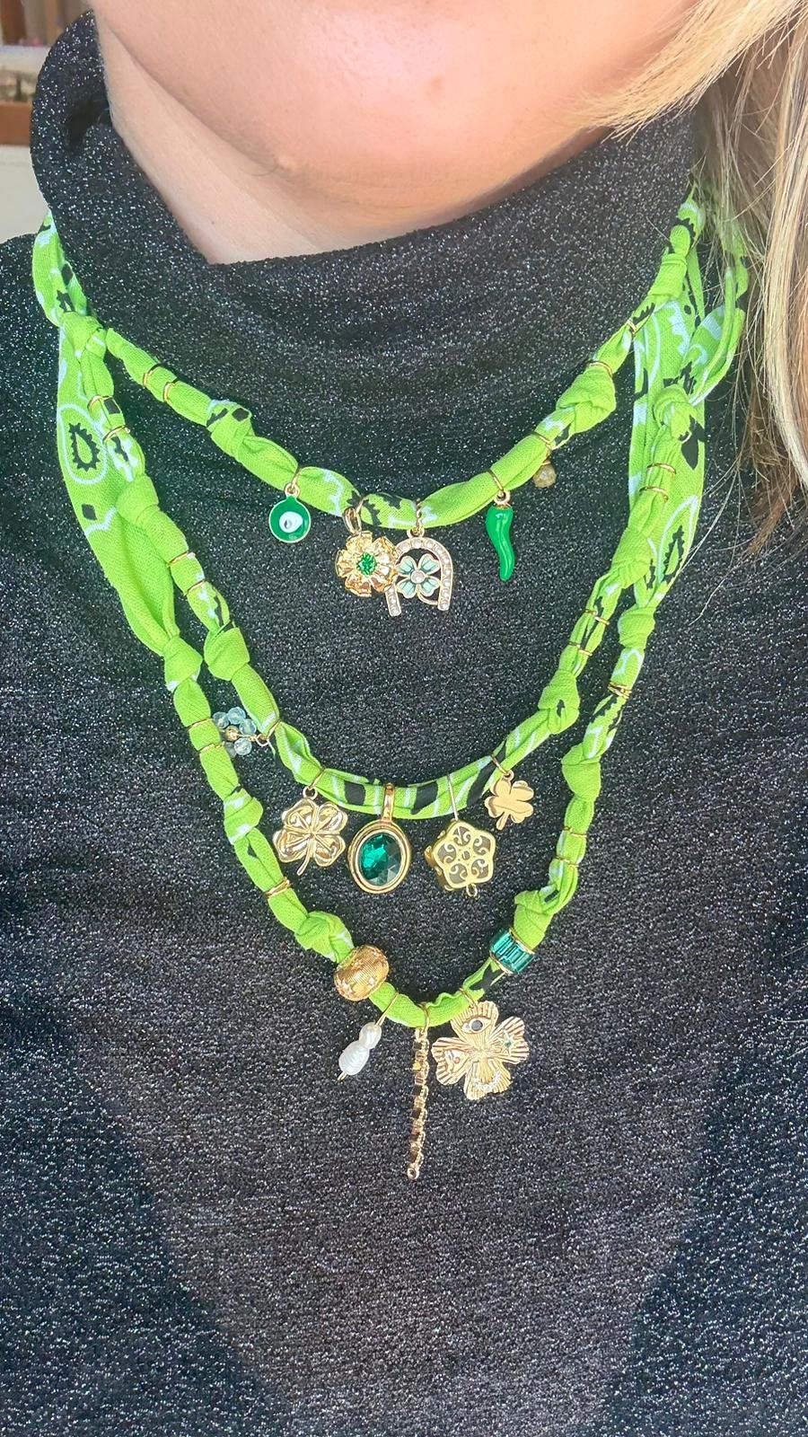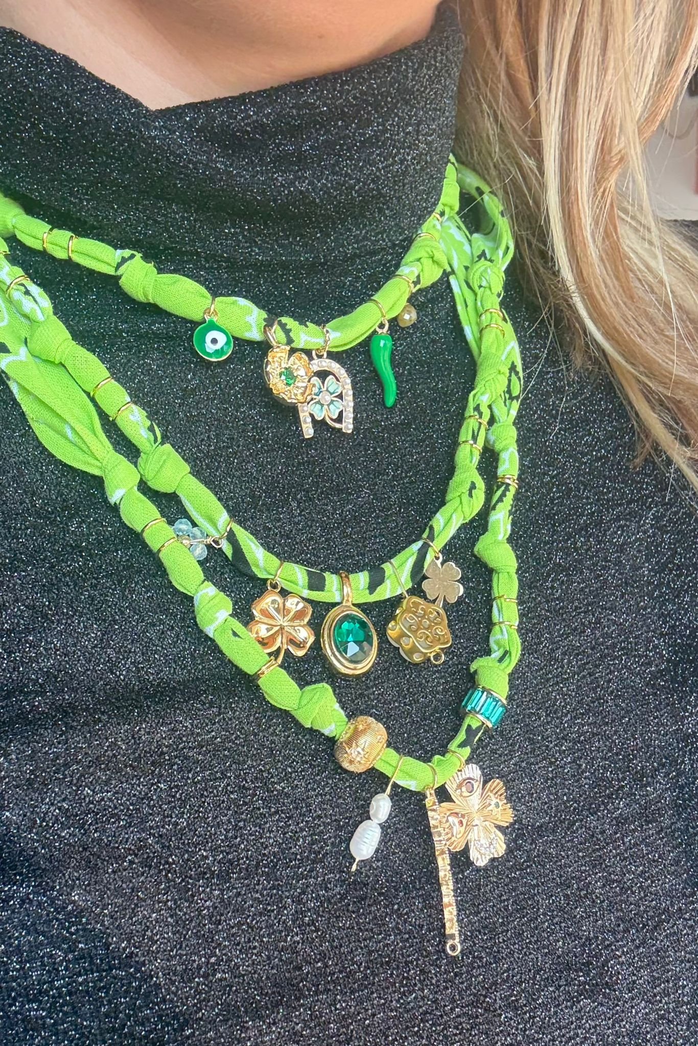 Il modello Varanasi Verde di Badhnati Jewelry sprigiona tutta la sua energia positiva attraverso un intreccio di bandana lime e smeraldo, arricchito da una cascata di charm dorati e amuleti simbolici: quadrifogli, ferri di cavallo, occhi protettivi e cornetti scaramantici.