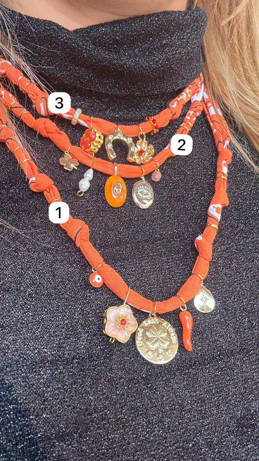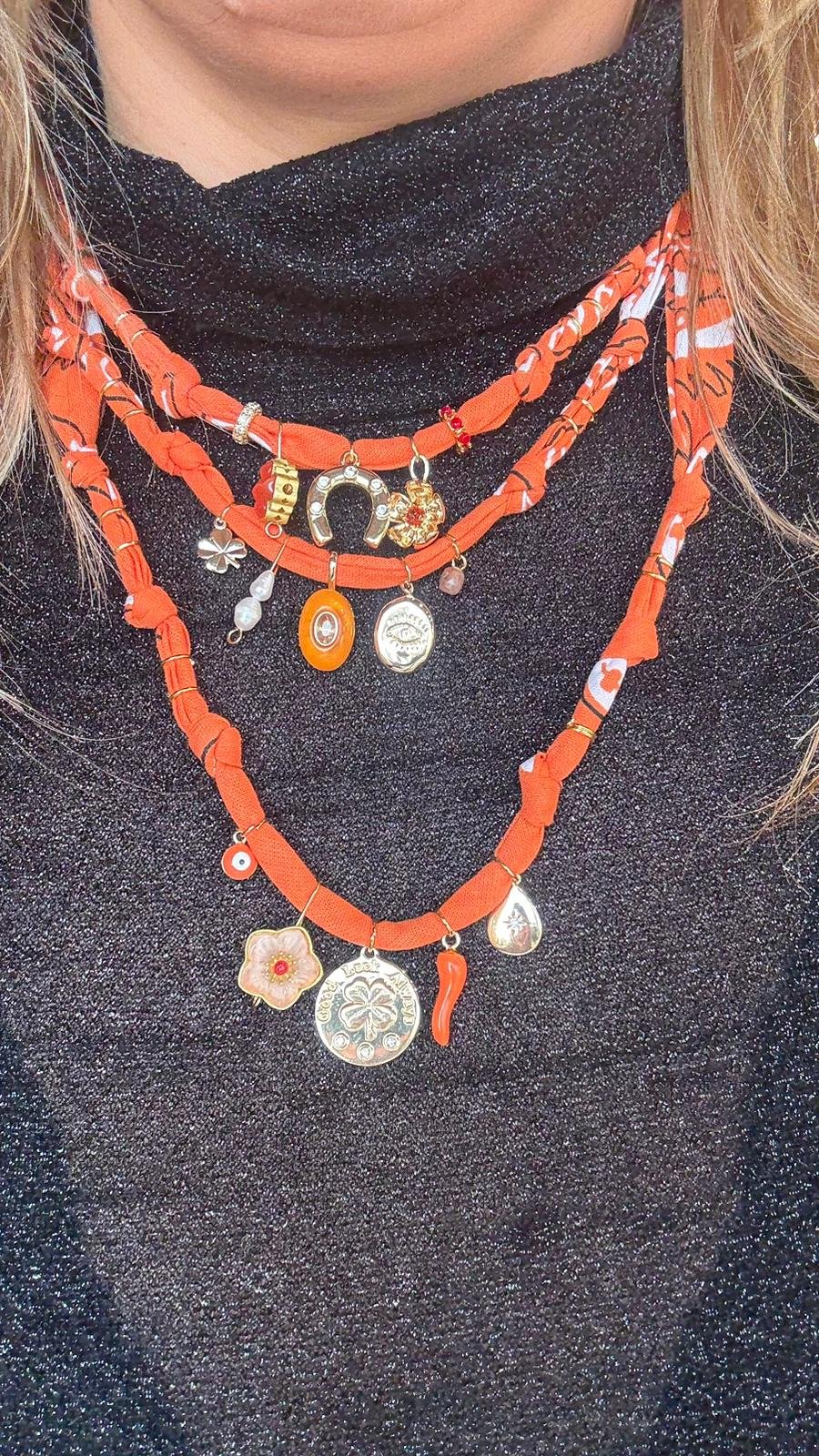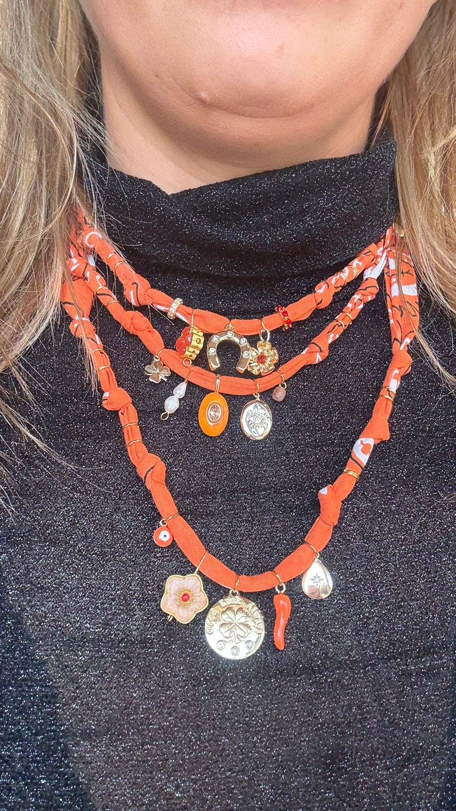 Il modello Varanasi Arancio di Badhnati Jewelry racchiude tutta la forza del sole al tramonto: bandana artigianali intrecciate a mano nei toni caldi dell’arancio bruciato e una cascata di charm dorati, amuleti e piccoli simboli portafortuna.