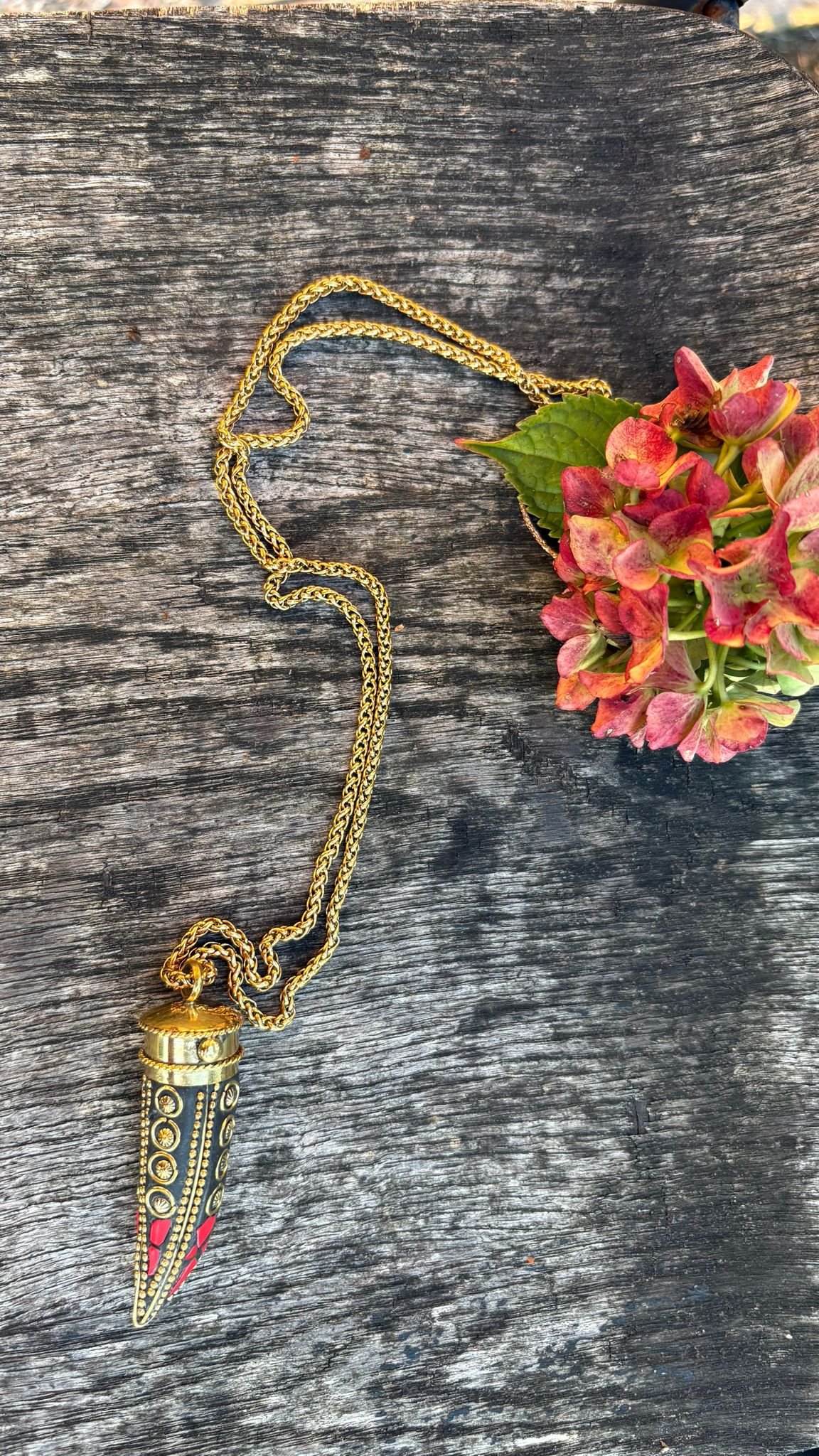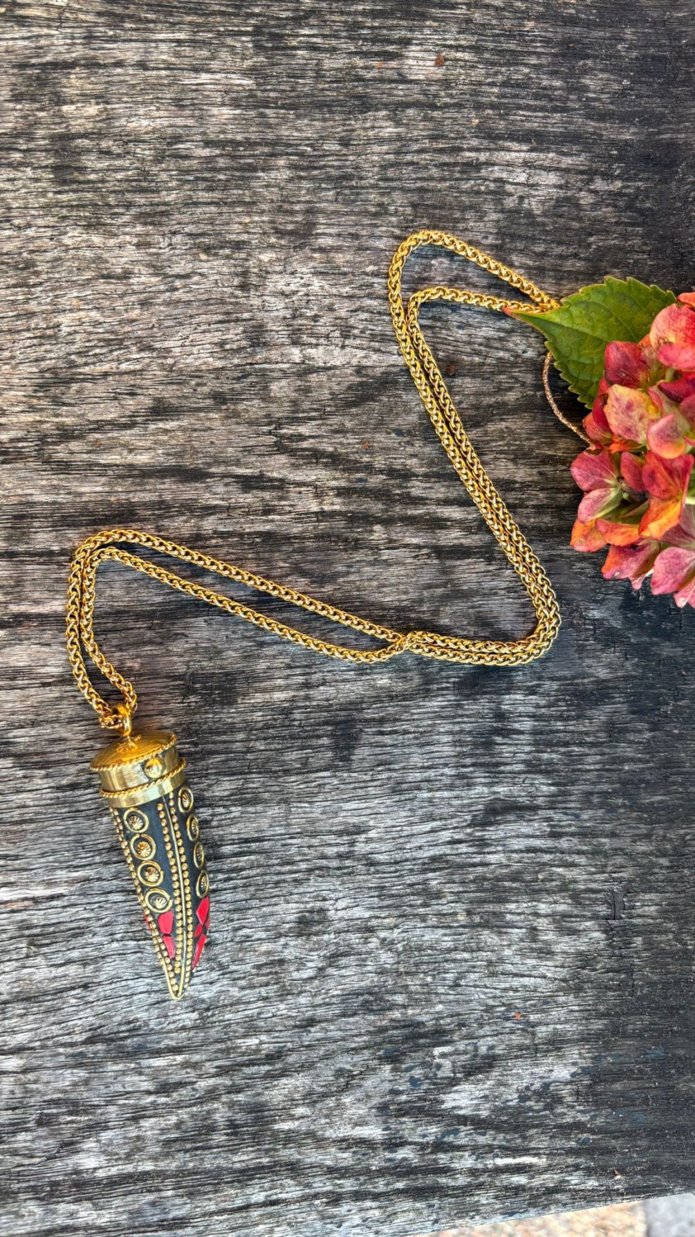 Questa collana Capsula tribale unisce tradizione e carattere contemporaneo: il pendente, realizzato e dipinto a mano, unisce lavorazioni minute, dettagli dorati e tocchi di rosso che illuminano la composizione.