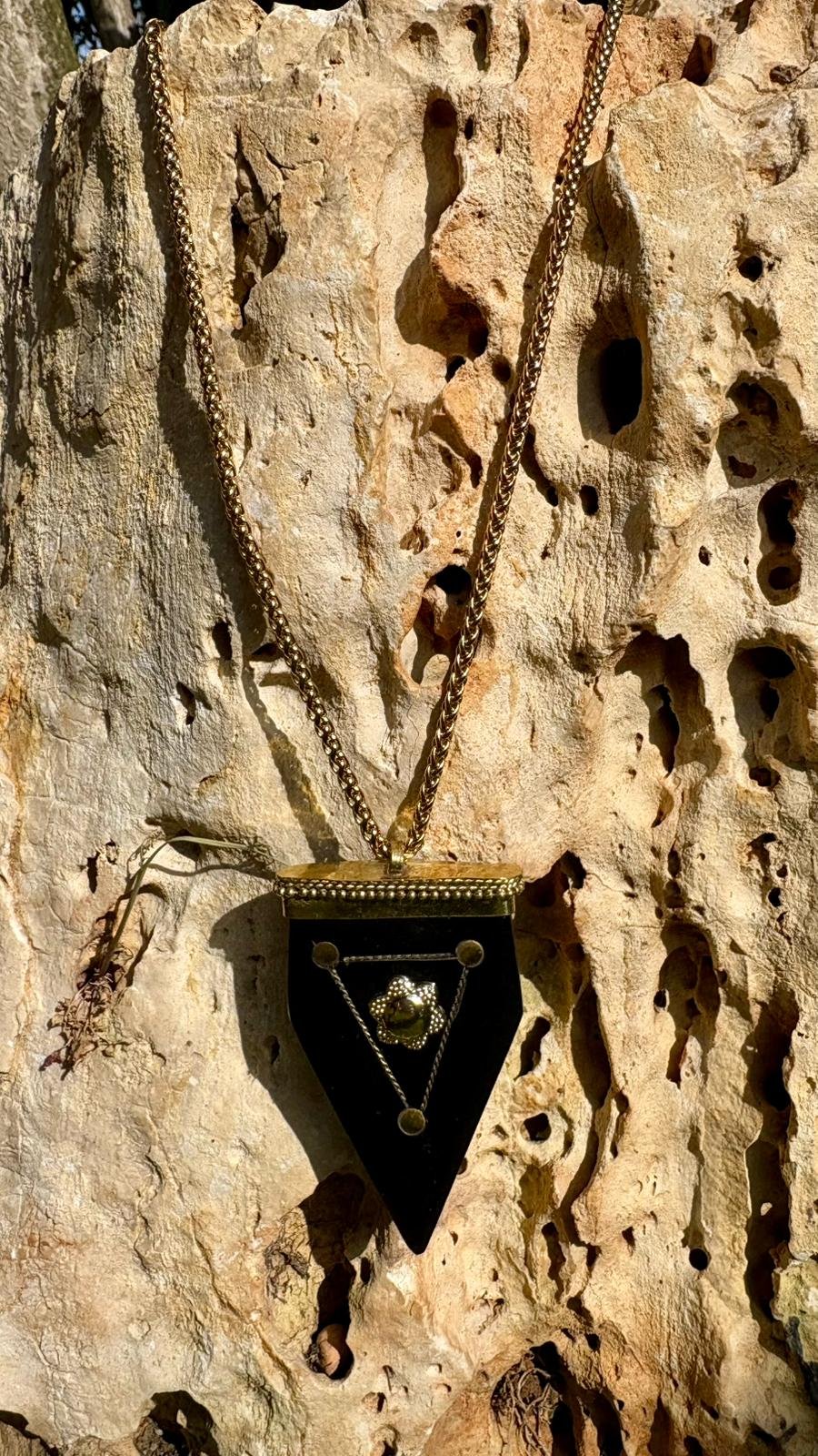 Il pendente, realizzato artigianalmente, presenta un corpo nero intenso arricchito da dettagli e inserti in bagno d’oro 24 carati.