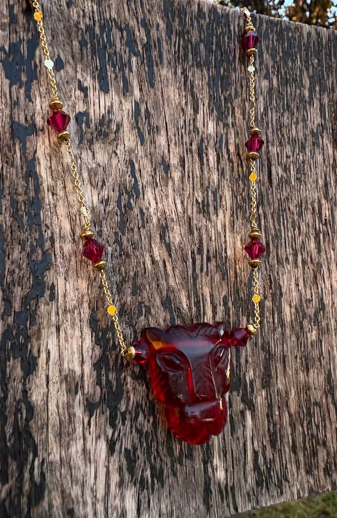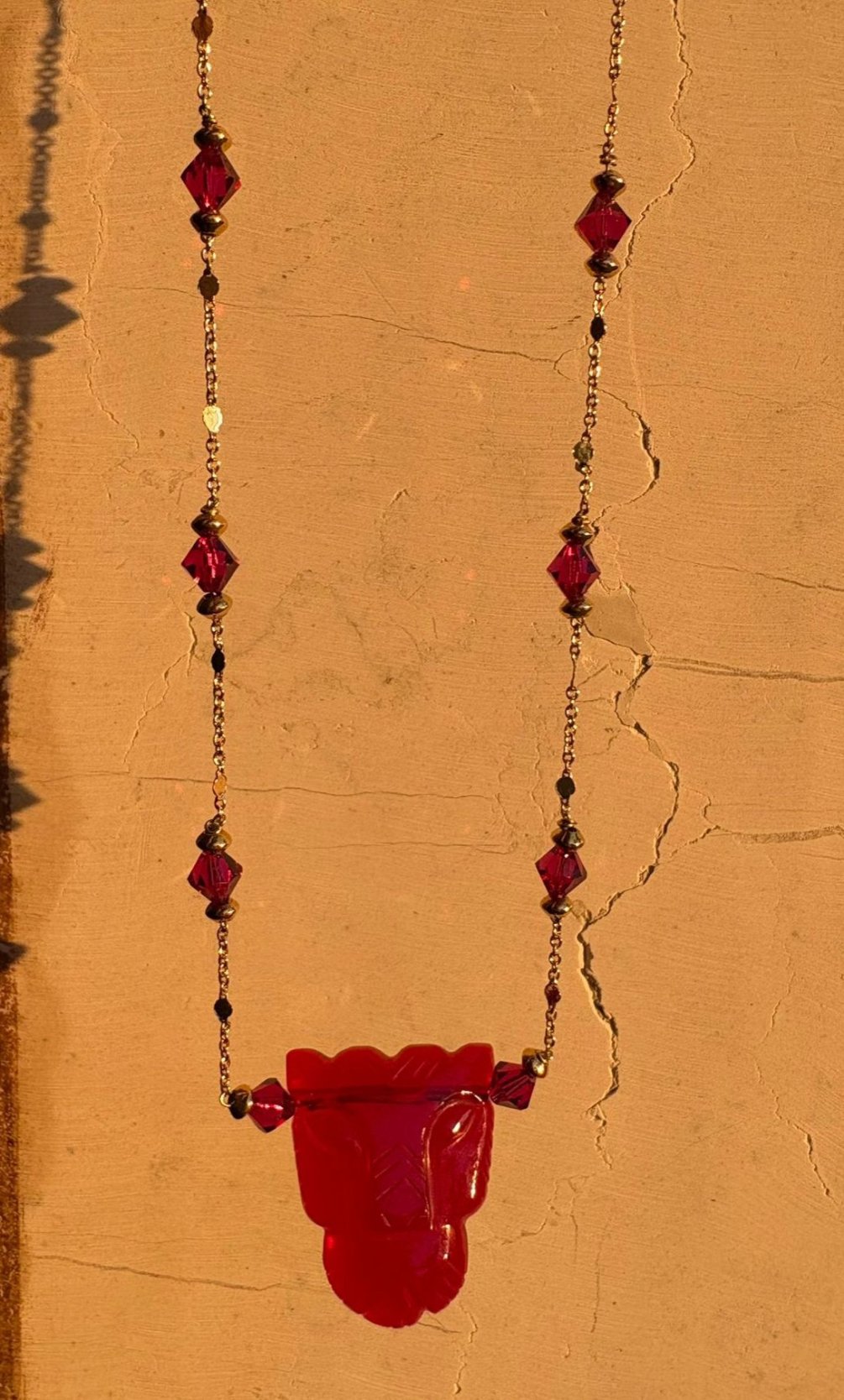 Il ciondolo, scolpito artigianalmente nella tormalina rossa, emana energia e vitalità; la catena dorata alterna piccole perle e cristalli luminosi, creando un gioco di luce ad ogni movimento.