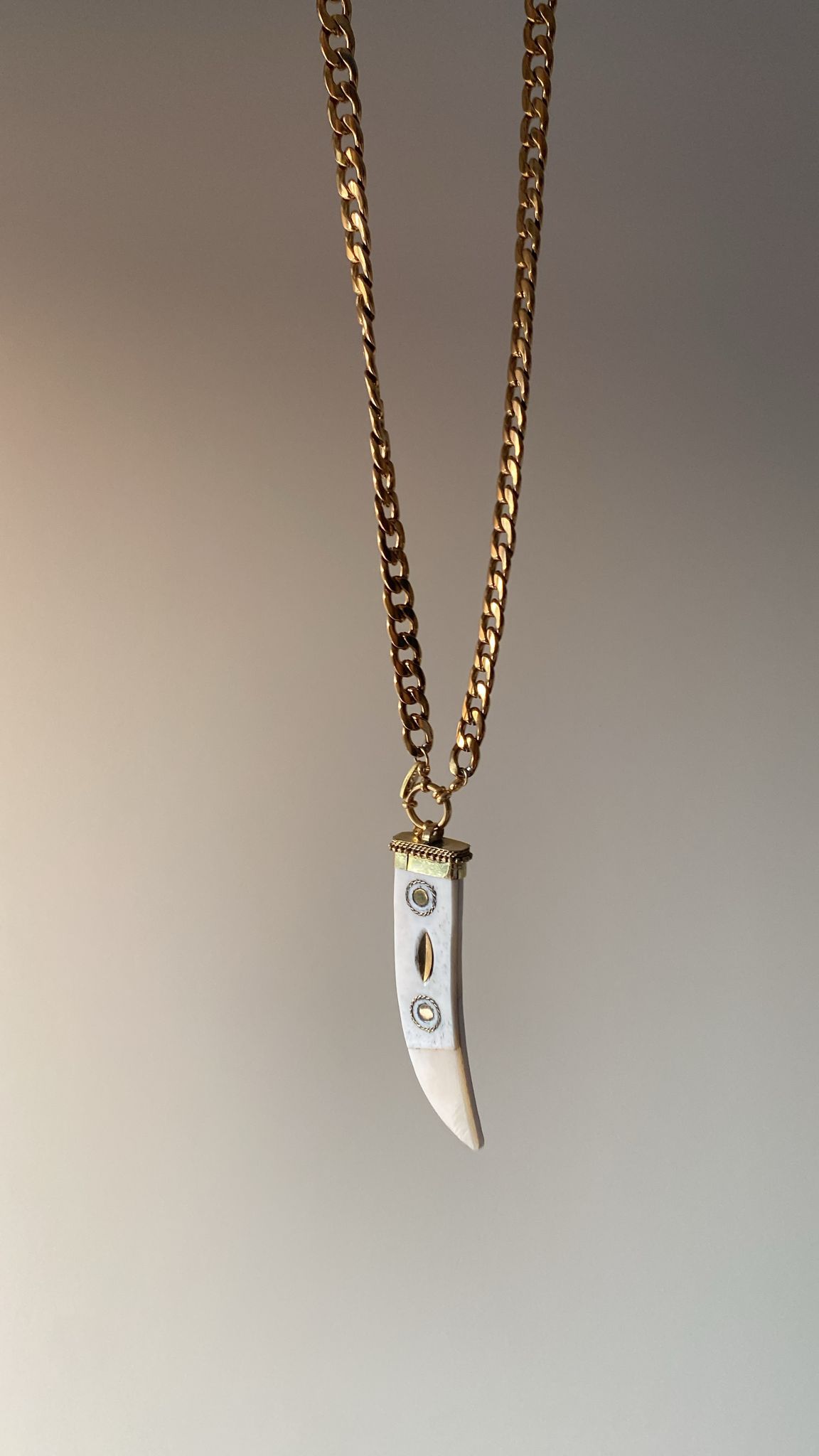 Il pendente a zanna, lavorato in osso e corallo, unisce forza e protezione: secondo la tradizione il corallo è legato all’energia vitale e alla fortuna, mentre l’osso rimanda a radici e solidità. La catena dorata, bagnata in oro 24 carati e realizzata con materiali anallergici, dà carattere e luce al design.