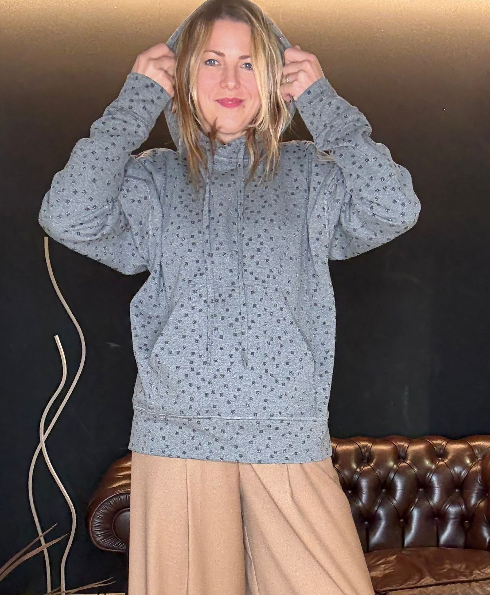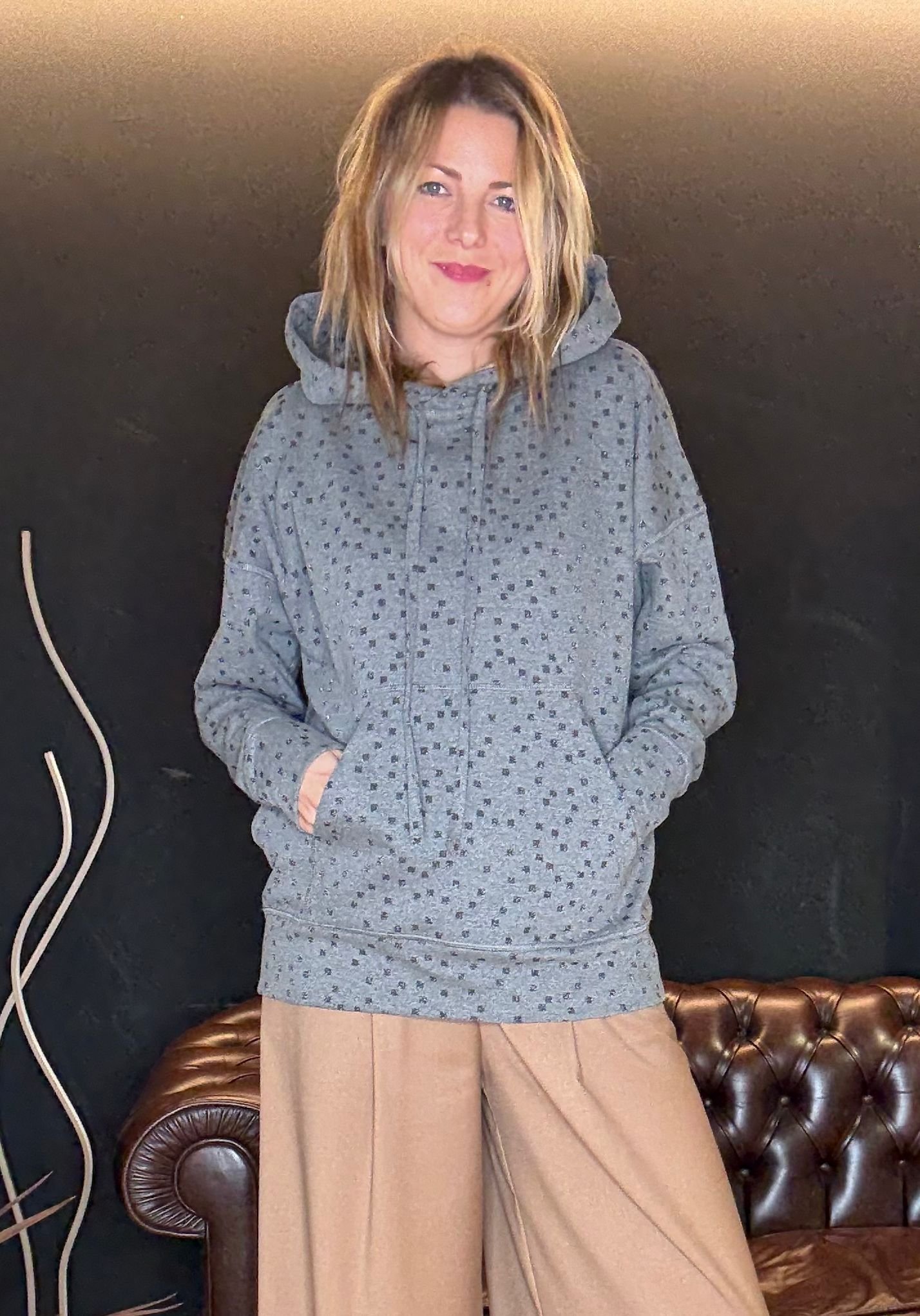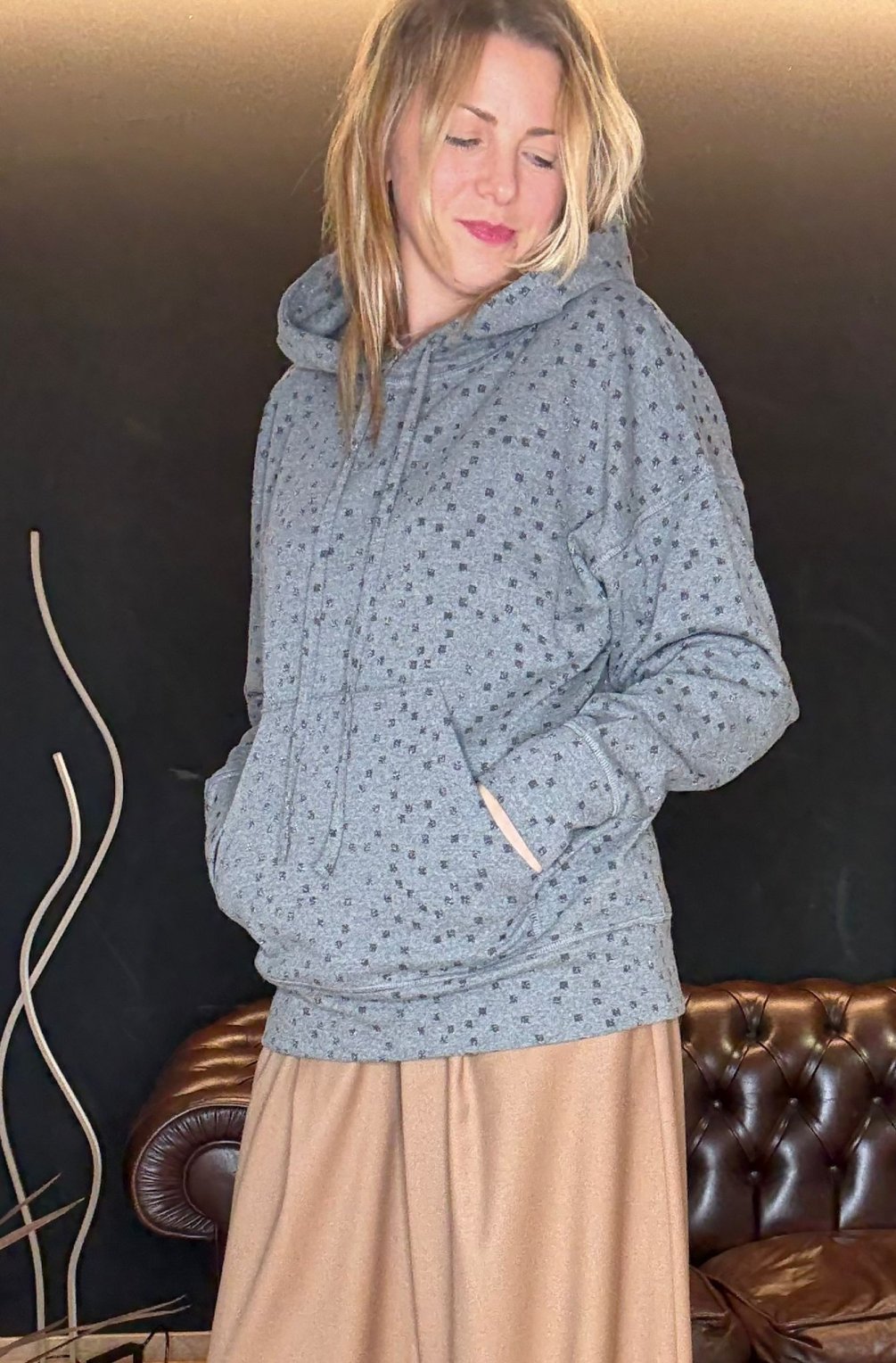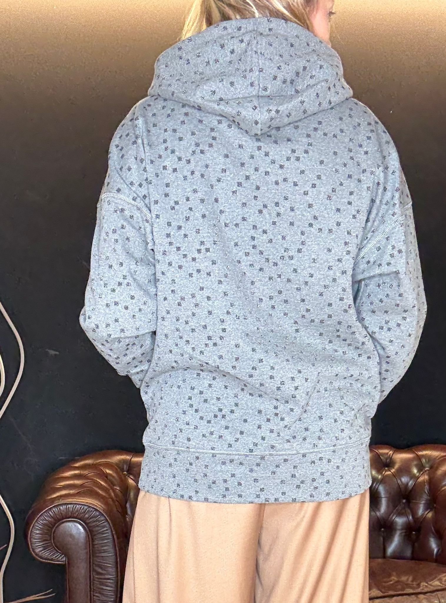 Firmata Luce Studio, ha un taglio oversize, cappuccio morbido, tasche frontali e un dettaglio in più: il tessuto punteggiato da micro-disegni che la rende speciale senza esagerare.