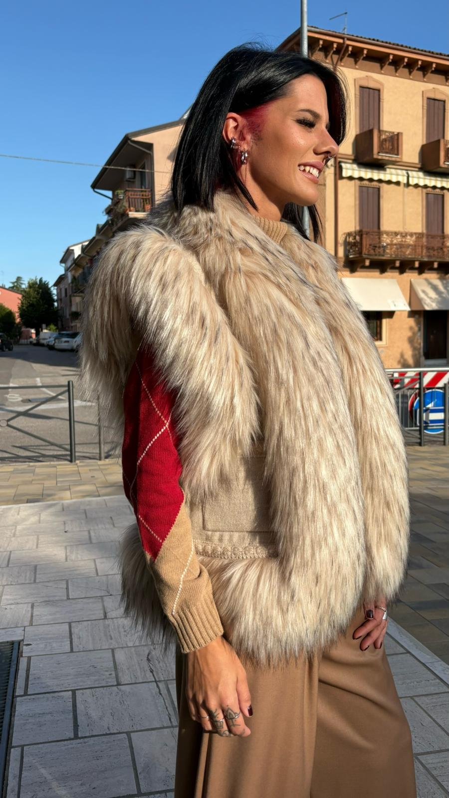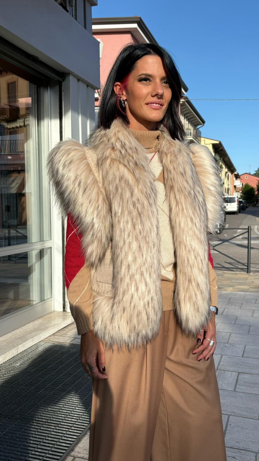 Il gilet Fleur è il dettaglio che trasforma un look. La lavorazione jacquard in tonalità marfil crea un gioco di luce elegante e sofisticato, mentre i profili in pelliccia donano volume e carattere.