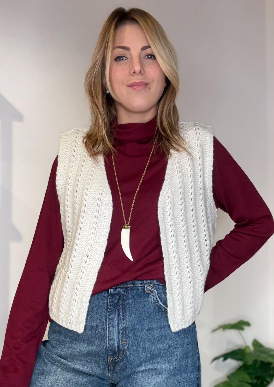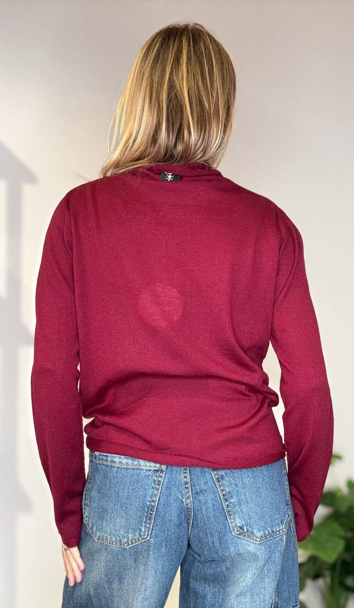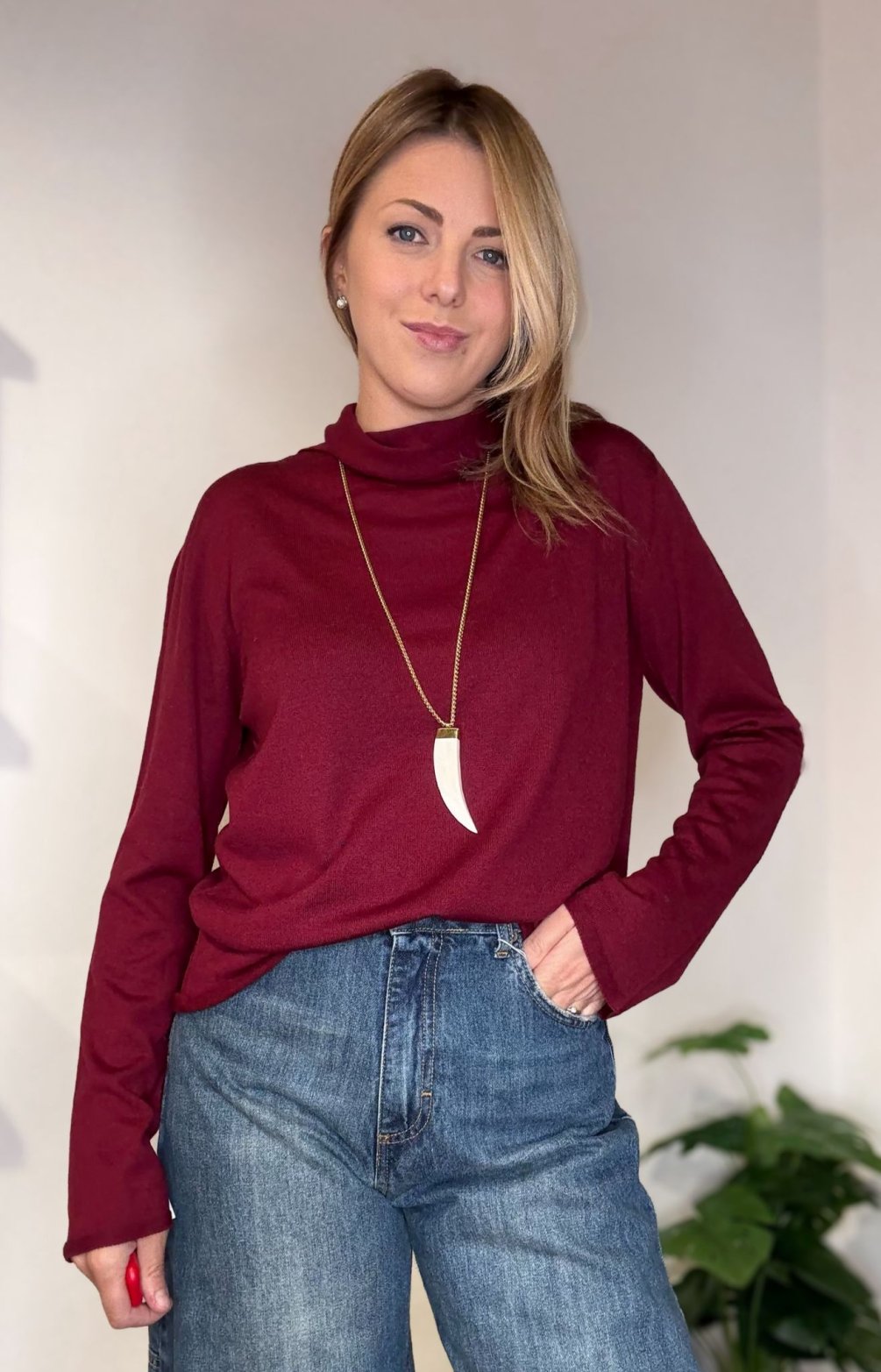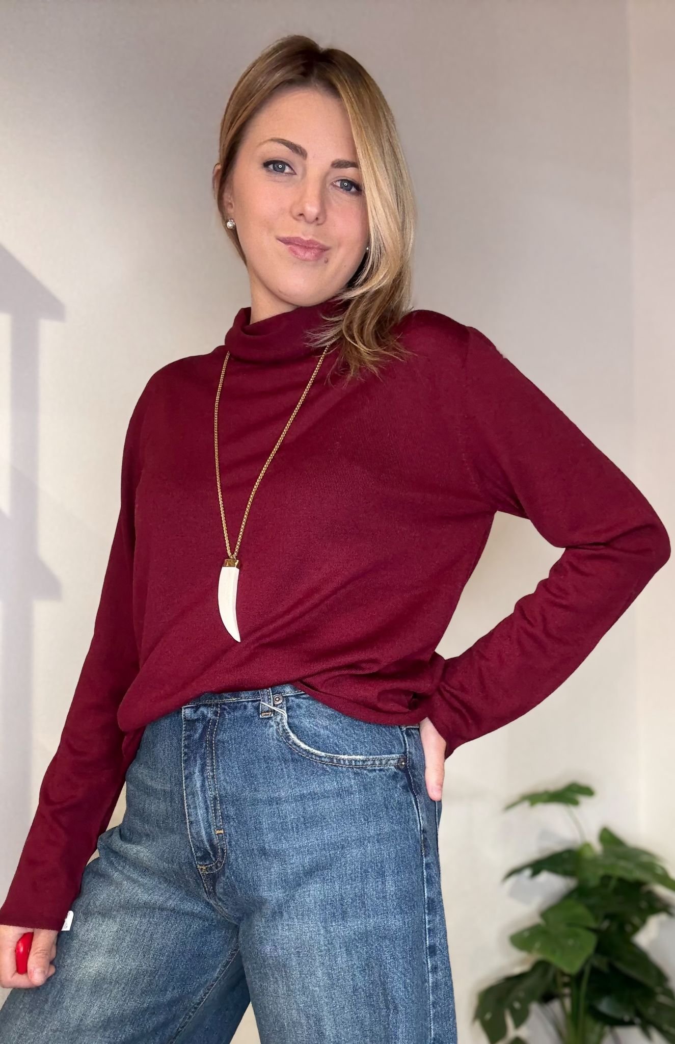 Il colore bordeaux intenso aggiunge carattere e profondità, perfetto per illuminare denim, neutri e toni autunnali. Il collo morbido effetto lupetto regala un tocco contemporaneo e versatile: da sola con un jeans per un look semplice e chic, sotto blazer o cardigan per outfit più costruiti.