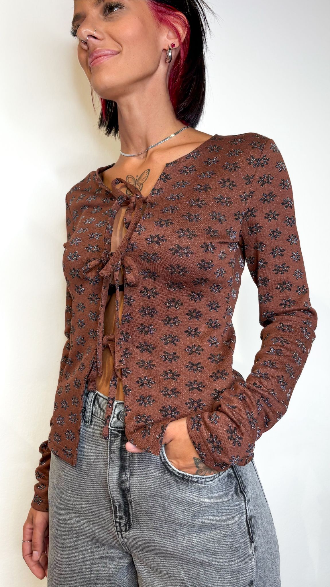 Questa maglia a girocollo con laccetti frontali trasforma la semplicità in charme: i fiocchi creano un gioco raffinato di vedo-non-vedo, mentre la fantasia arricchita da filo lurex illumina ogni tuo movimento.