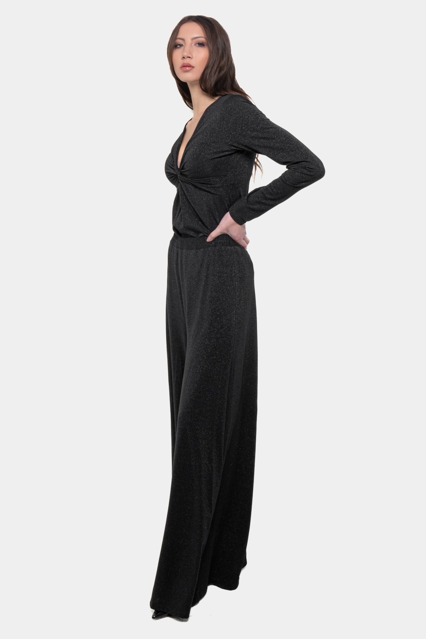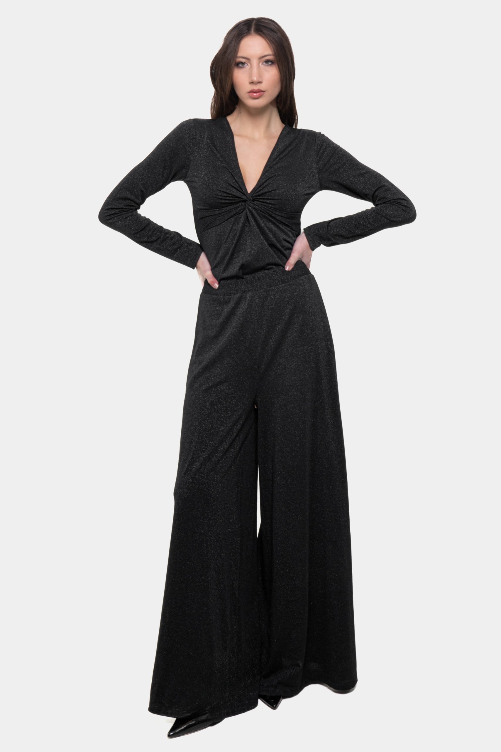 Il pantalone palazzo Lola unisce eleganza, comfort e una linea estremamente raffinata. Realizzato in jersey lurex morbido e leggero, scivola sul corpo senza segnare e regala un effetto slanciato e fluido che valorizza ogni silhouette.