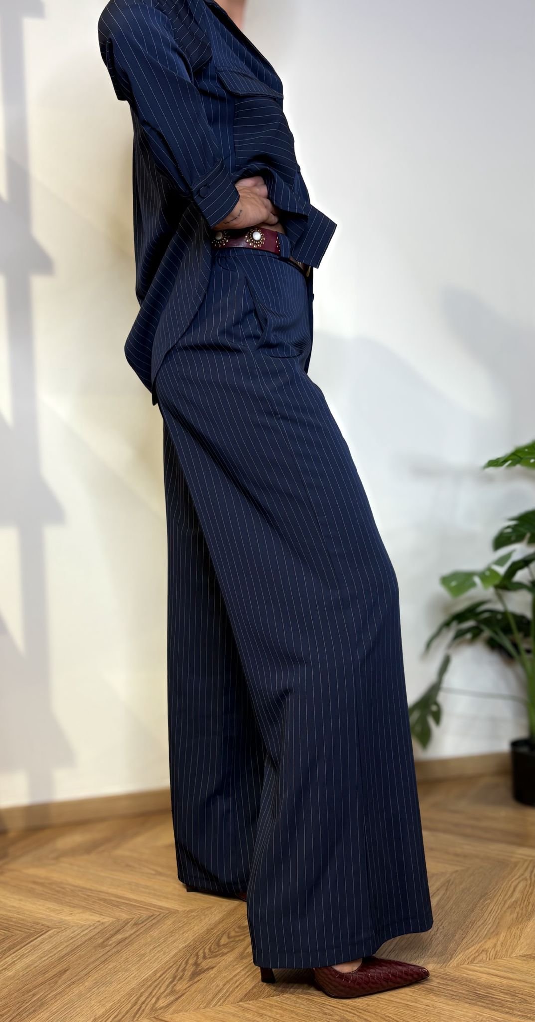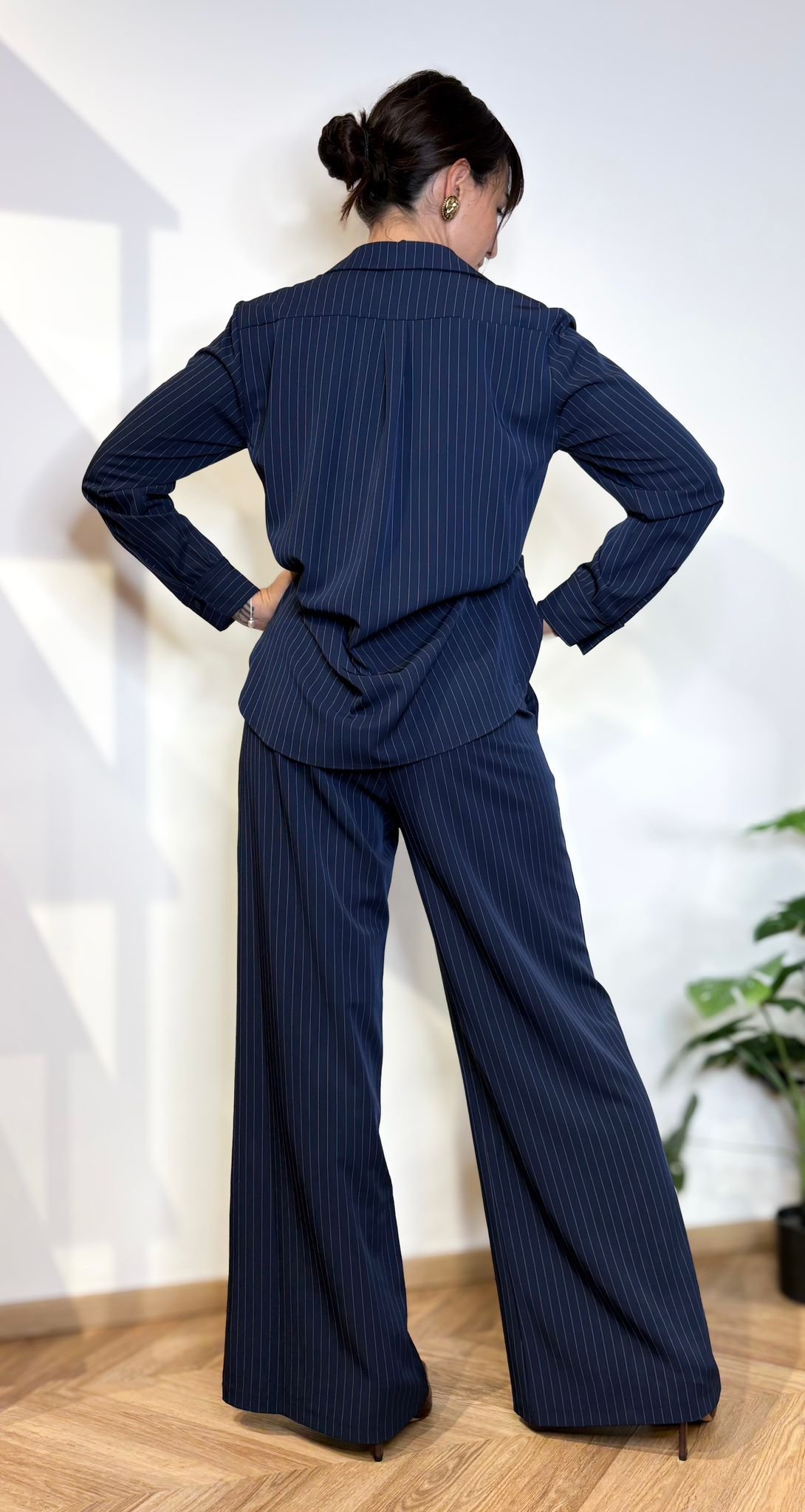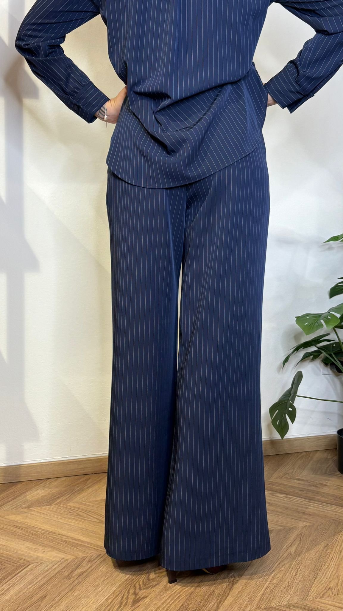 Questo pantalone gessato blu navy completa il power suit in modo impeccabile: vita parzialmente elasticata sul retro per comfort e vestibilità perfetta, chiusura frontale con zip e bottone, tasche laterali funzionali e gamba ampia che cade morbida e slancia la figura.