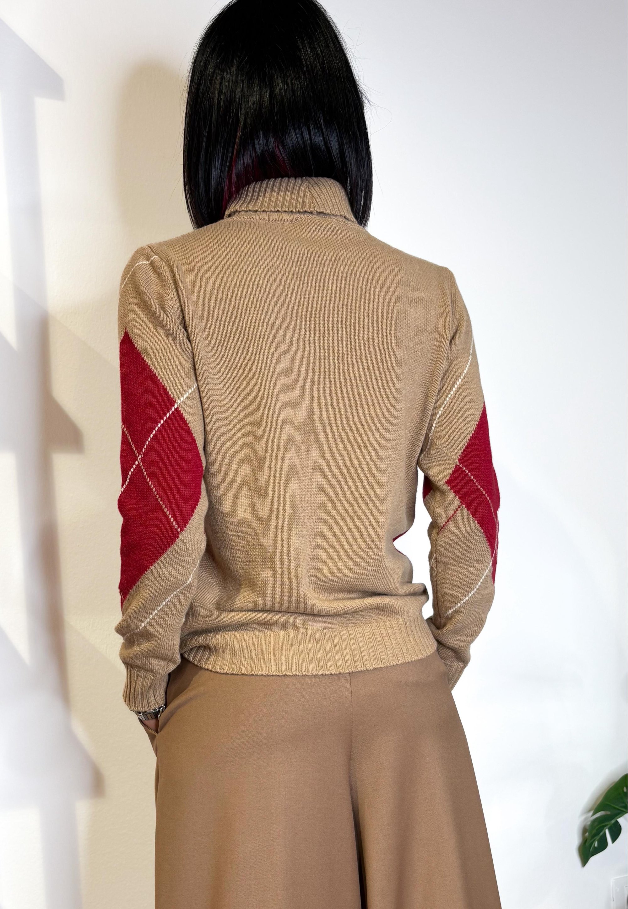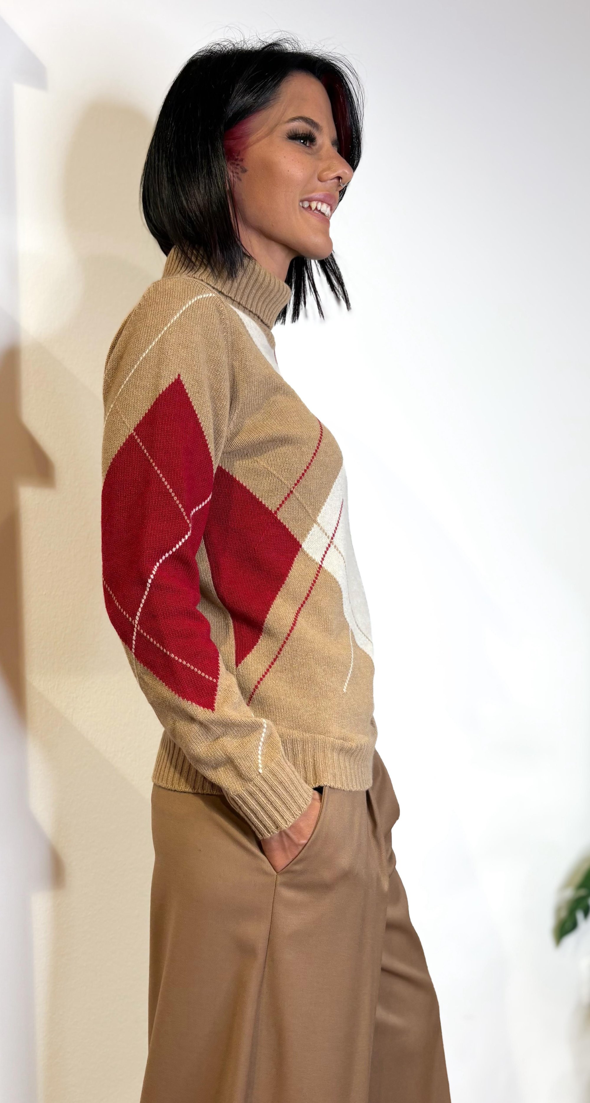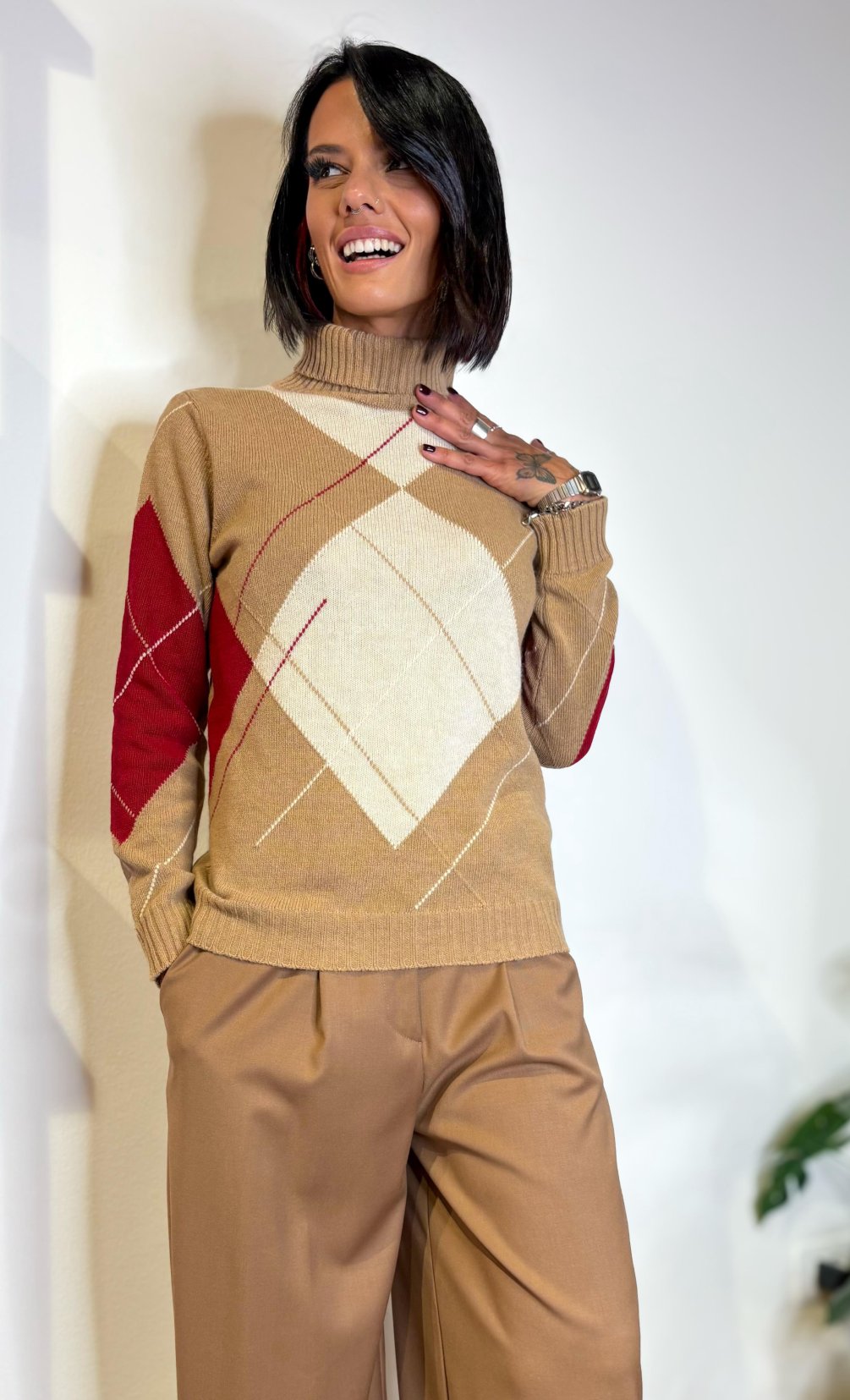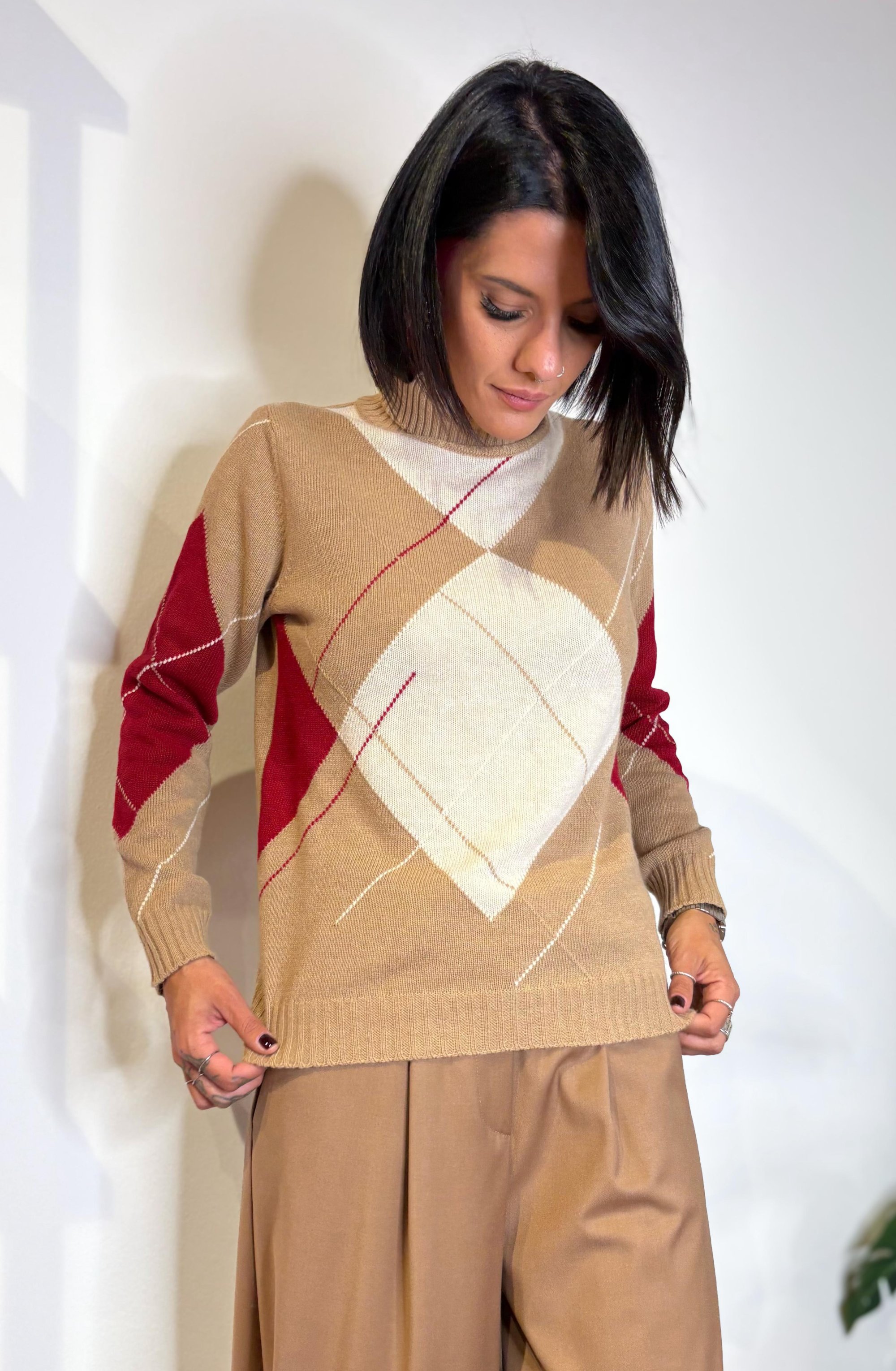 La fantasia argyle nei toni del cammello, panna e rosso dona carattere e raffinatezza, trasformando un classico senza tempo in un capo dal fascino contemporaneo. La vestibilità regolare e i dettagli sartoriali lo rendono versatile: chic con un pantalone sartoriale, raffinato anche con un semplice denim.