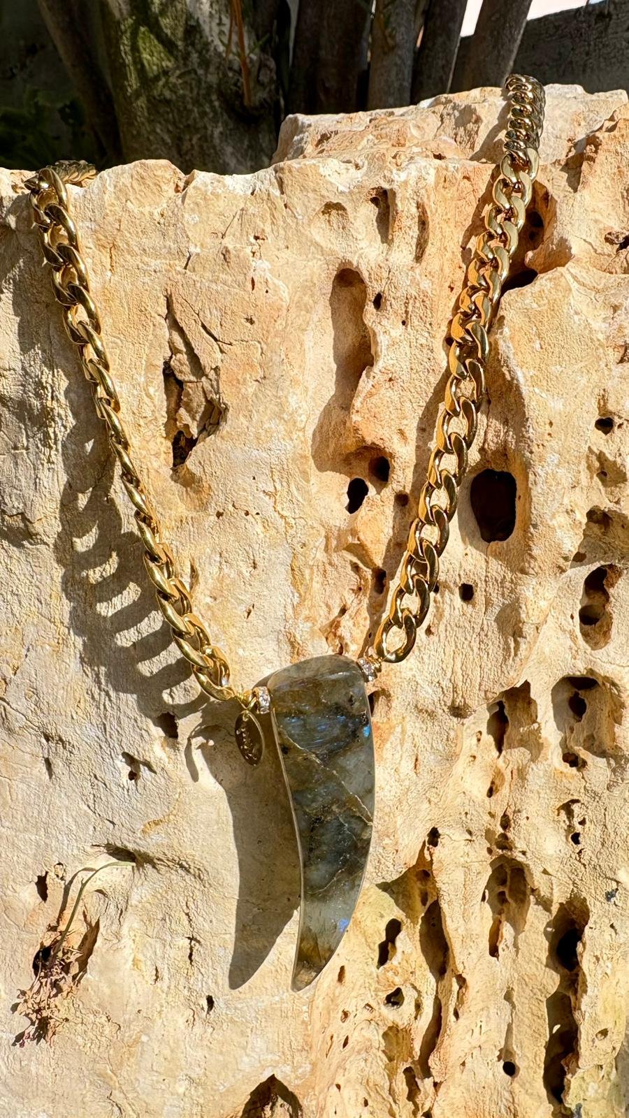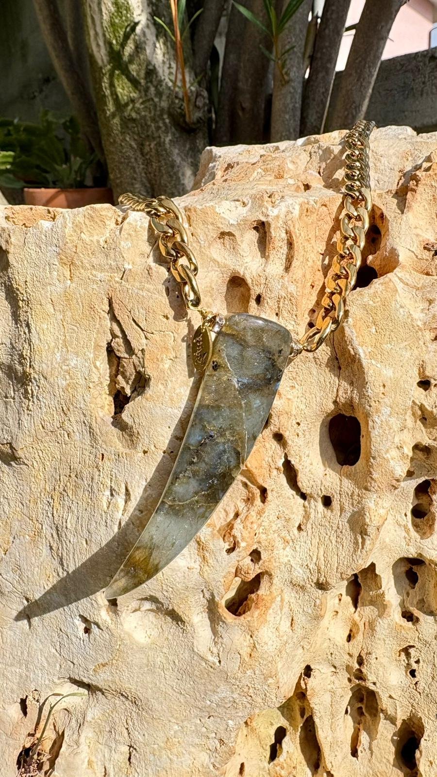 La zanna in labradorite rivela riflessi cangianti tra grigio, verde e blu, creando un effetto luminoso che cambia a ogni movimento.