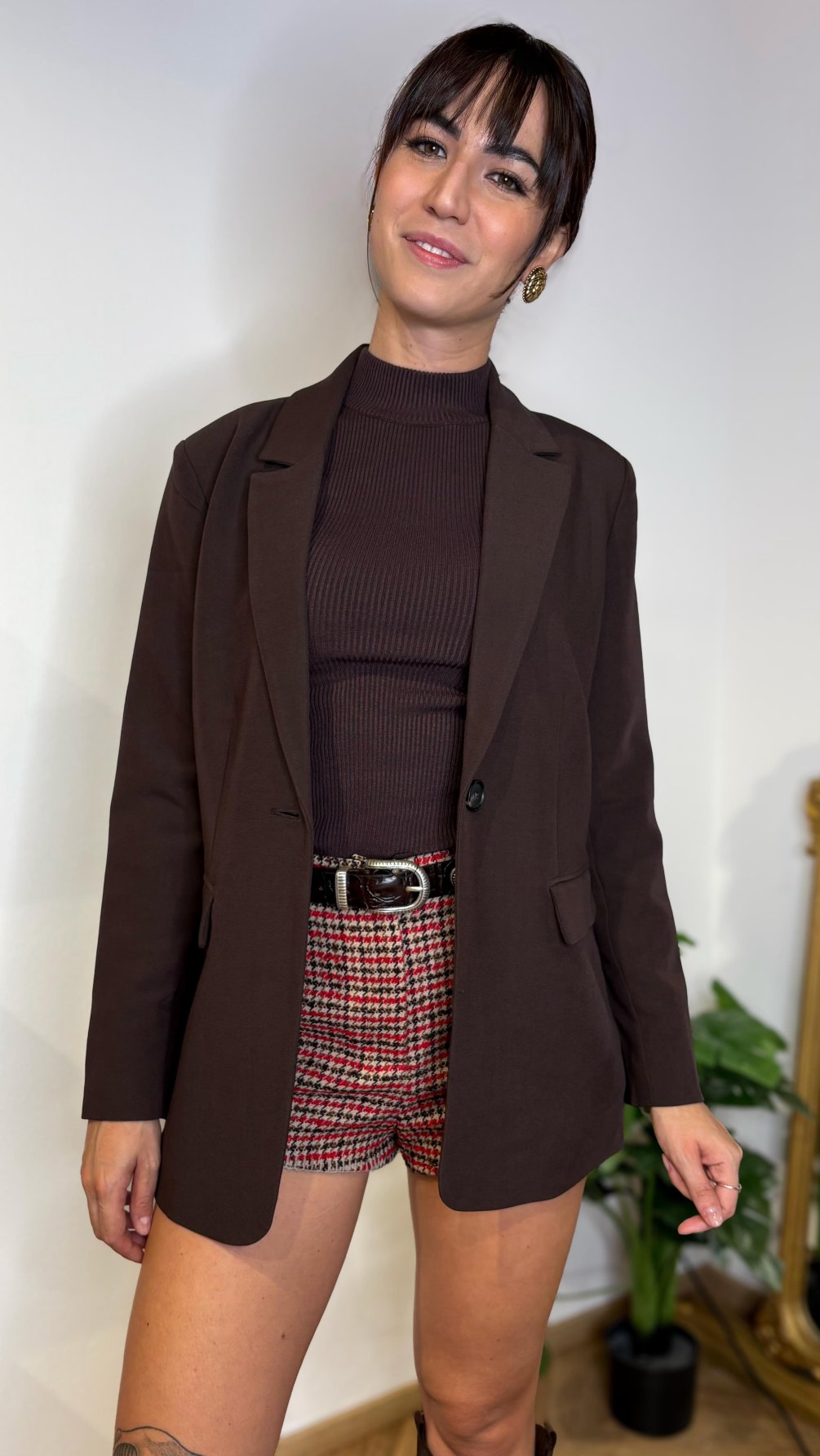 Il taglio monopetto con bottone singolo valorizza la linea, mentre la tonalità profonda e raffinata si abbina facilmente sia a look da ufficio sia ad outfit più casual chic.