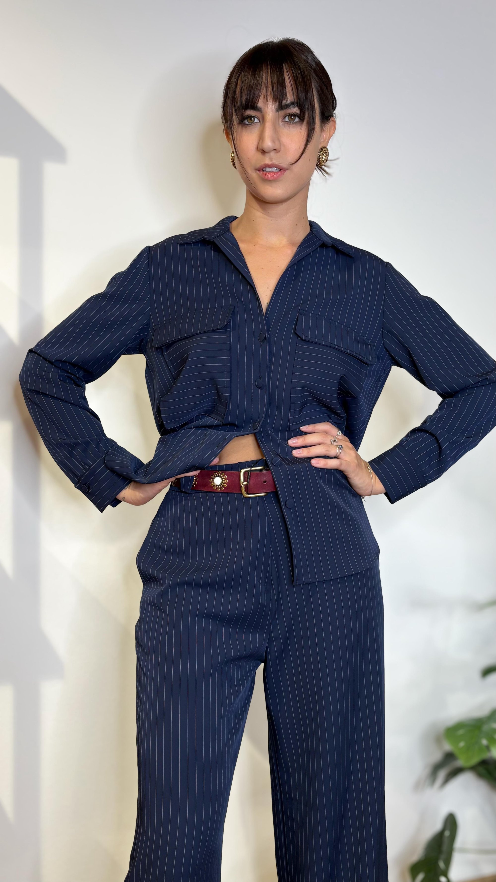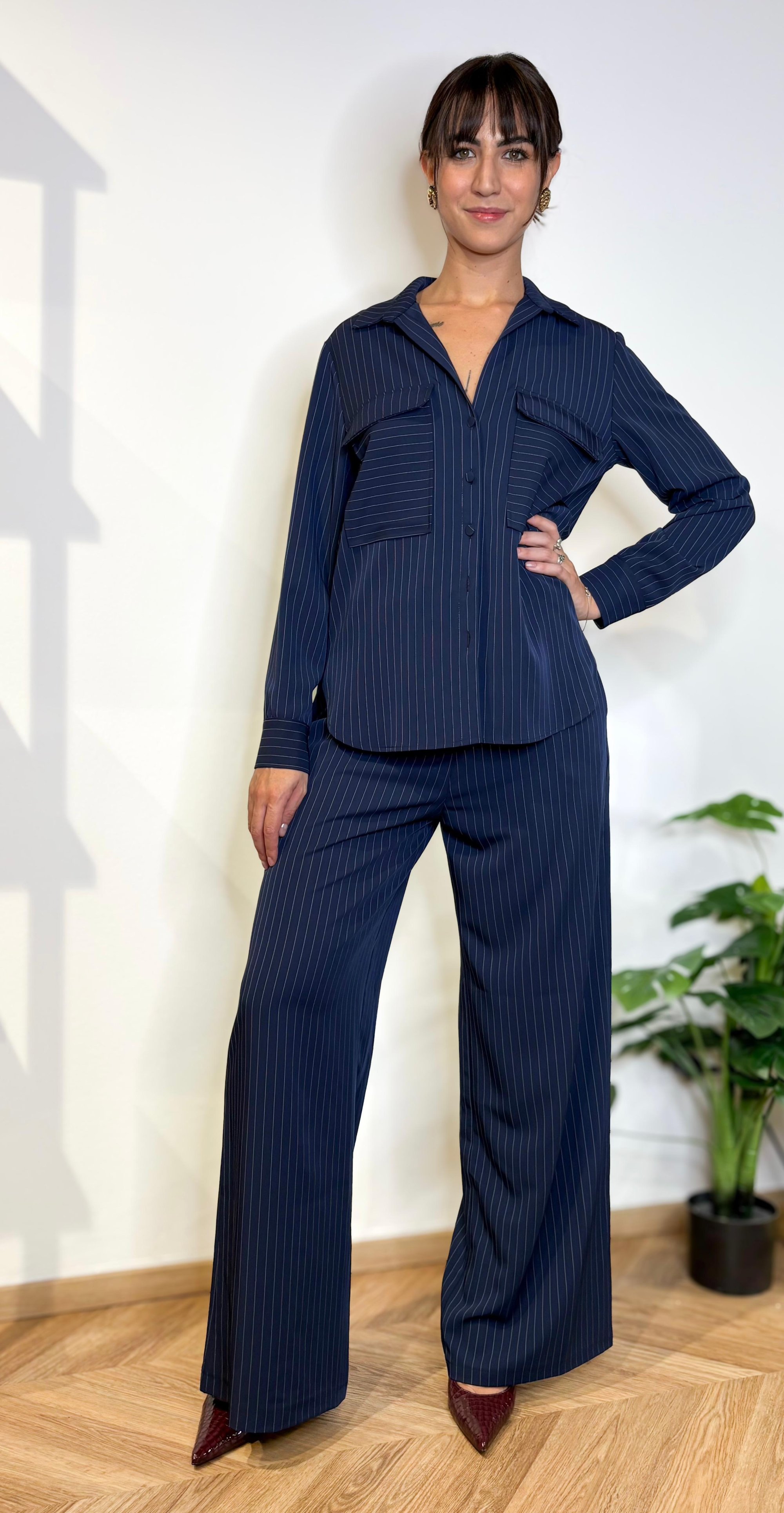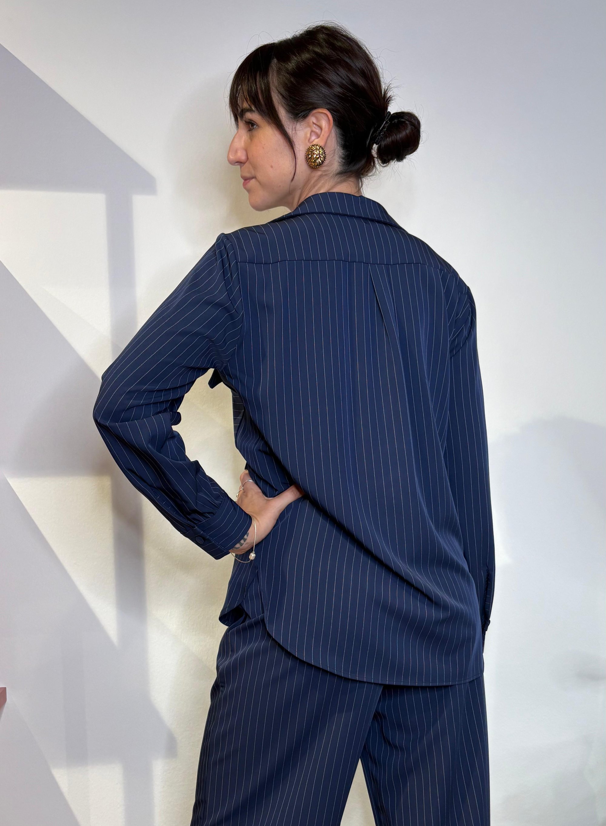 Questa camicia gessata blu navy è il pezzo chiave del completo power suit: fluida, leggera, con tasche frontali oversize e bottoni tono su tono.