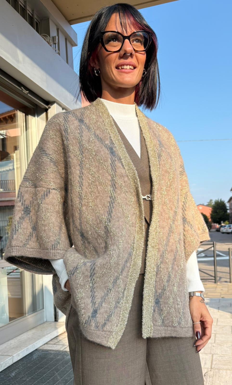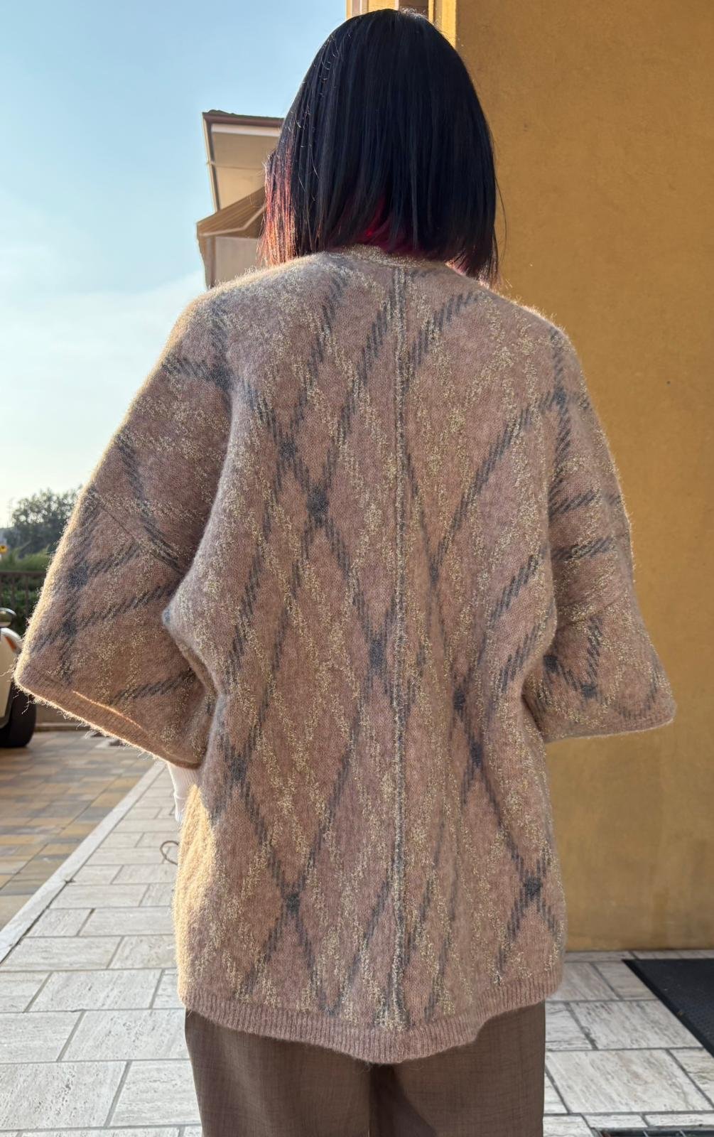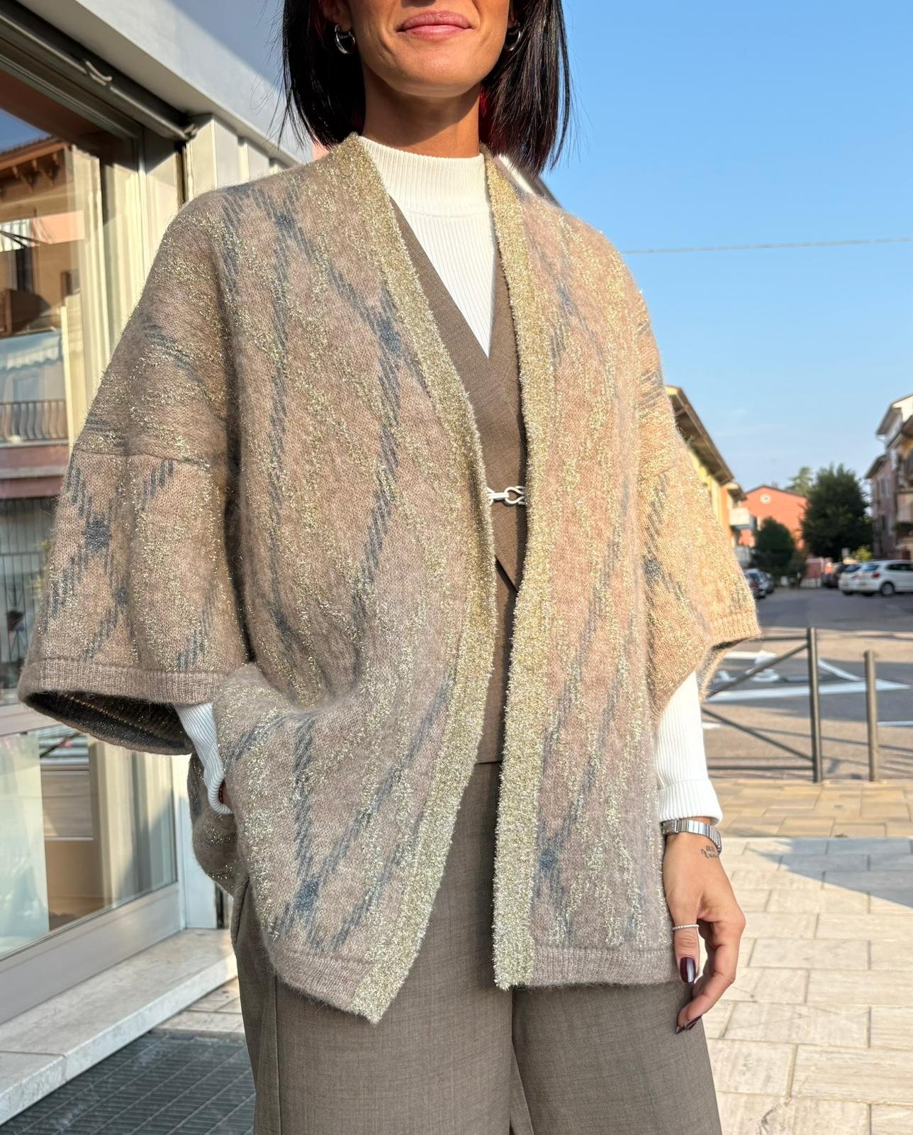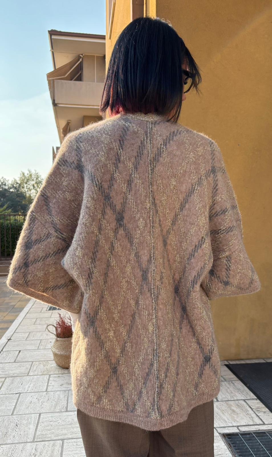 La trama jacquard a rombi si intreccia con sottili fili metallici che donano riflessi dorati, discreti ma preziosi.