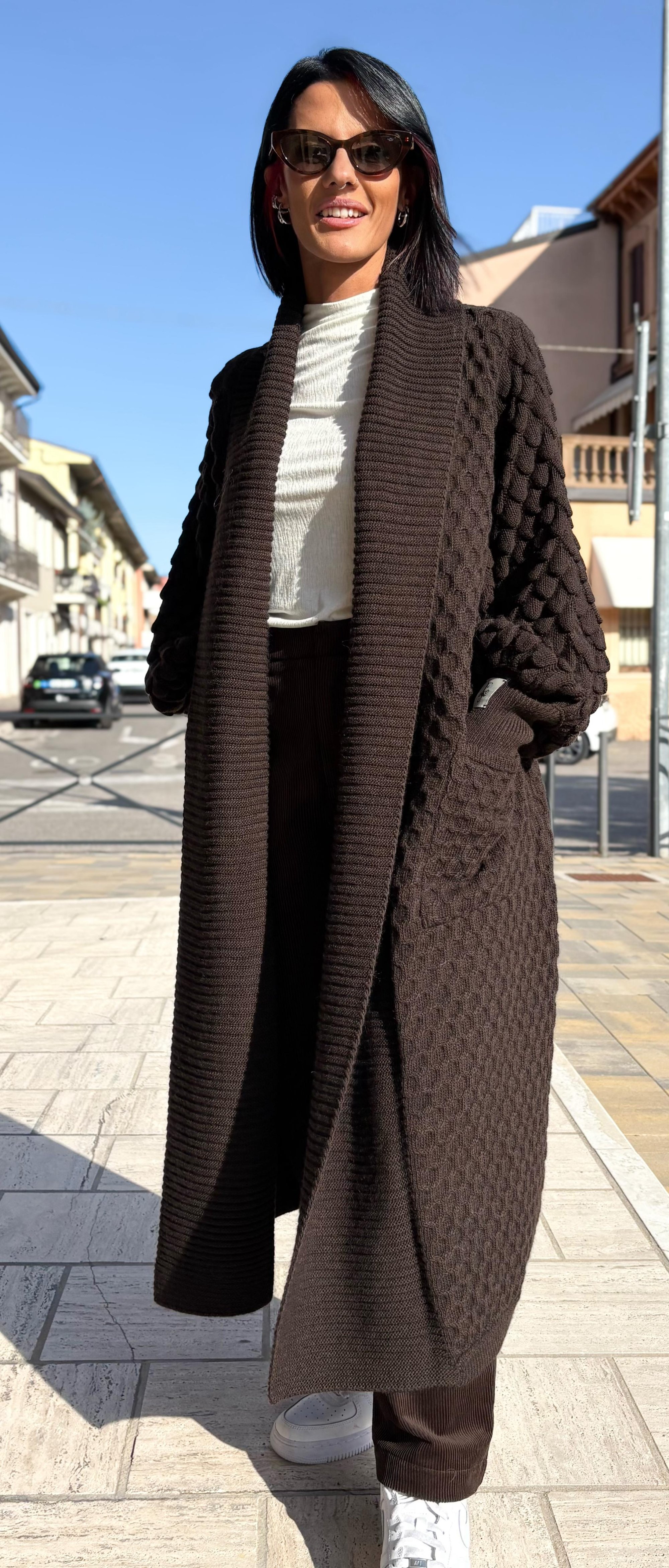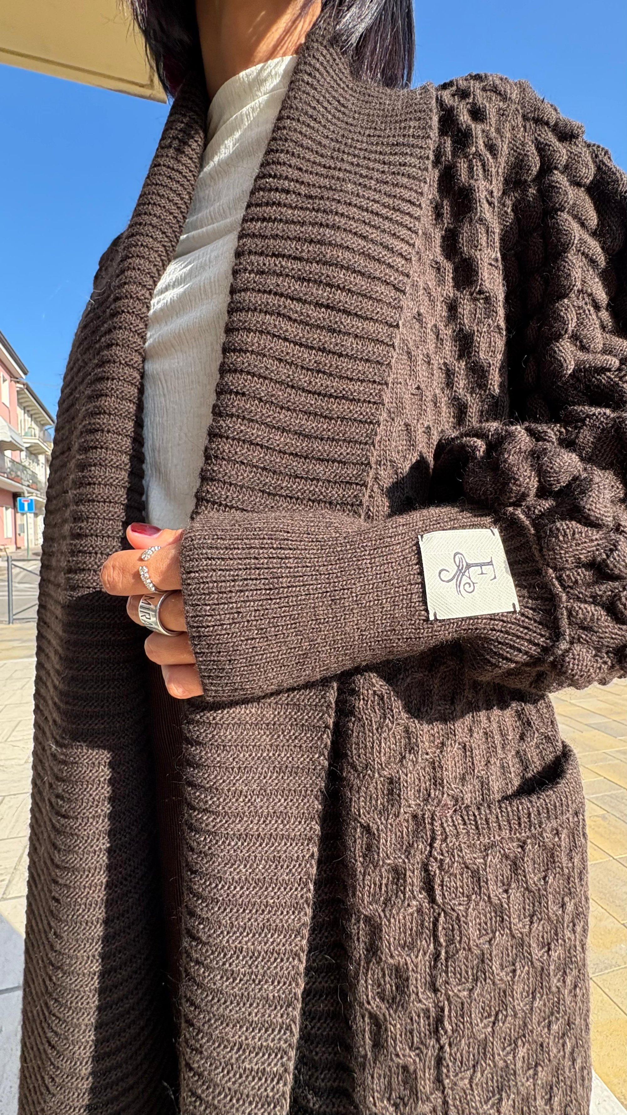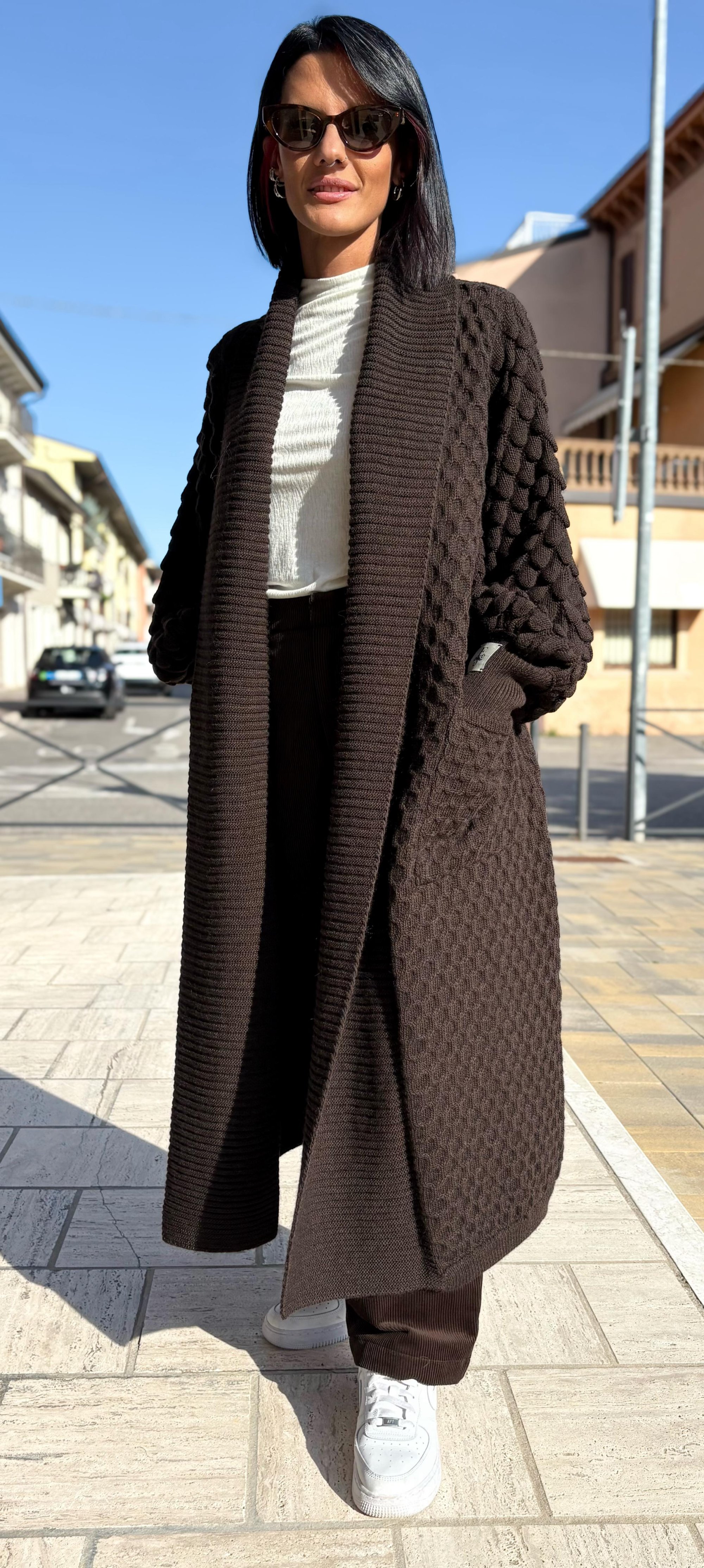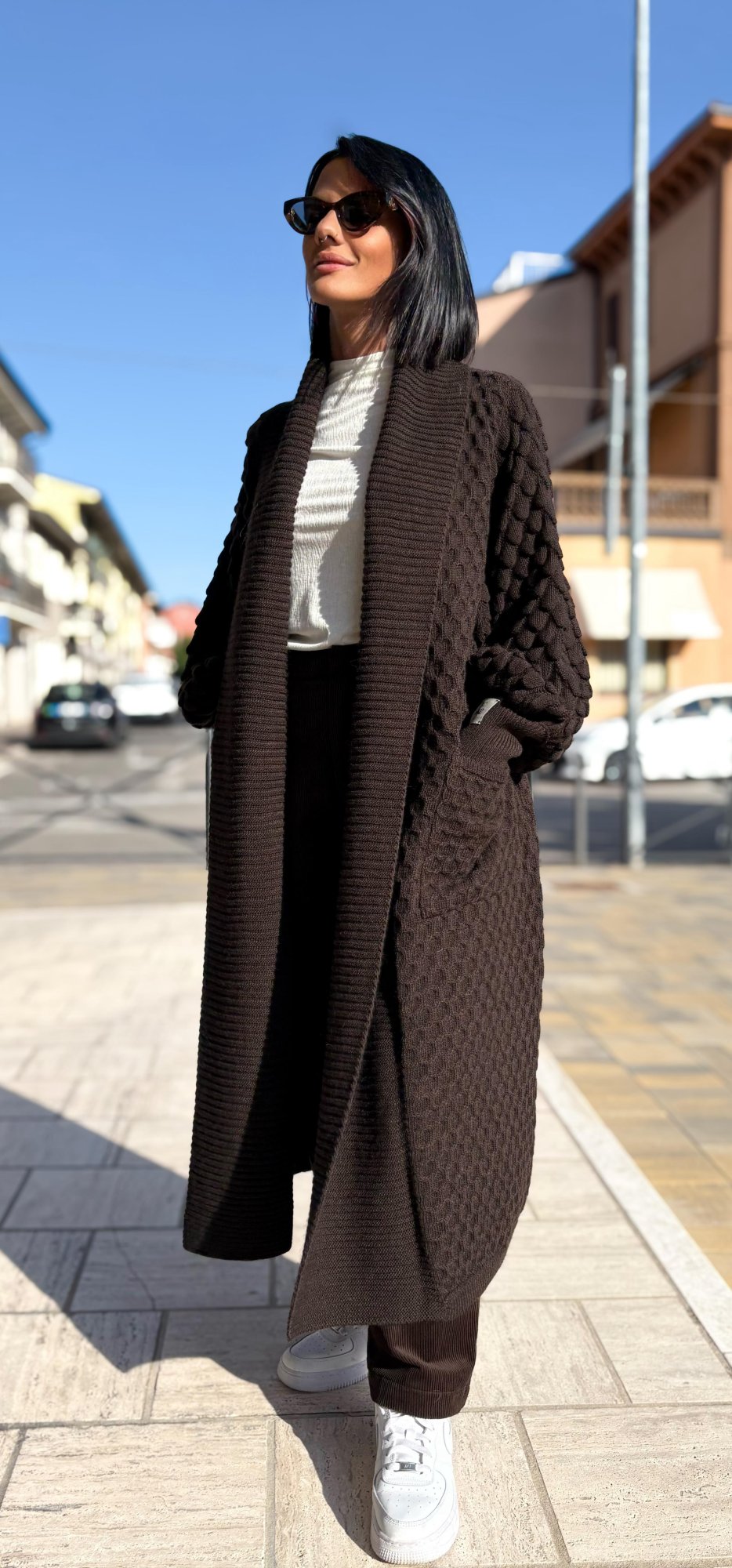 Un capo che non passa inosservato: il cardigan lungo Genevieve in tonalità cacao è il mix perfetto tra eleganza e carattere. Realizzato con la maestria artigianale che contraddistingue The Extreme Collection, avvolge la silhouette con morbidezza e dona quel tocco sofisticato che eleva anche il look più semplice.