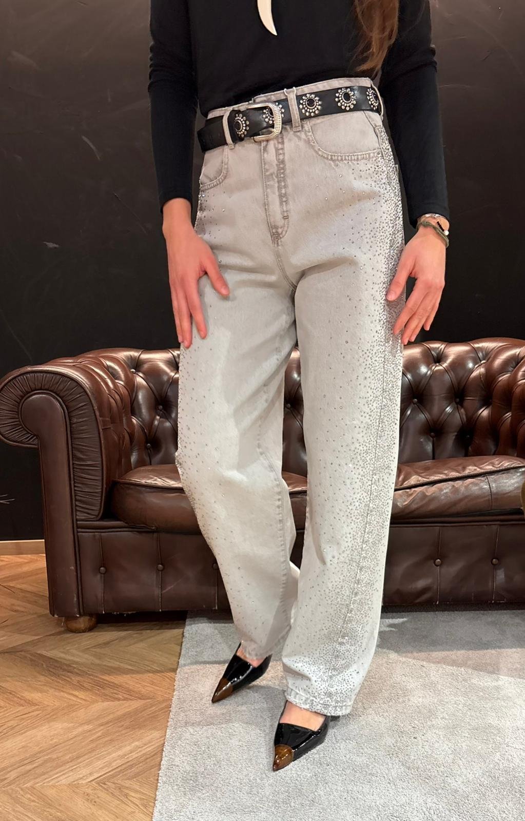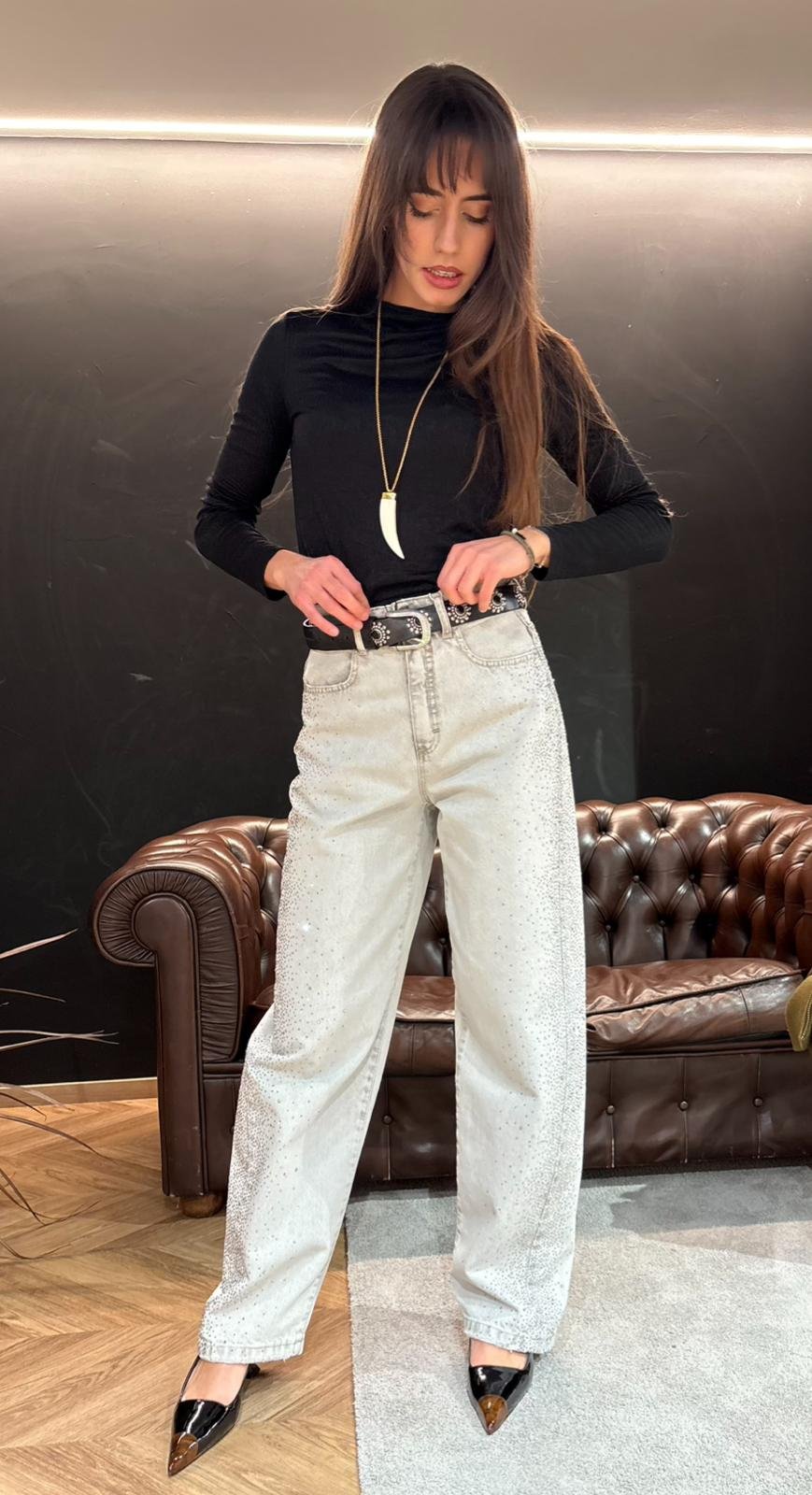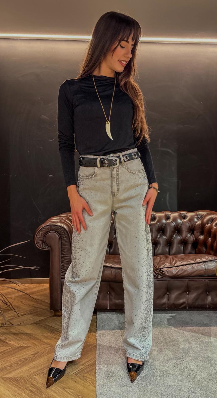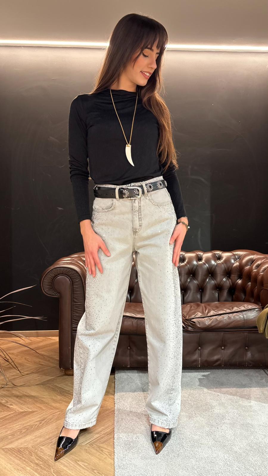 Il lavaggio grigio chiaro incontra la luce degli strass applicati lungo tutta la gamba, trasformando un jeans in un vero pezzo da collezione. Linea morbida, gamba dritta e fit confortevole per accompagnarti sia di giorno con una sneakers minimal, sia di sera con un tacco o un texano per un effetto glam immediato.