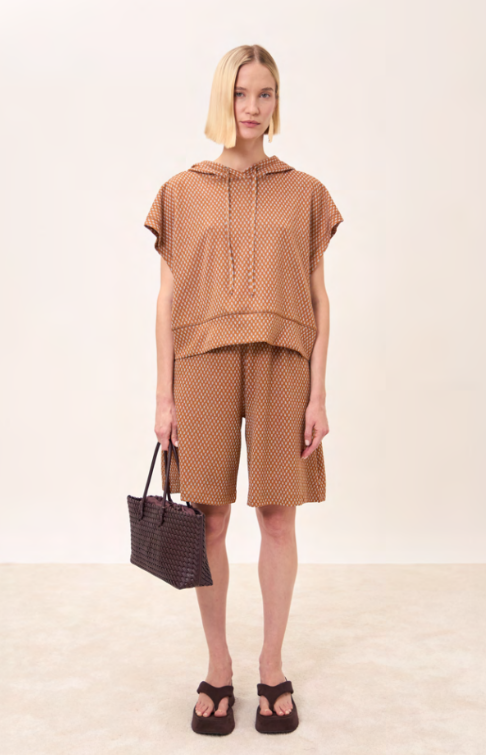 La linea è morbida con manica corta e cappuccio, ideale per la mezza stagione o per creare layering moderni. Il taglio è pulito, contemporaneo, e cade bene sul corpo senza risultare pesante.