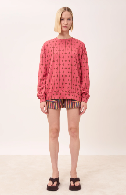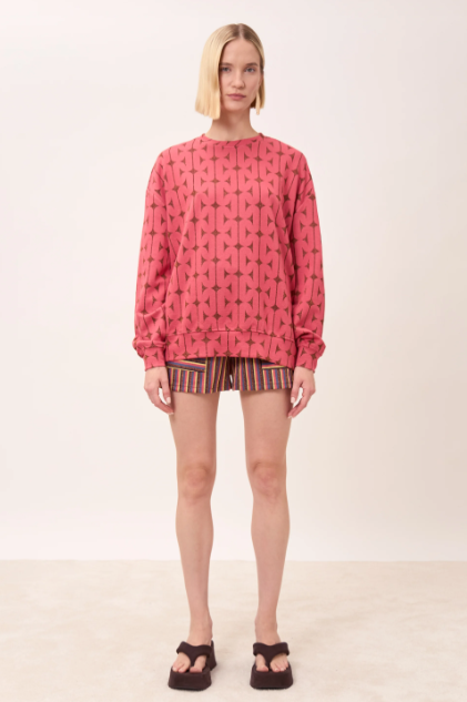 La maglia Melodie di Luce Studio in tonalità corallo si distingue per la lavorazione jacquard con motivo a catena, che crea un effetto grafico raffinato e contemporaneo.