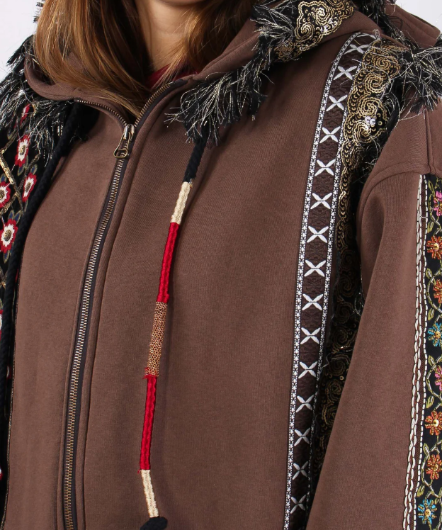 In tessuto caldo e morbido, con zip frontale, cappuccio e una lavorazione ricamata che corre lungo maniche e schiena: passamaneria, frange, inserti multicolor e applicazioni rifinite a mano.