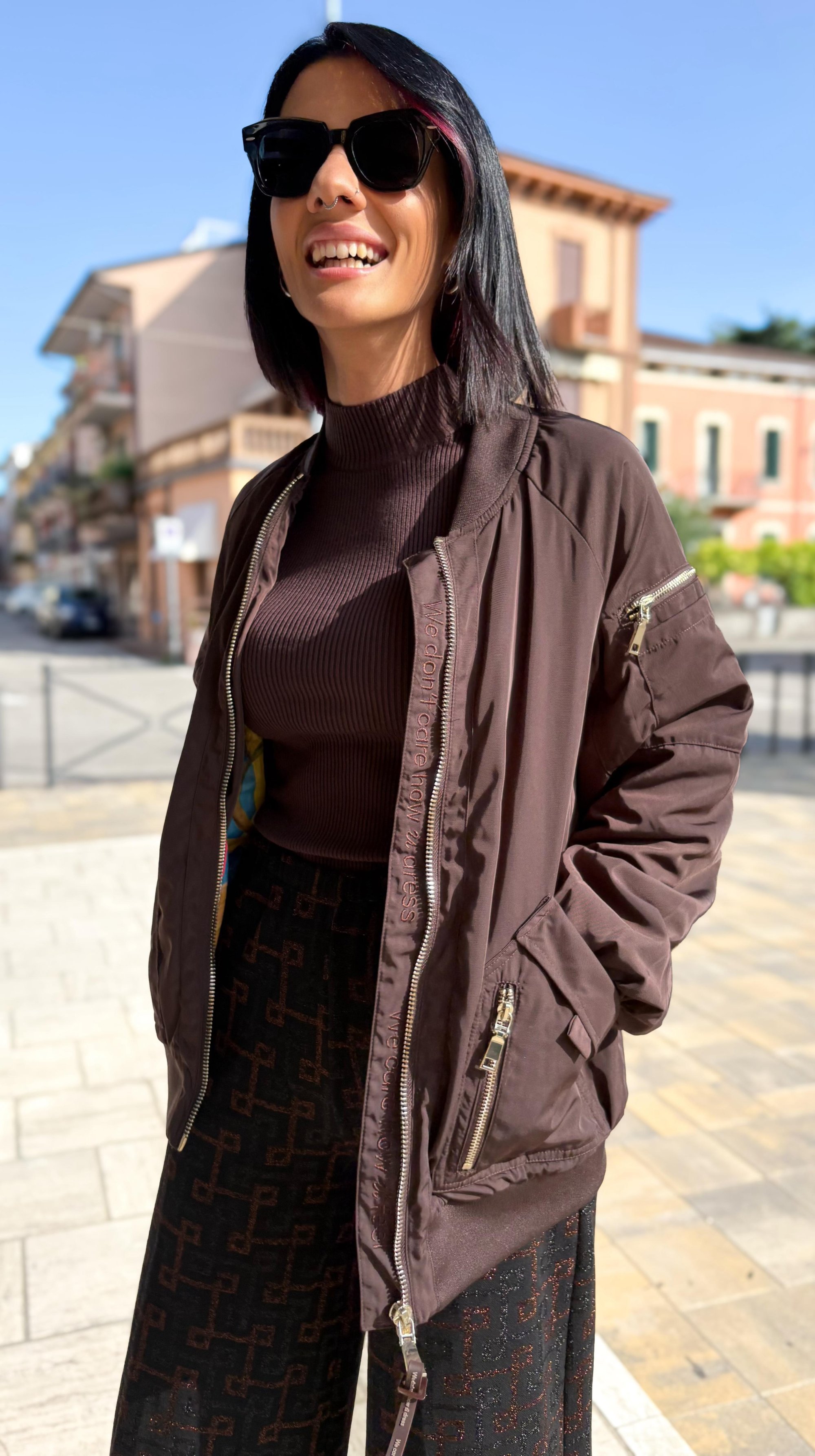 Il suo design pulito, con zip frontale e linee morbide, la rende un capospalla versatile da indossare sopra ogni look, dal denim al vestito più femminile. La nuance Black Coffee aggiunge quel tocco sofisticato e contemporaneo, perfetto per la mezza stagione.