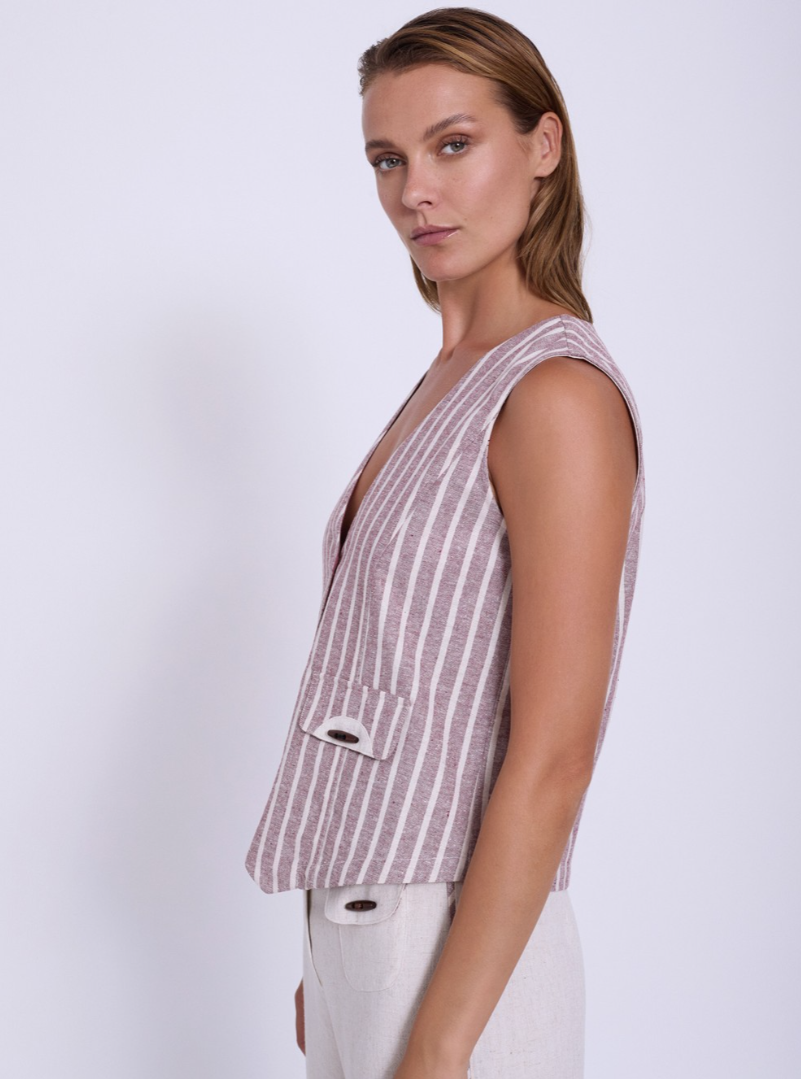Gilet su misura in tessuto a righe di lino e cotone. Scollo a V. Tasche con patta a contrasto e bottoni in legno. Rifiniture a contrasto all'interno.
