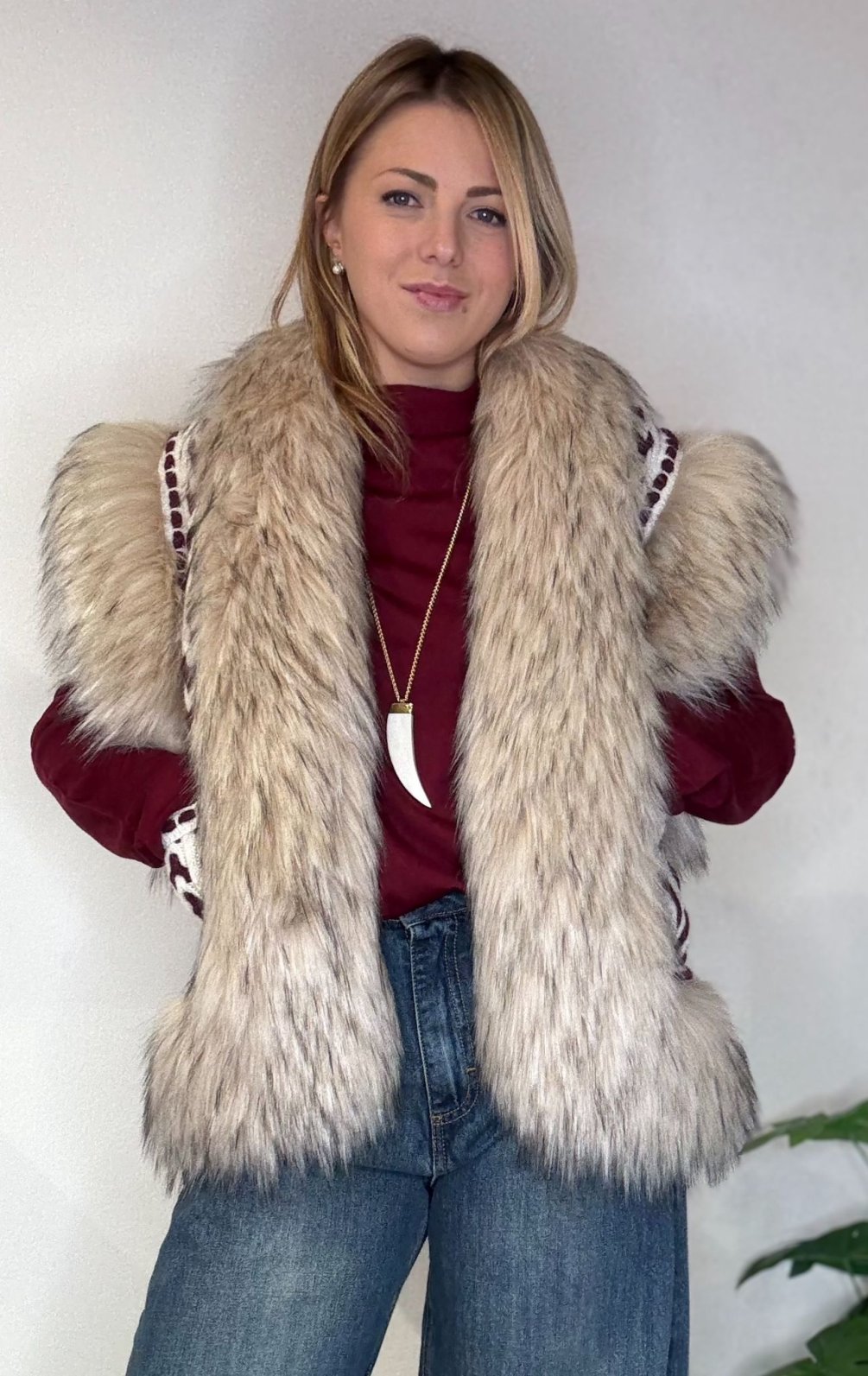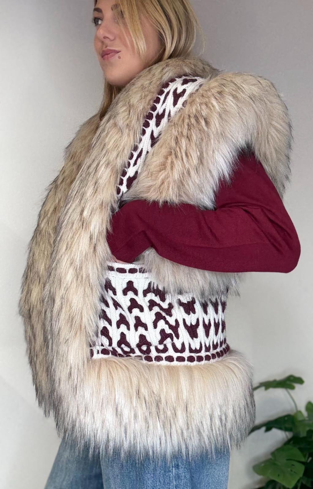 Il gilet Nicolette è un capo che parla di carattere ed eleganza allo stesso tempo. La sua texture bicolor in tonalità marfil, impreziosita da dettagli in pelliccia, crea un gioco di contrasti sofisticato e scenografico.