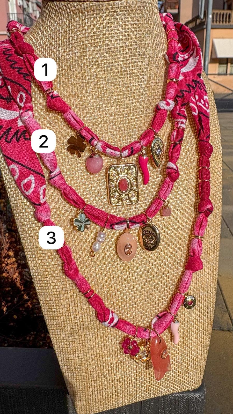 ogni collana è unica → combinazioni sempre diverse di charms e tessuti.
