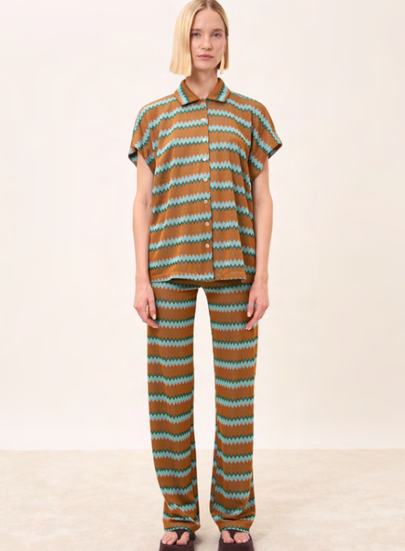 La fantasia grafica ispirata ai motivi geometrici dona carattere all’outfit, rendendola ideale in coordinato con il suo pantalone oppure spezzata con denim o tinta unita per un look più easy.