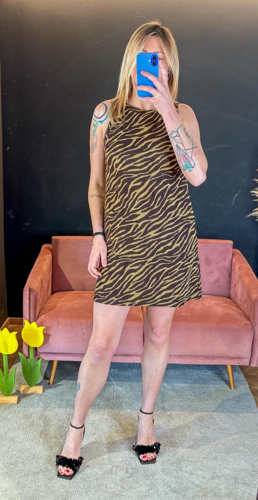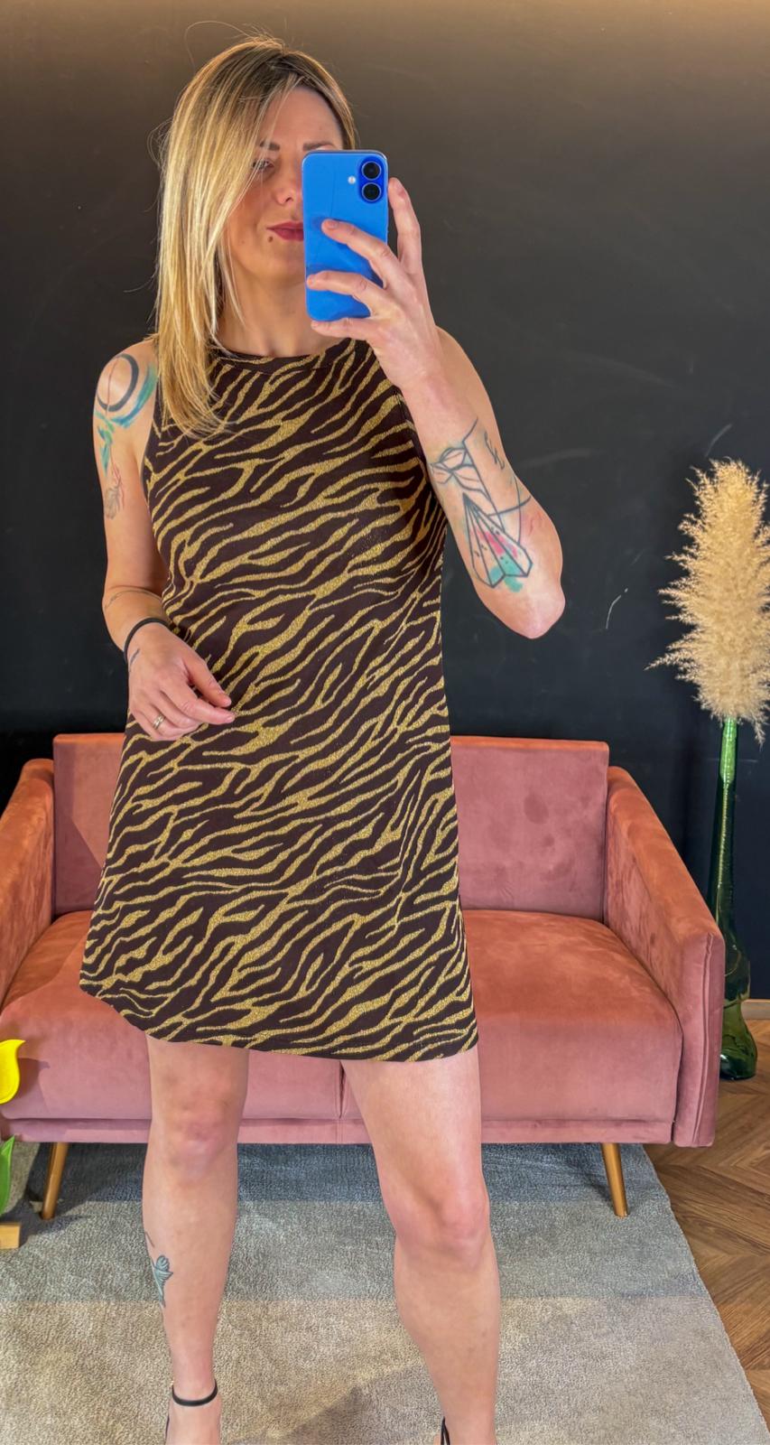 Il tessuto jacquard con fantasia zebrata nei toni del marrone, arricchito da un leggero filo metallizzato, crea un effetto luminoso ma sofisticato, perfetto sia per il giorno che per la sera.