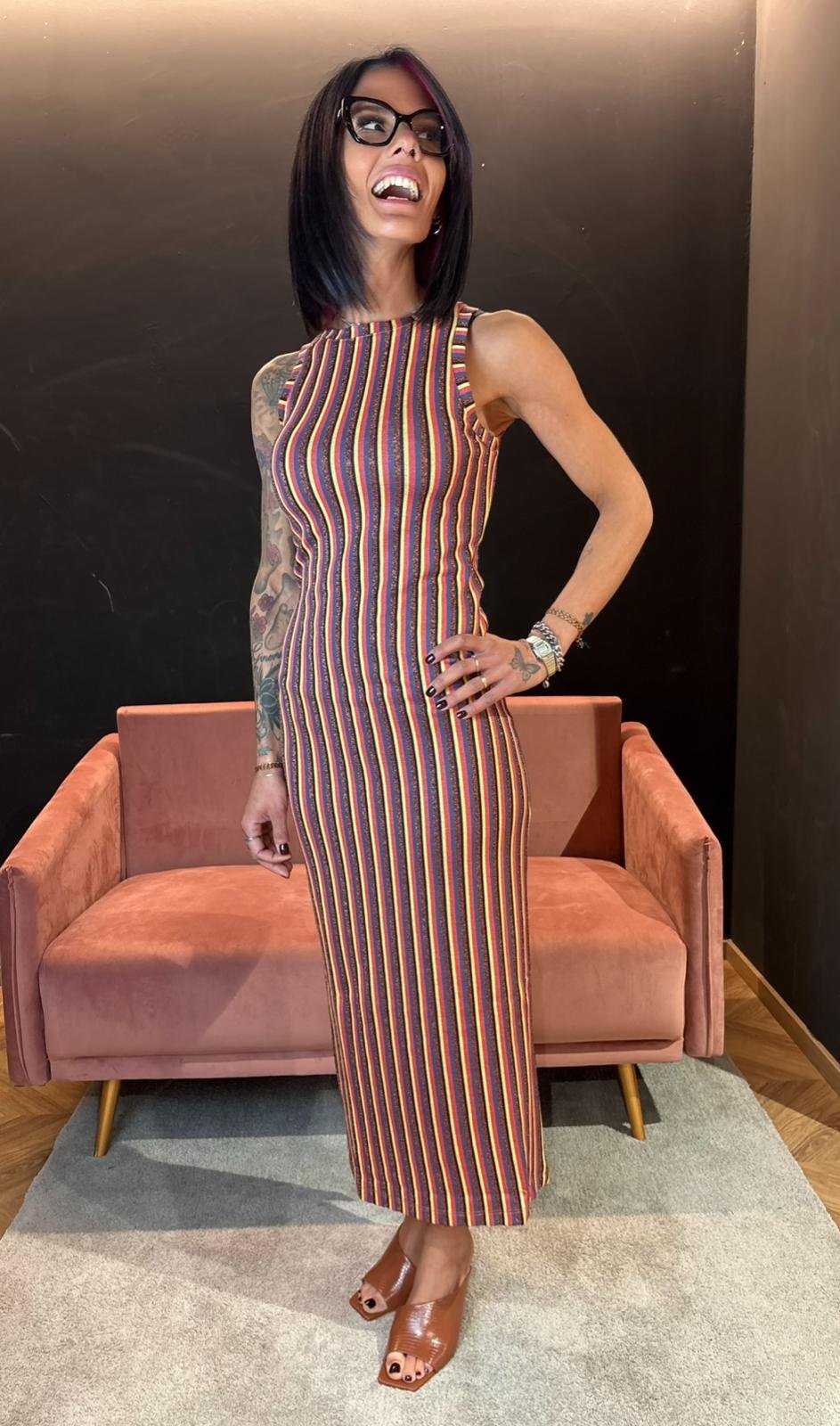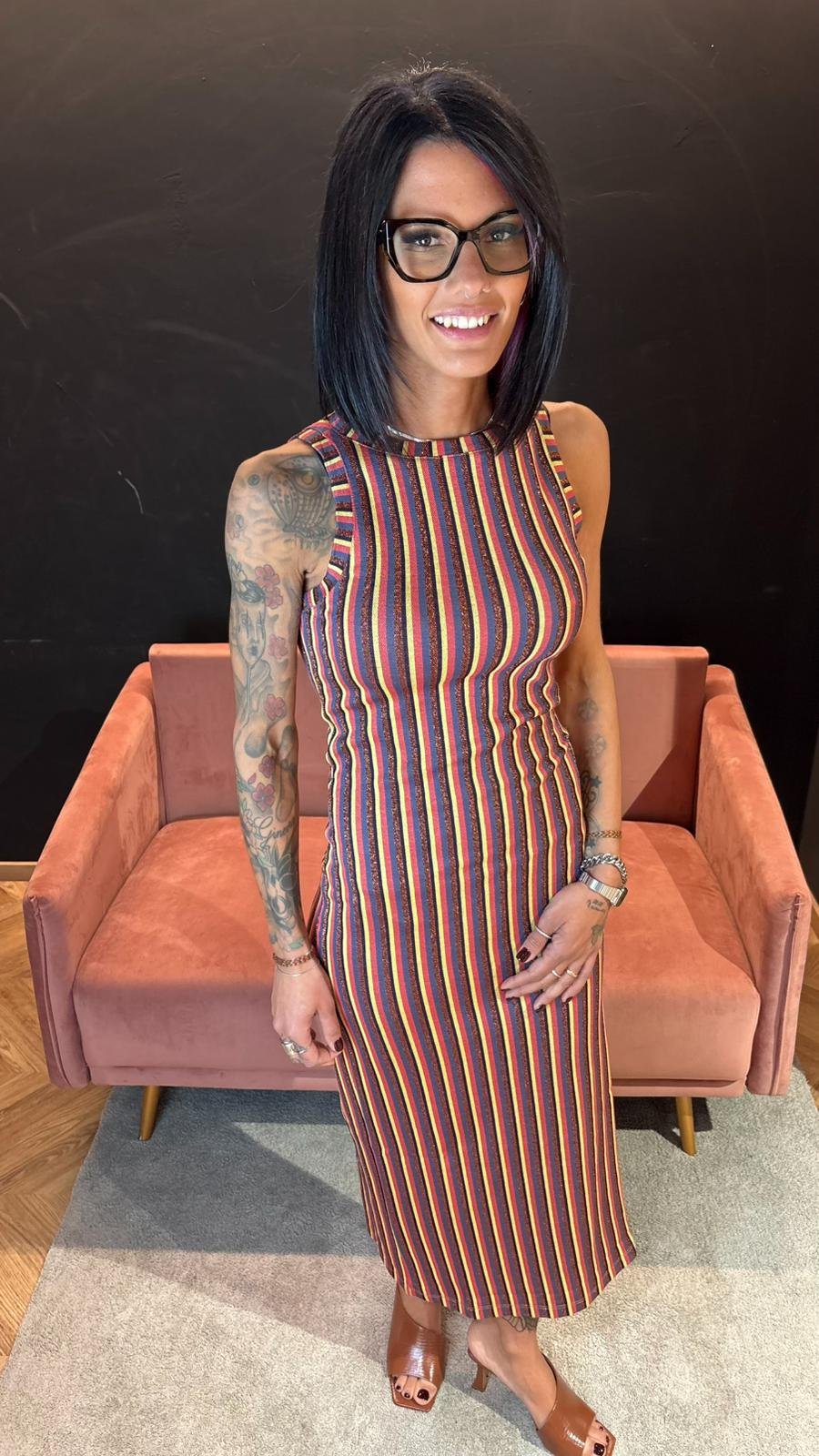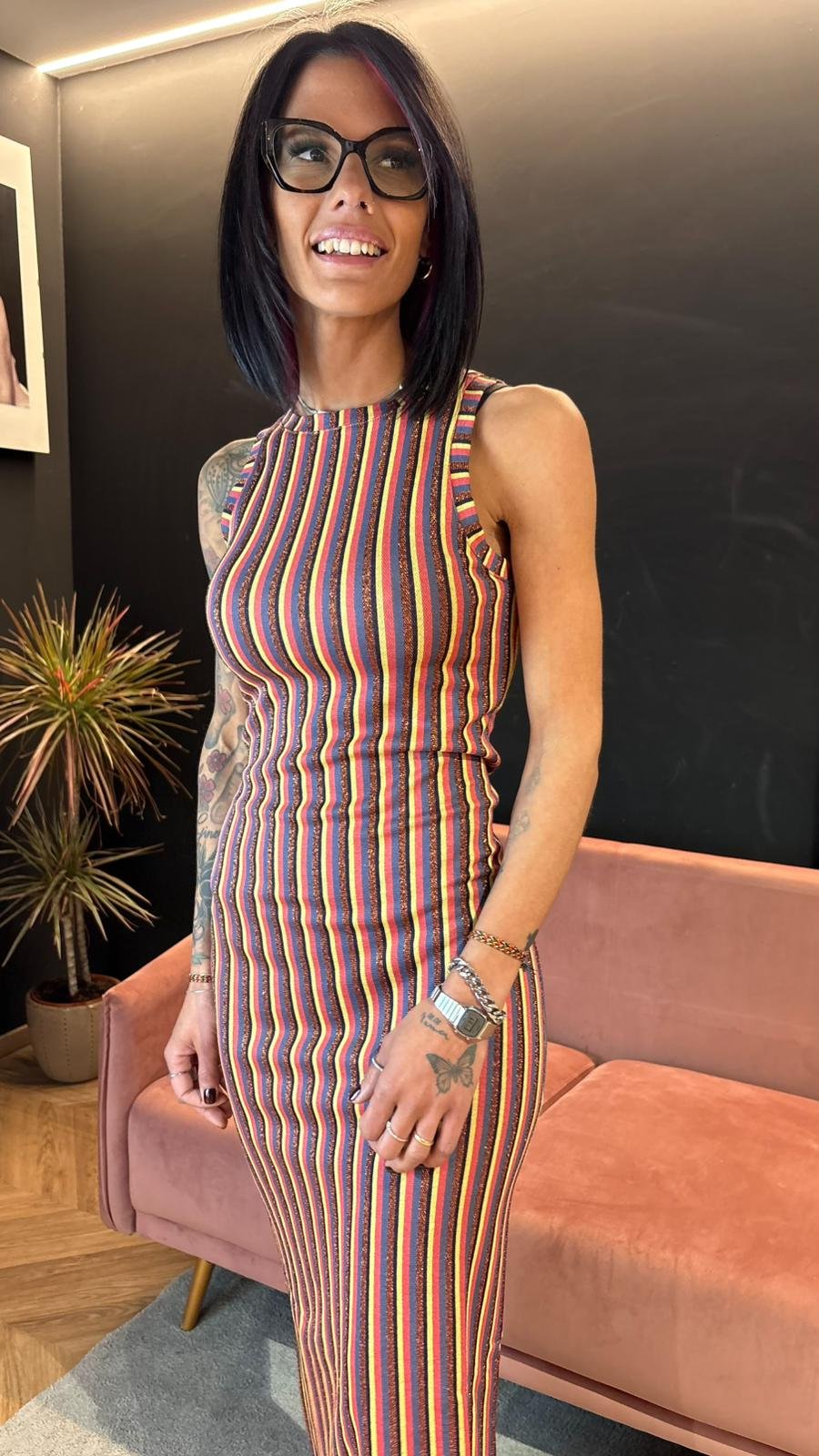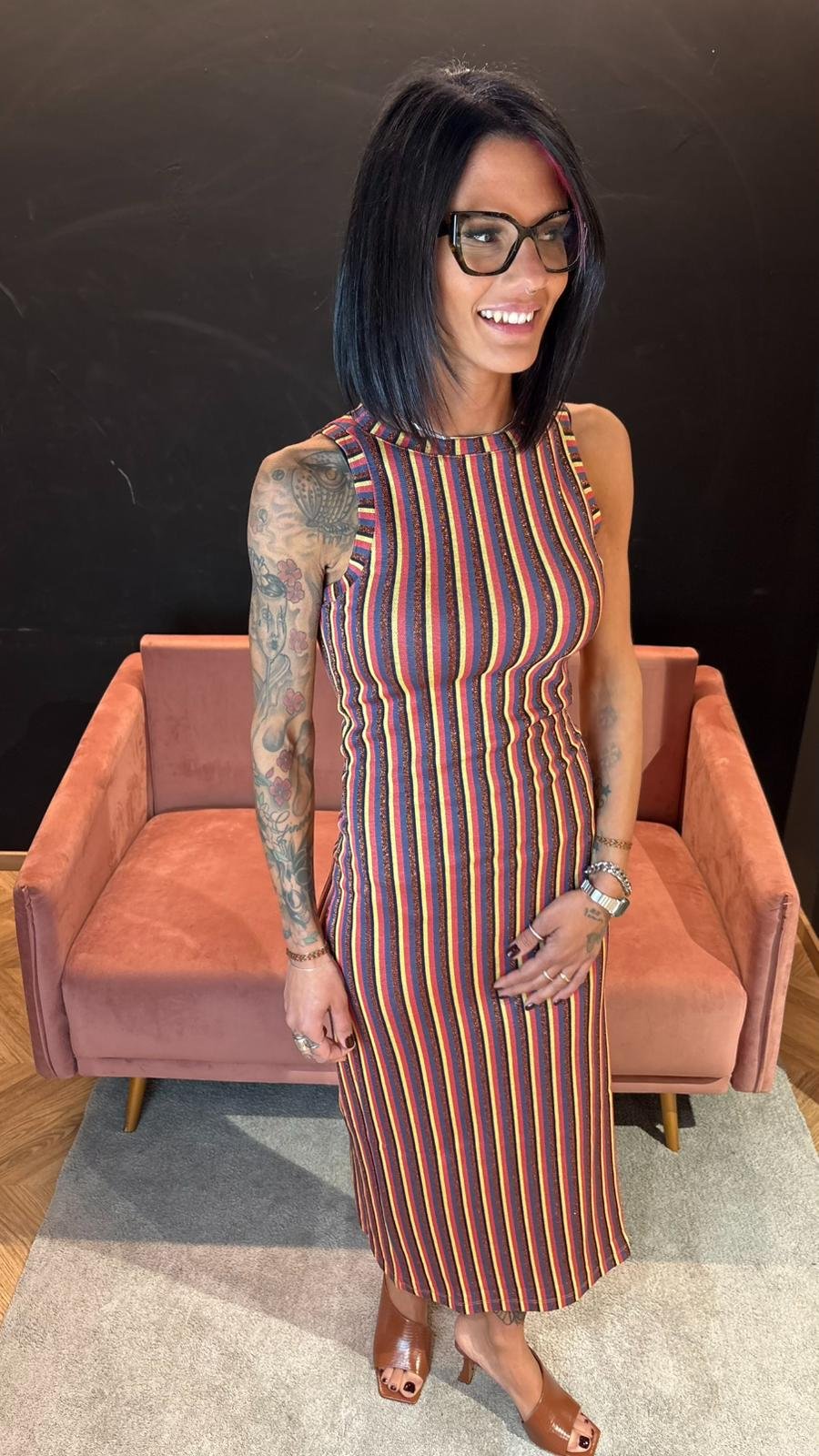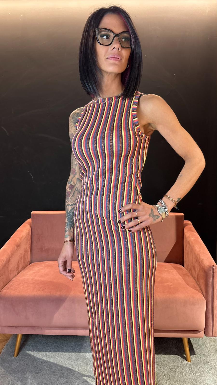 Le righe verticali multicolor, impreziosite da fili metallizzati, catturano la luce in modo elegante e slanciano la silhouette. La linea aderente segue le forme senza costringere, grazie alla morbidezza della viscosa elasticizzata che garantisce comfort e vestibilità.