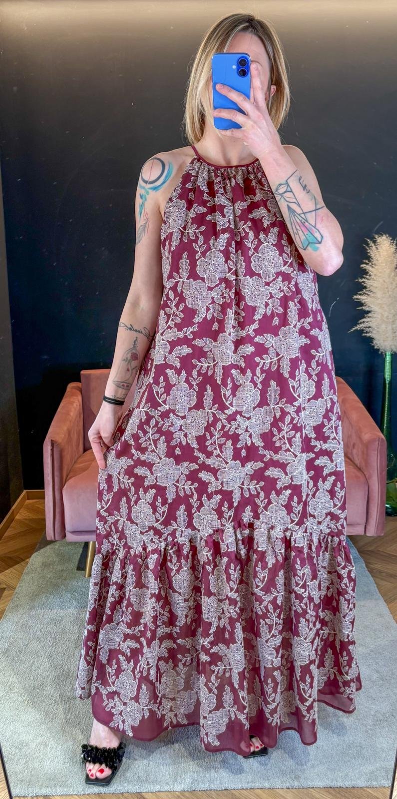 Realizzato in cotone, è impreziosito da un ricamo floreale delicato nei toni del bordeaux e del nude, che crea un effetto raffinato e materico. Non è una semplice stampa: è un tessuto lavorato che dona profondità e valore al capo.