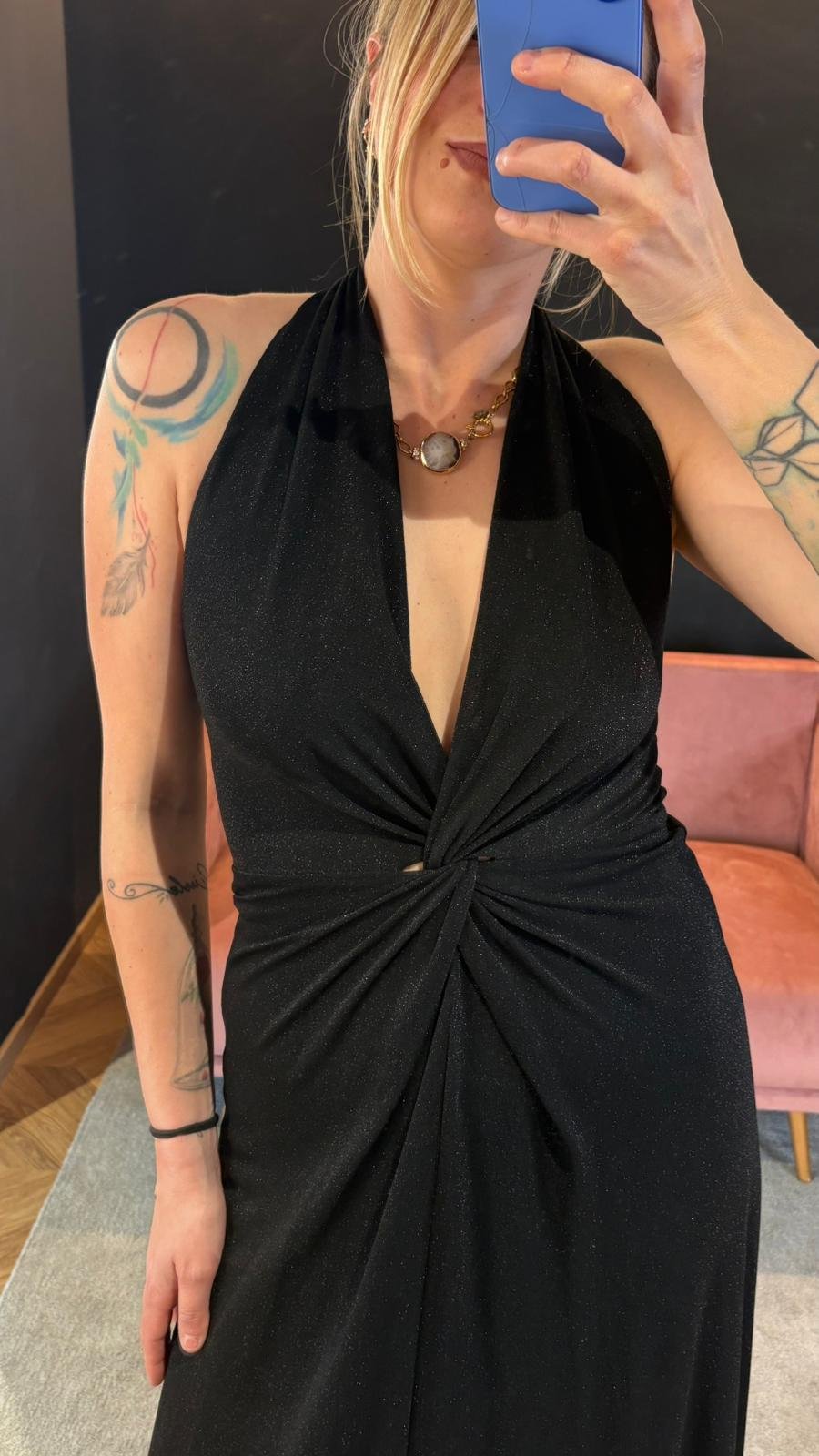 Scollo profondo sul davanti con nodo sotto il seno che crea un’arricciatura morbida e valorizza la figura senza segnare. La linea scivola sul corpo in modo naturale, accompagnando il movimento.