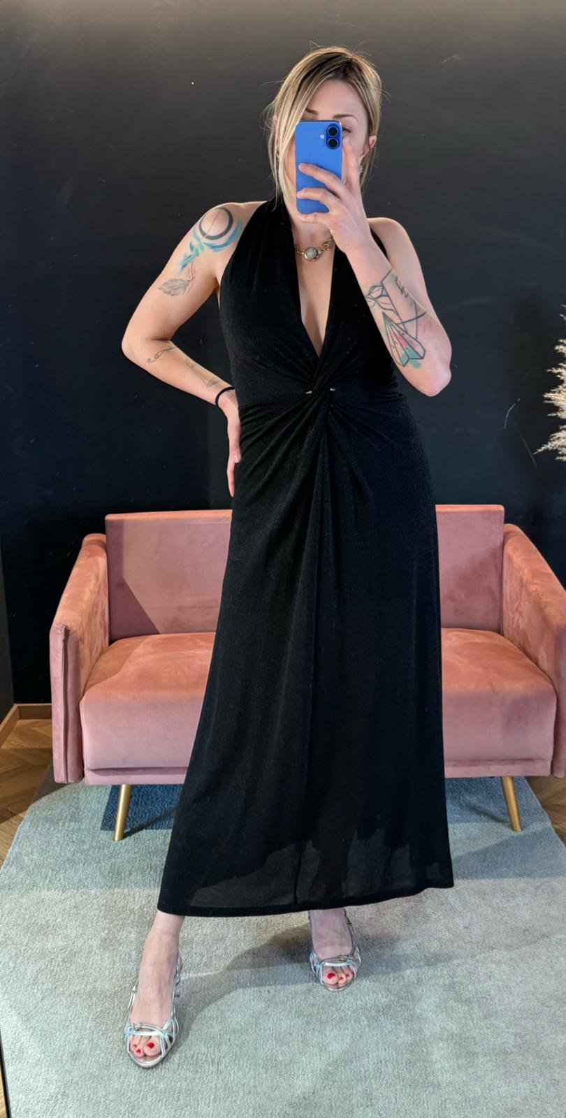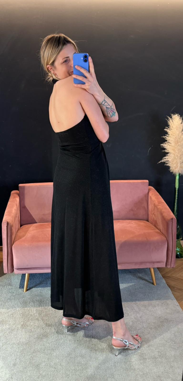 Abito lungo in lurex nero, fluido e leggero.