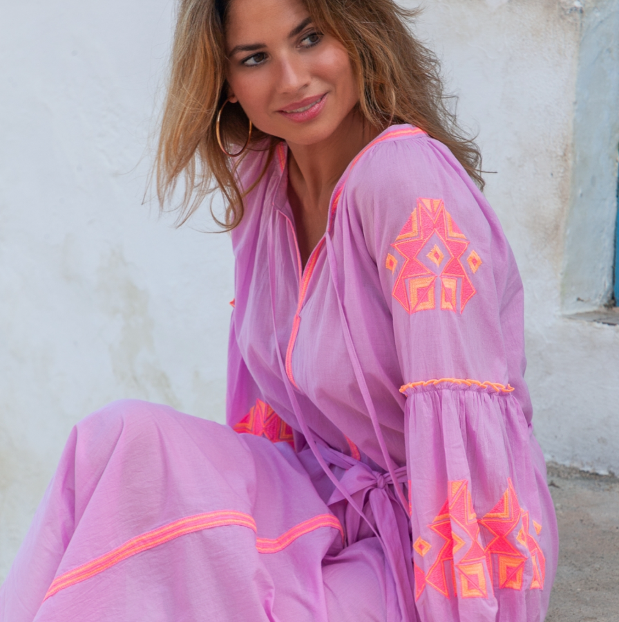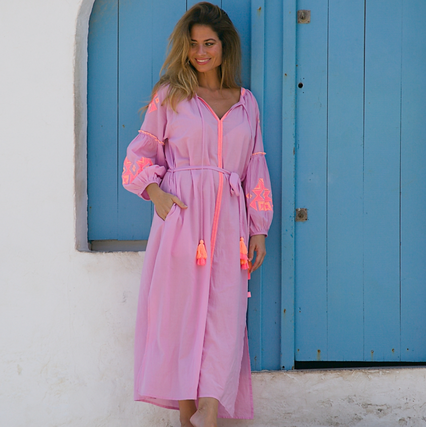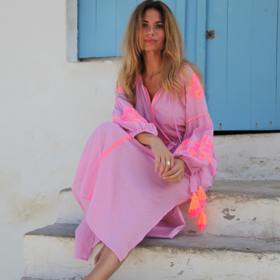 Abito Mini "Pipa" in Tessuto Leggero con Ricami Fluò e Nappe – Rosa