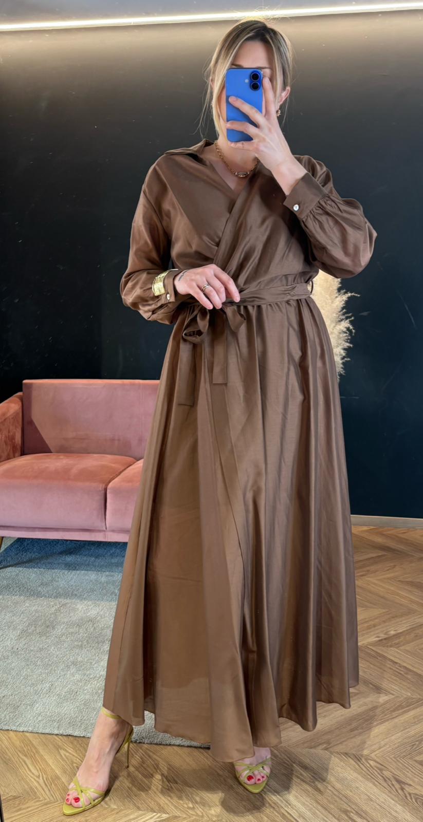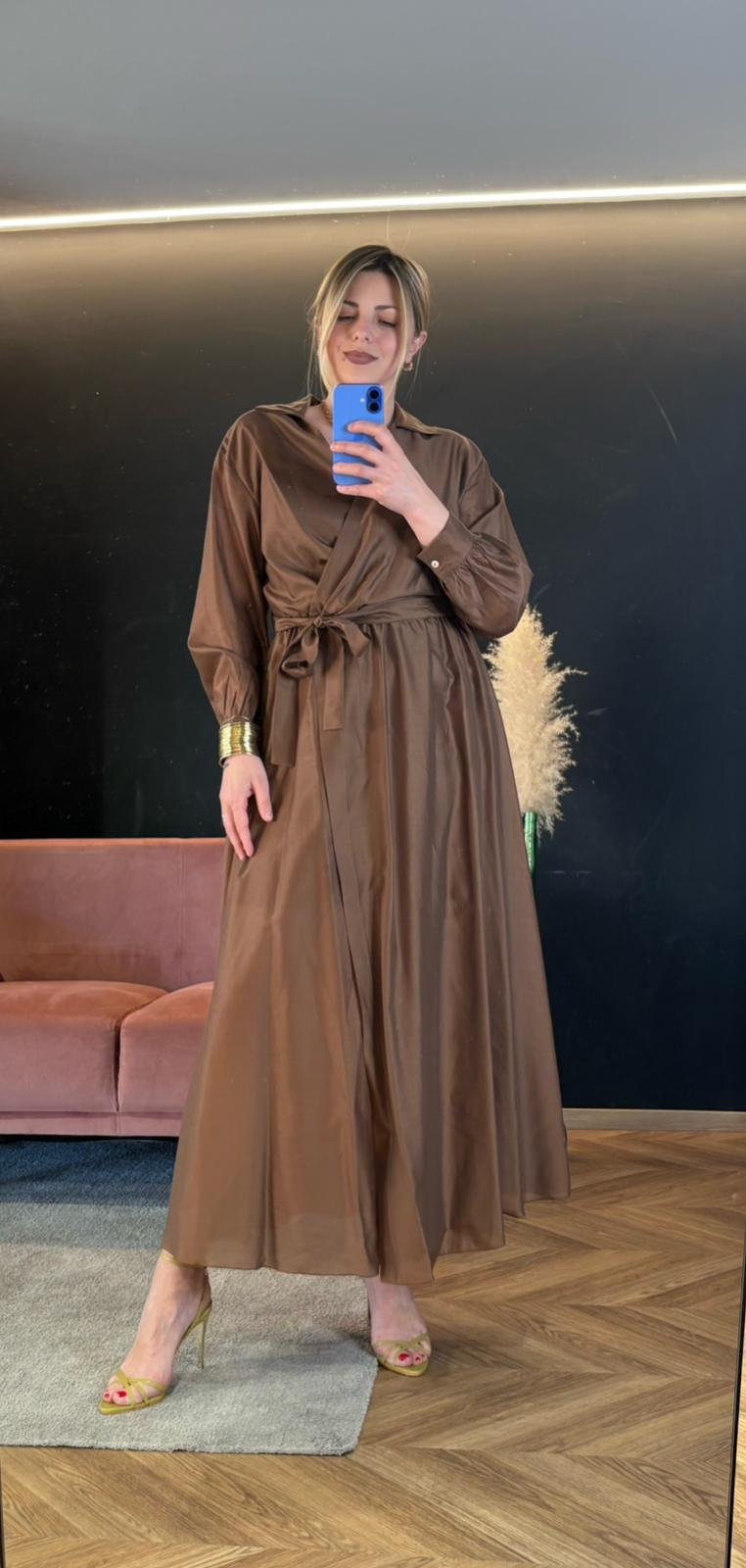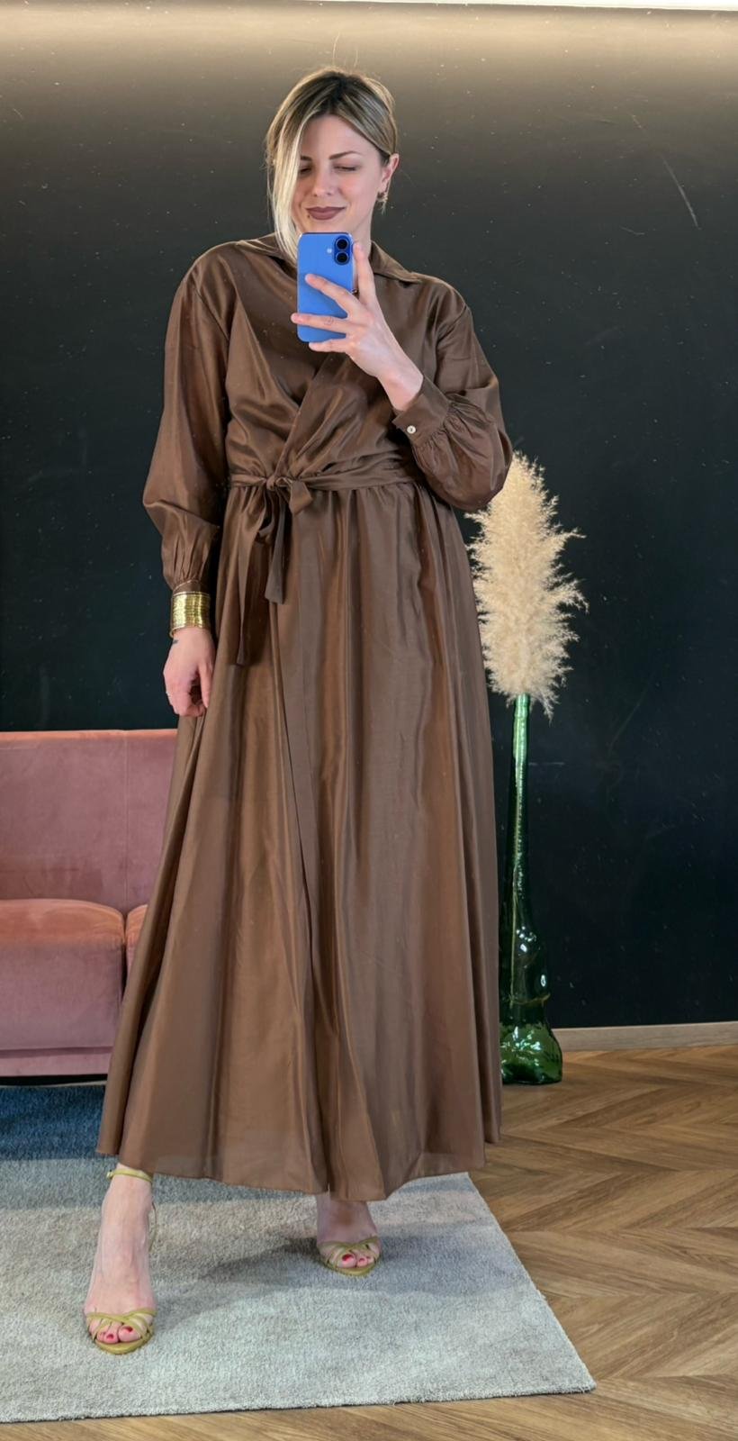 Il modello Monica è un chemisier lungo in questo color tabacco cioccolato pieno, caldo, super elegante senza essere impegnativo. È il classico capo che ti immagini subito per una cerimonia, un evento, qualcosa di curato ma non “troppo”.
