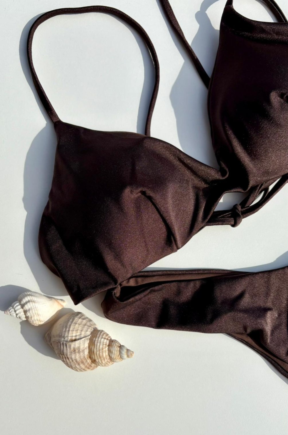 Realizzato in lycra lucida color marrone, riflette la luce con un effetto morbido e sofisticato, valorizzando l’abbronzatura e rendendolo perfetto sia al sole pieno che nelle ore più dorate della giornata.